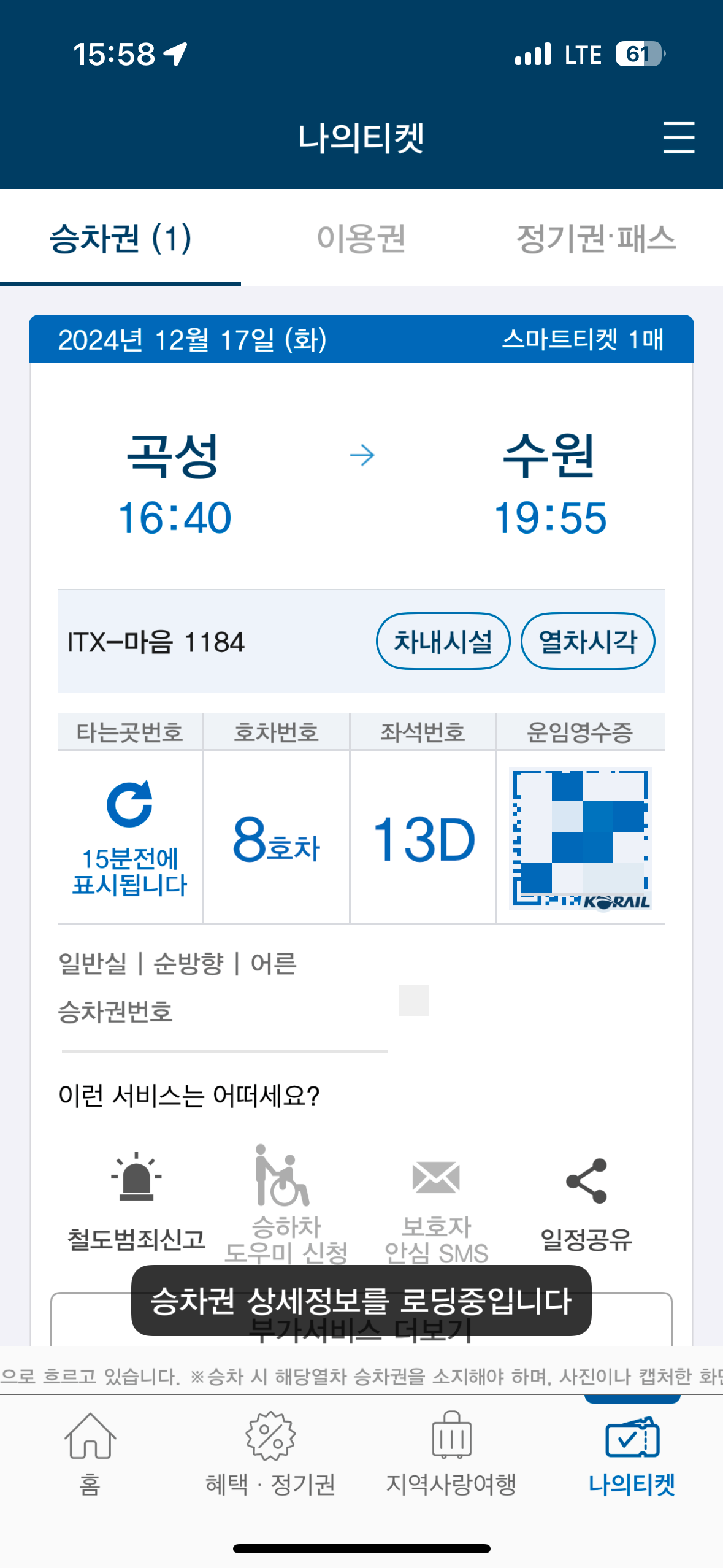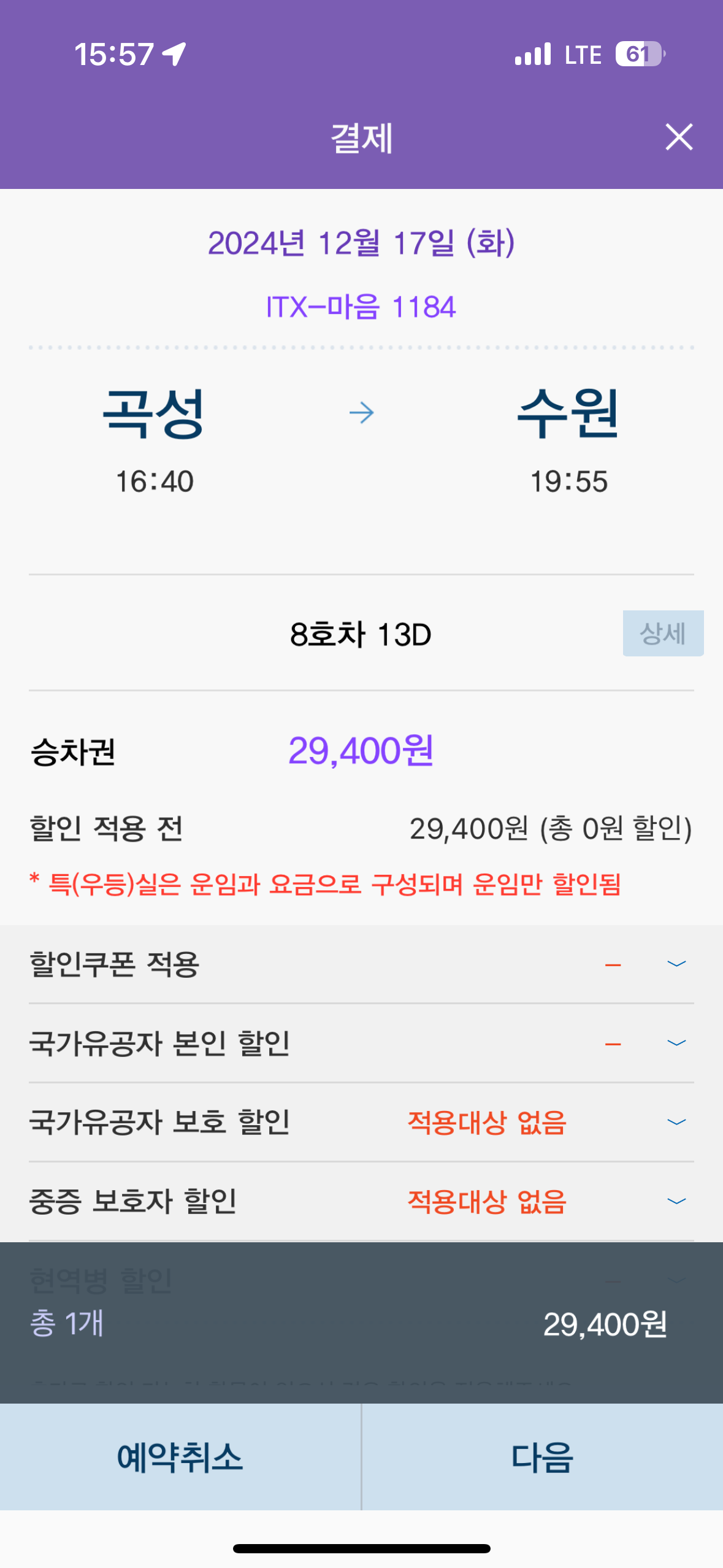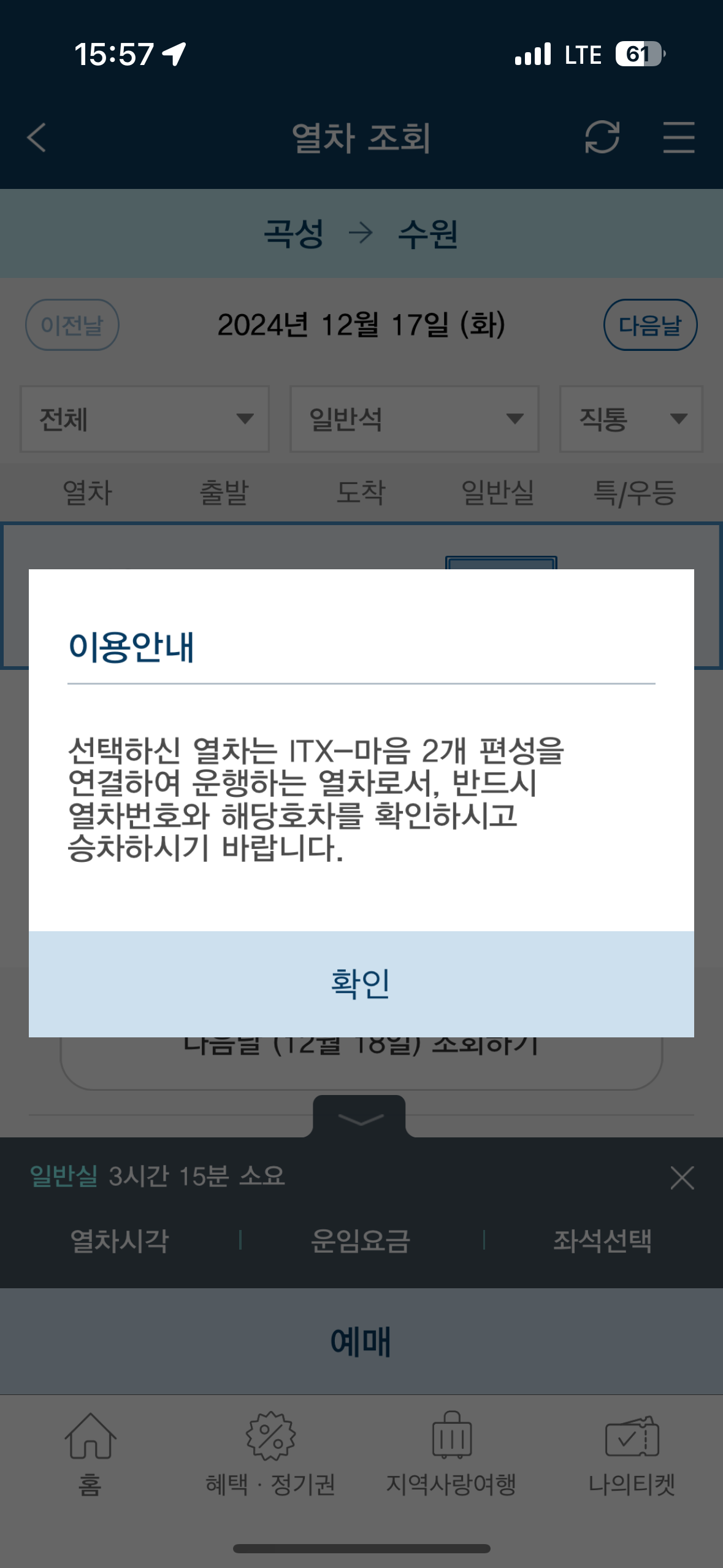 저는 16시 40분에 곡성에서 수원으로 가는 ITX 마음열차를 예매 했는데요. 바로 한달전에 탔던 동일 시간대 열차였습니다. 특히 ITX 마음 열차는 복합열차의 특징을 갖고 있는데요. 곡성에서 탑승 할 경우 익산역에서 호남선에서 오는 ITX 마음과 하나의 열차로 연결되어 복합열차로 운행됩니다. 사실 저 문구는 익산역 부터 탑승하는 승객들한테 필요한데요. 간혹 복합열차인데 잘못 탑승하는 경우가 있나봅니다.