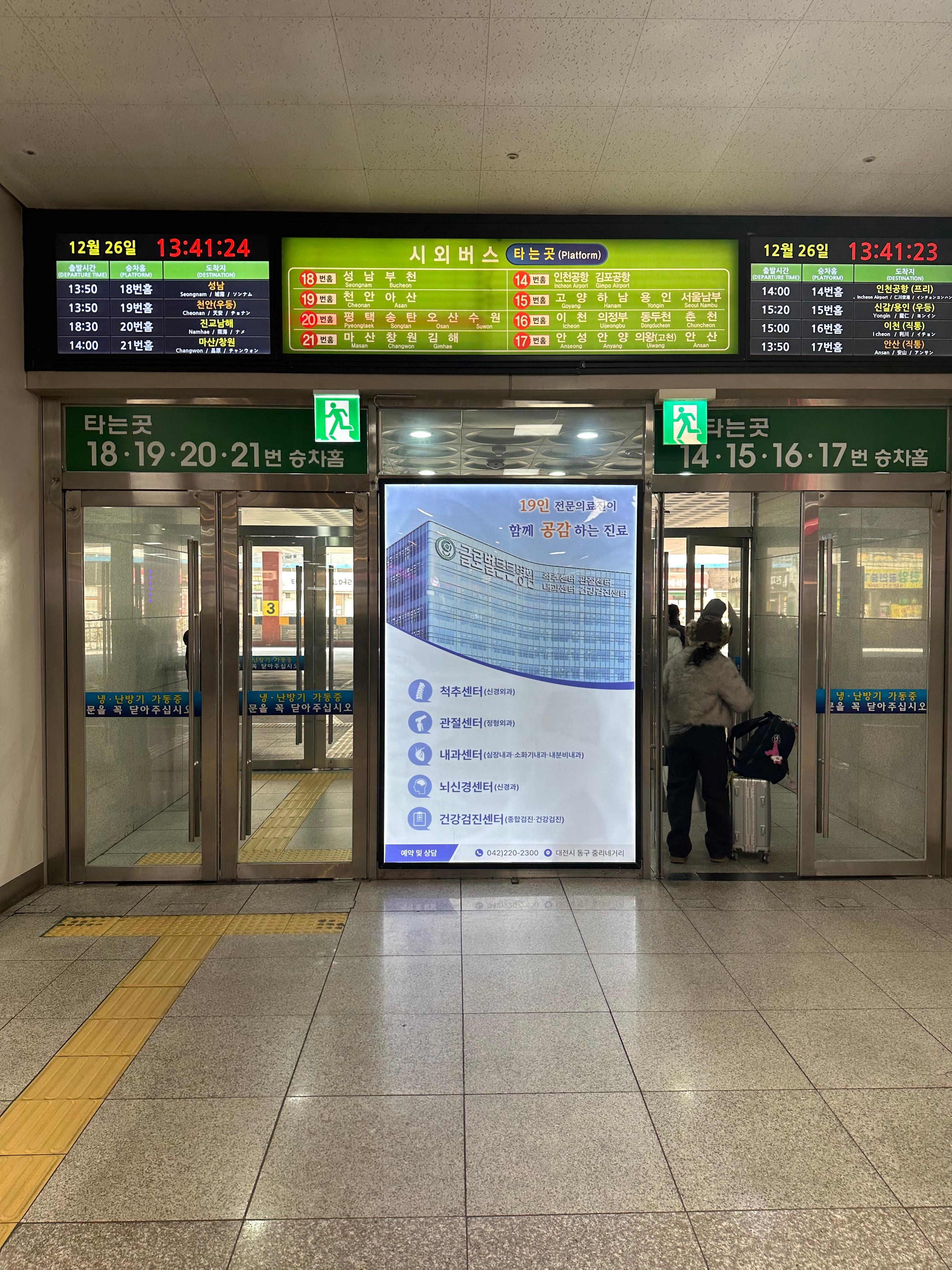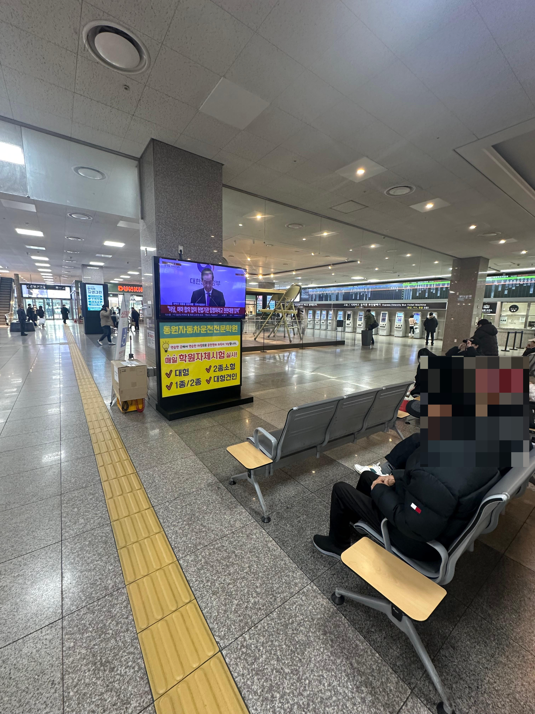 대전복합터미널 하차자 건물 1층에 있는 놀부 부대찌개에서 점심을 맛있게 먹고 다시 복합터미널 주변을 돌아보고 저는 승차장 건물 1층으로 들어왔습니다. 지난 2024년 12월에는 윤석열 대통령의 계엄령과 국회 탄핵까지 통과하면서 대통령대행체제로 갔는데요. 12월에 포항여부터 시작해서 기차역 대합실이나 버스터미널 대합실에서 혼란스러운 정국에 대한 방송이 여기저기서 터졌습니다. 정말 길고 길었는데요. 여야가 극렬하게 싸웠습니다. 몇년전에는 보이지 않았는데요. 대전복합터미널 대합실 한쪽에는 거인들이 앉을만한 대형 의자와 테이블 탁자가 보였는데요. 정말 크고 신기했습니다.