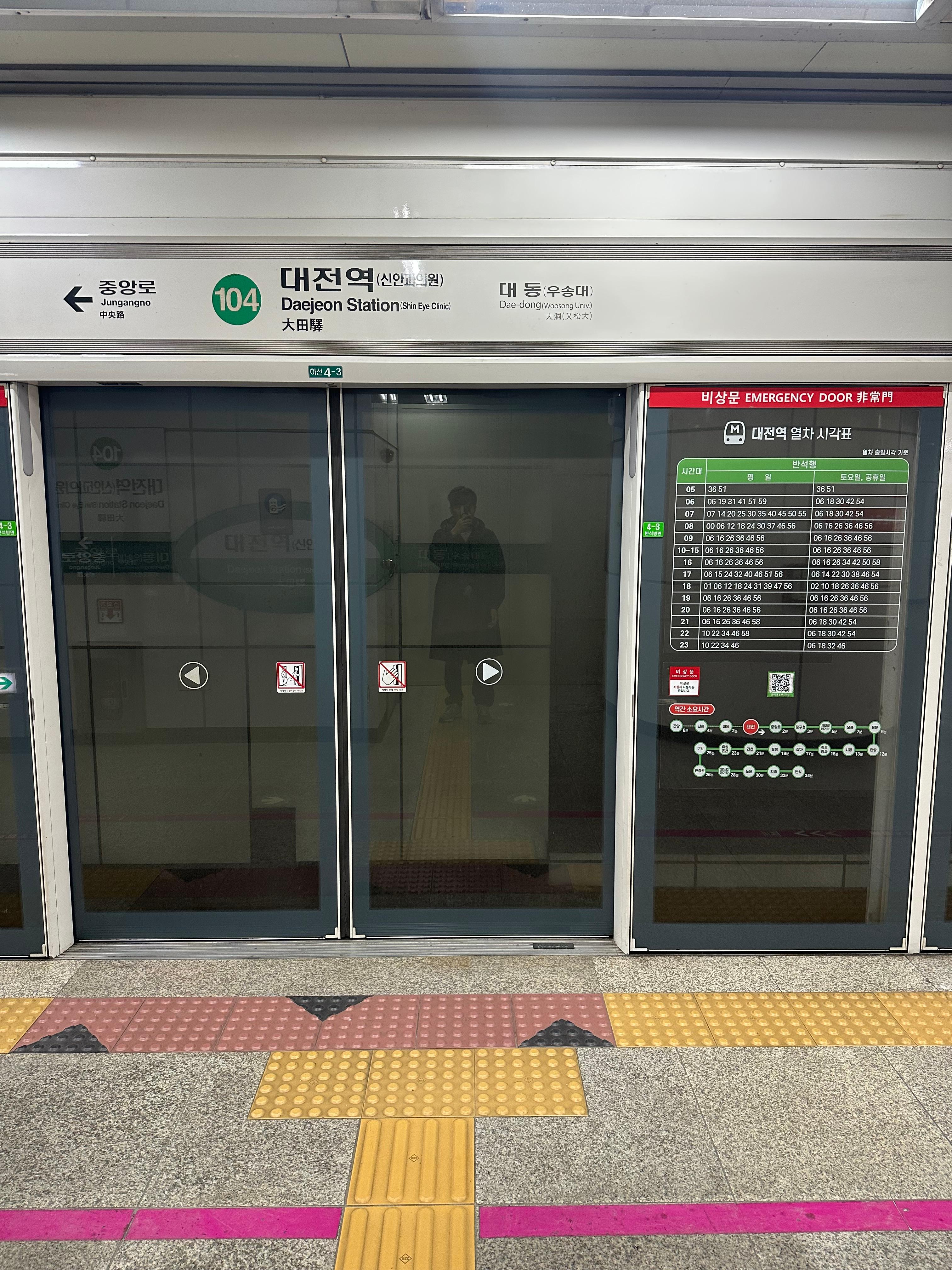 대전역에서 중앙로 방향 승강장에서 열차를 기다리고 있습니다. 스크린도어 옆에는 대전지하철 시간표가 있는데요. 대한민국의 중심도시인만큼 수도권만큼 열차가 자주 다니는 것을 볼 수 있습니다. 중앙로라는 역이름은 정말 자주 볼 수 있는데요. 특히 대구와 부산에서 동일한 역명을 볼 수 있습니다. 특히 지난 대구 여행에서 보았듯이 대구 중앙로역에서는 20년전쯤에 대구지하철 화재참사라는 큰 아픔이 있었는데요. 특히 대구도 대전도 중앙로는 젊은 사람들이 많이 다니는 거리에서 일어난 참사인만큼 더 슬픈 것 같습니다.