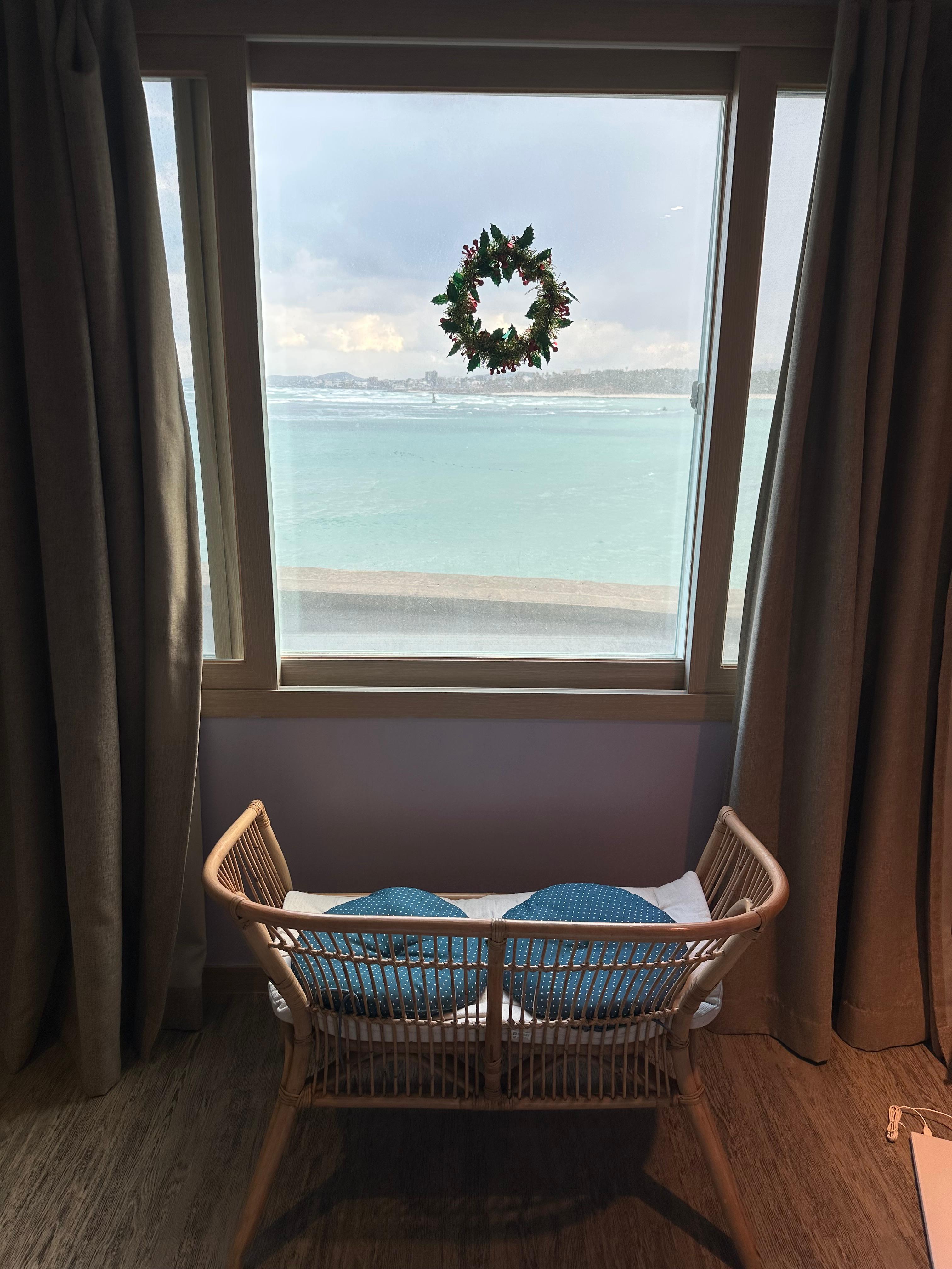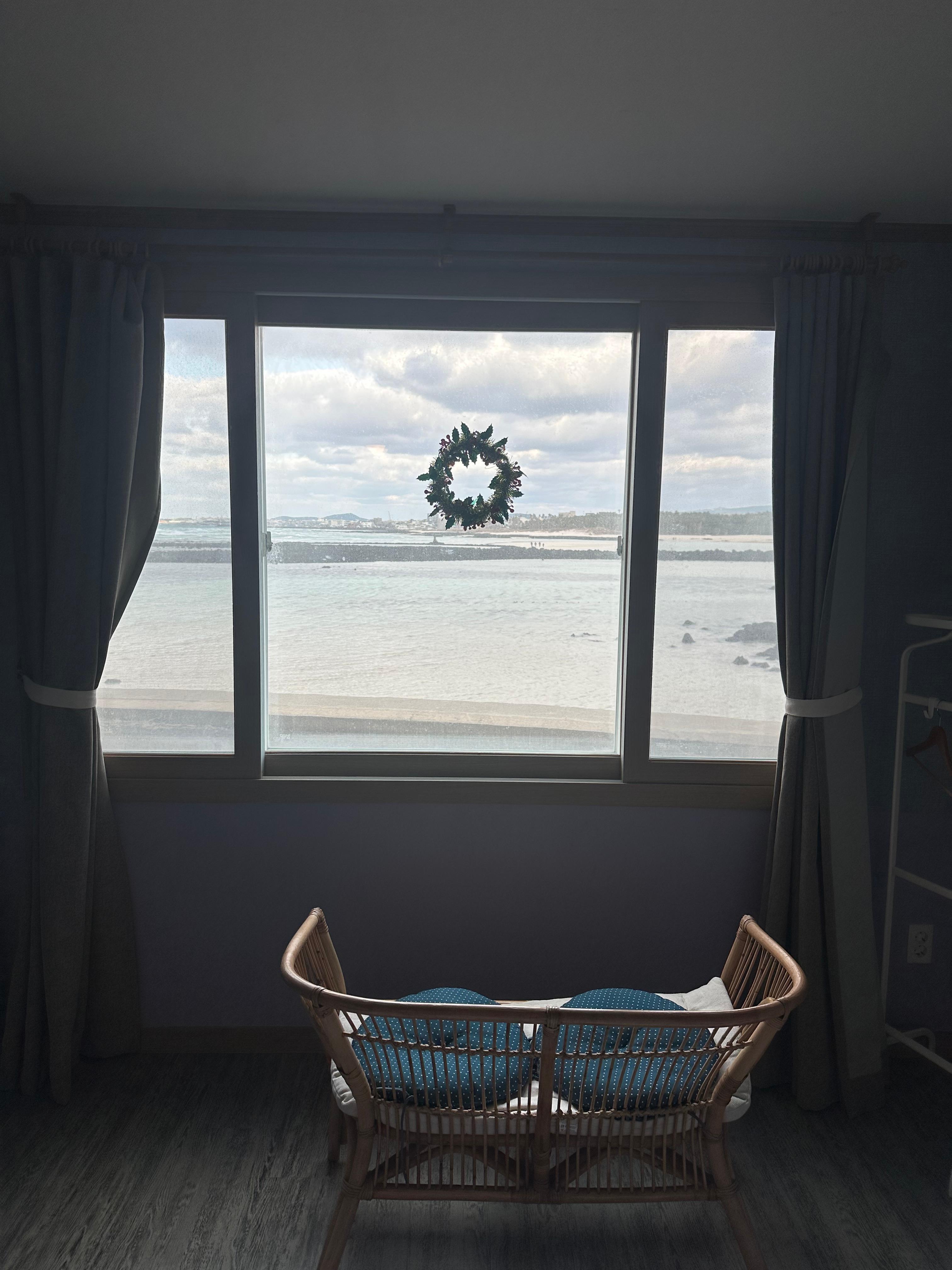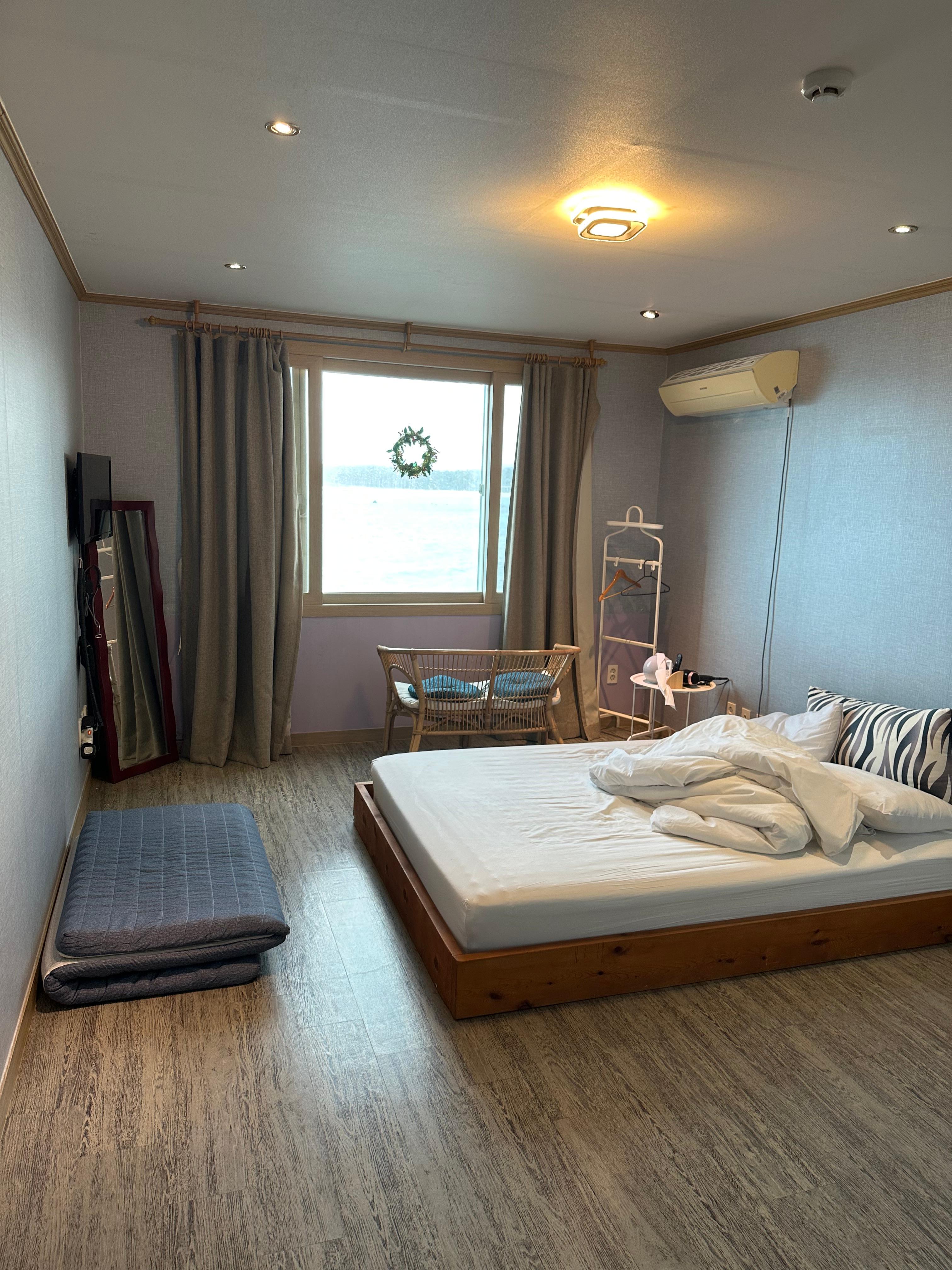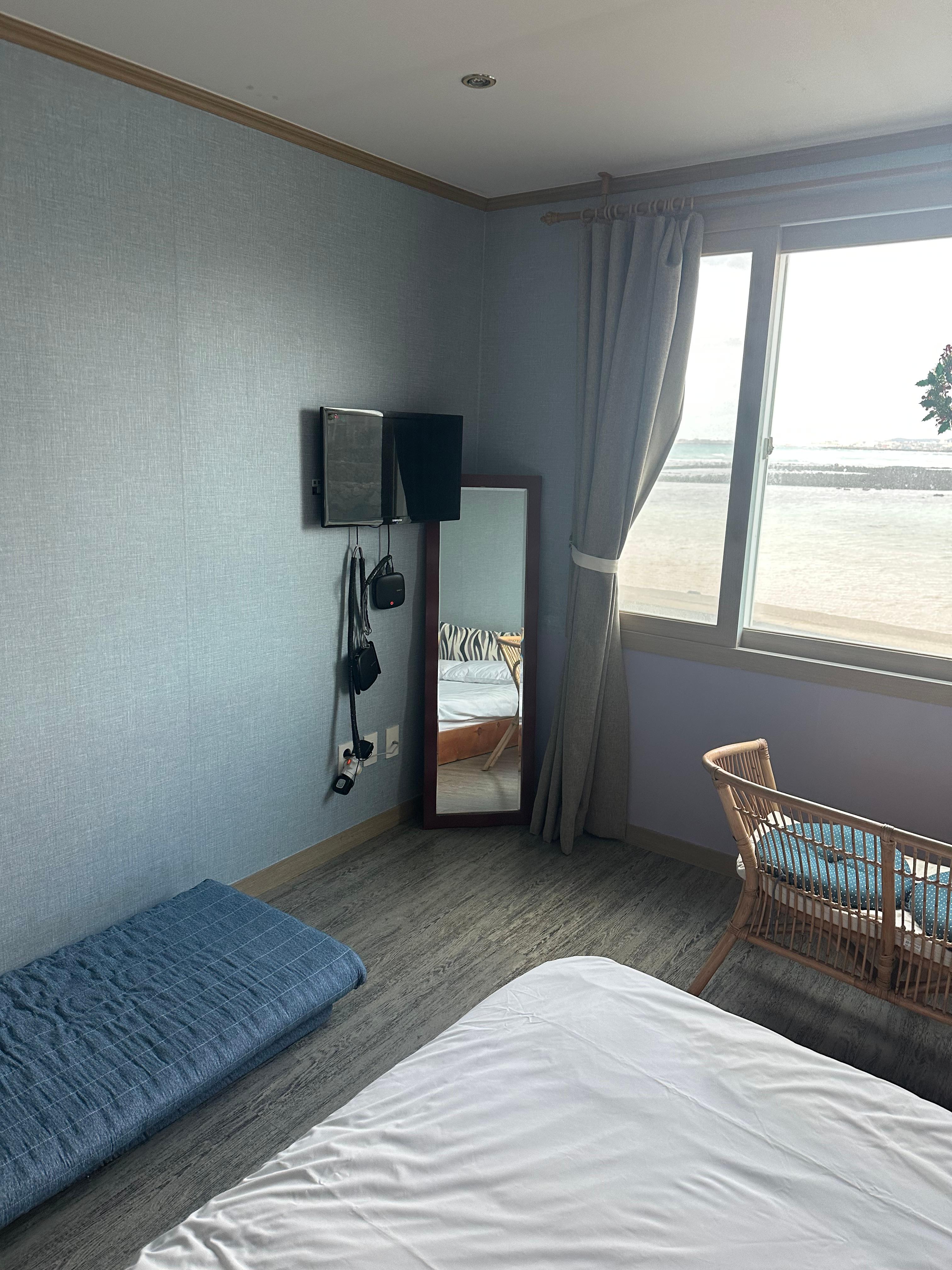 에퀴녹스 펜션의 경우 출입문 뒤쪽이다보니 나가자마자 바다는 아니지만 창문쪽에 출입문이 있었다면 정말 문열고 나가면 바로 바다가 있어서 더 좋았을 것 같습니다. 방 크기는 1-2인정도가 머무르기에 좋은 사이즈였습니다. 티비가 정말 작았습니다. 그래도 창가쪽에 바다를 볼 수 있는 의자와 침대가 있어서 멀지 않게 볼 수 있었습니다.