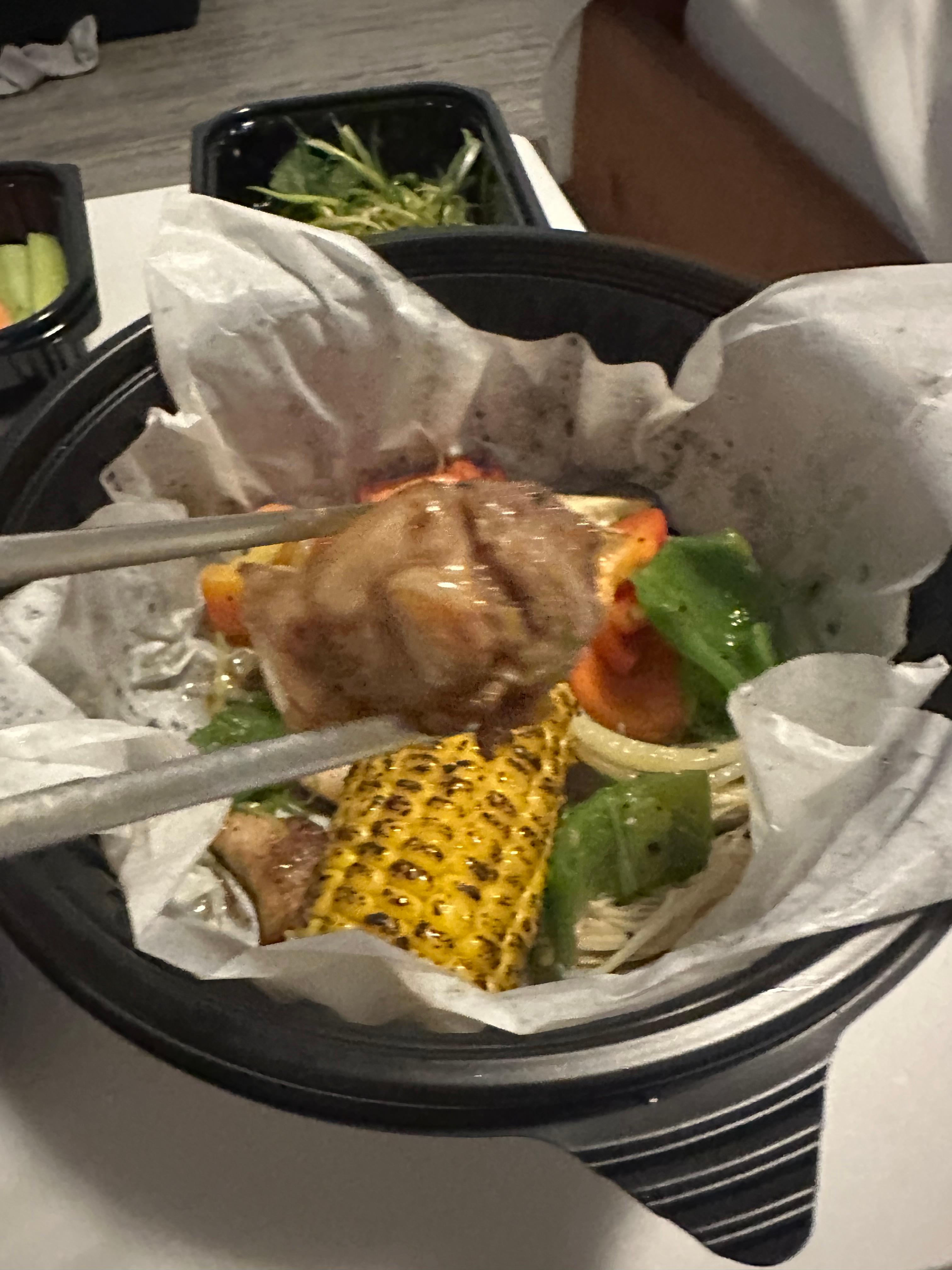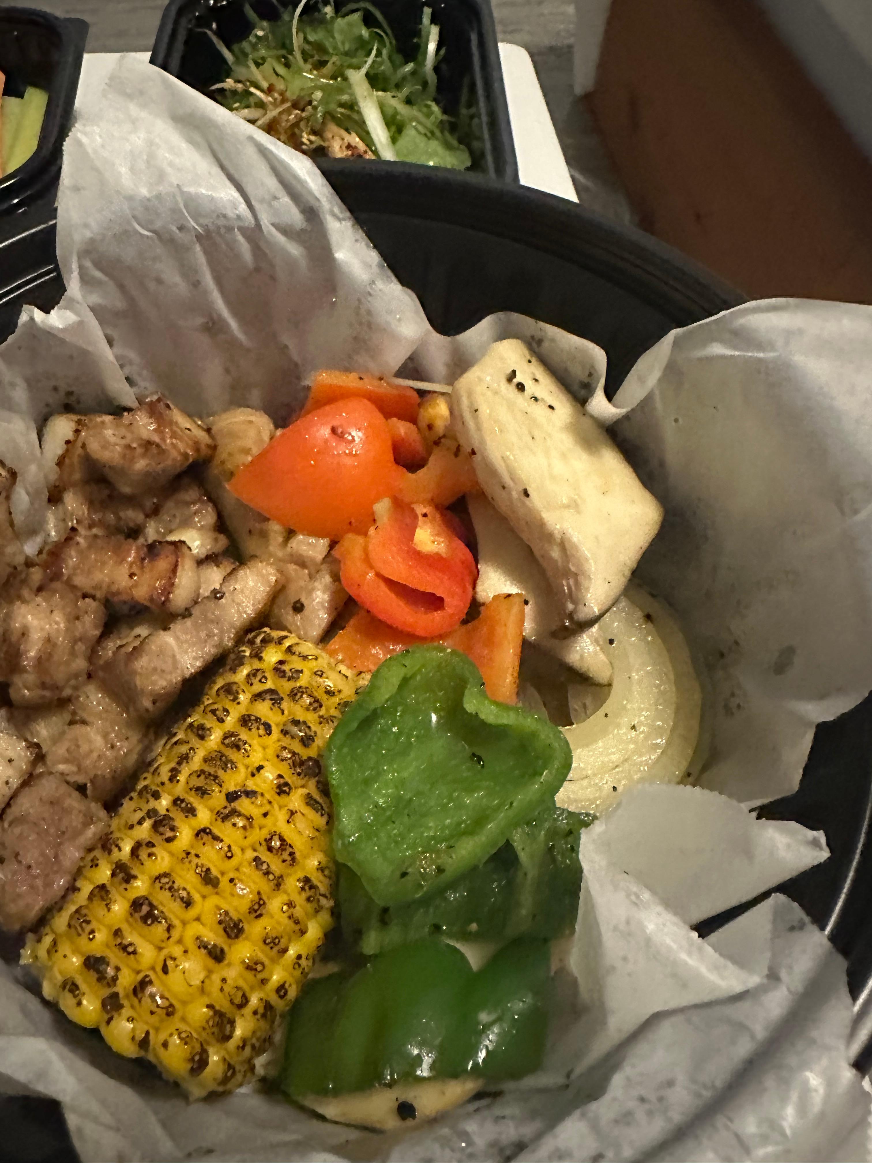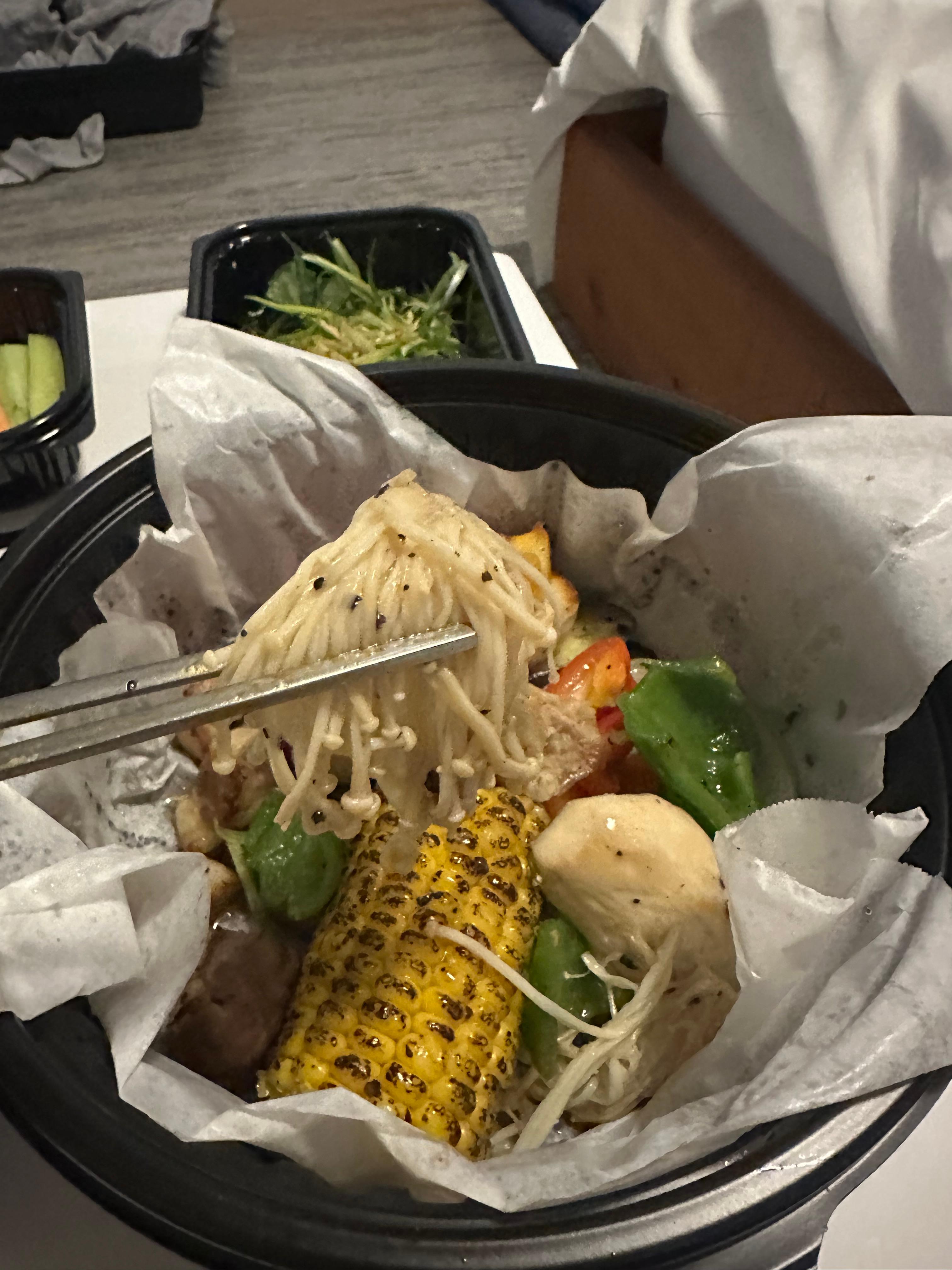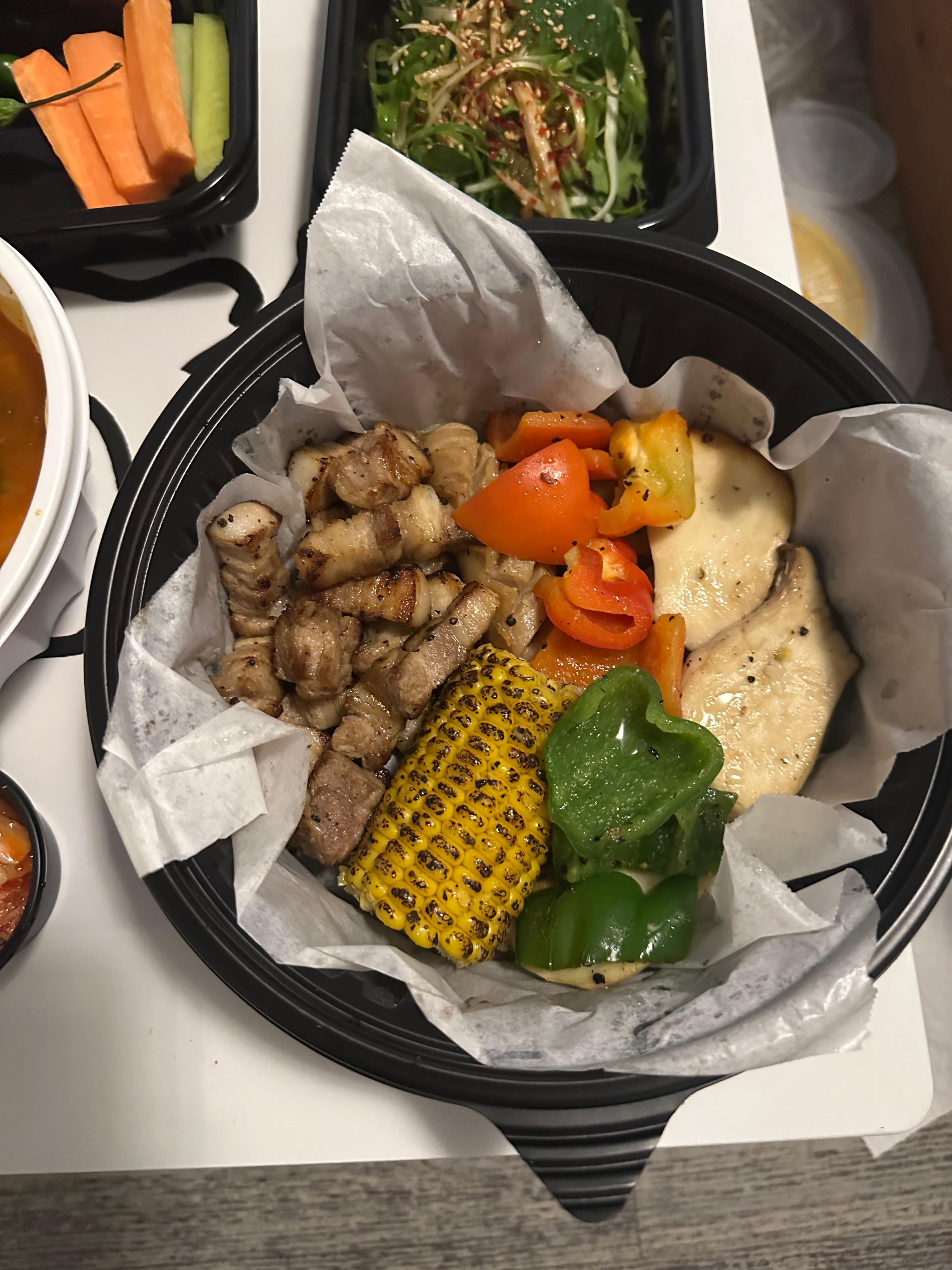 사진이 조금 흔들리긴 했는데요. 당시 쿠폰을 써서 3만원에 이용할 수 있었습니다. 흑돼지가 푸짐했습니다. 1인 혼고기 세트라고 해서 흑돼지 뿐만 아니라 김치 찌개부터해서 다양한 야채와 옥수수, 버섯 등등 실제로 바베큐장에서 먹는듯한 느낌이었습니다. 바베큐 해먹을때 숯불위에 버섯도 올려서 구워먹는데요.
