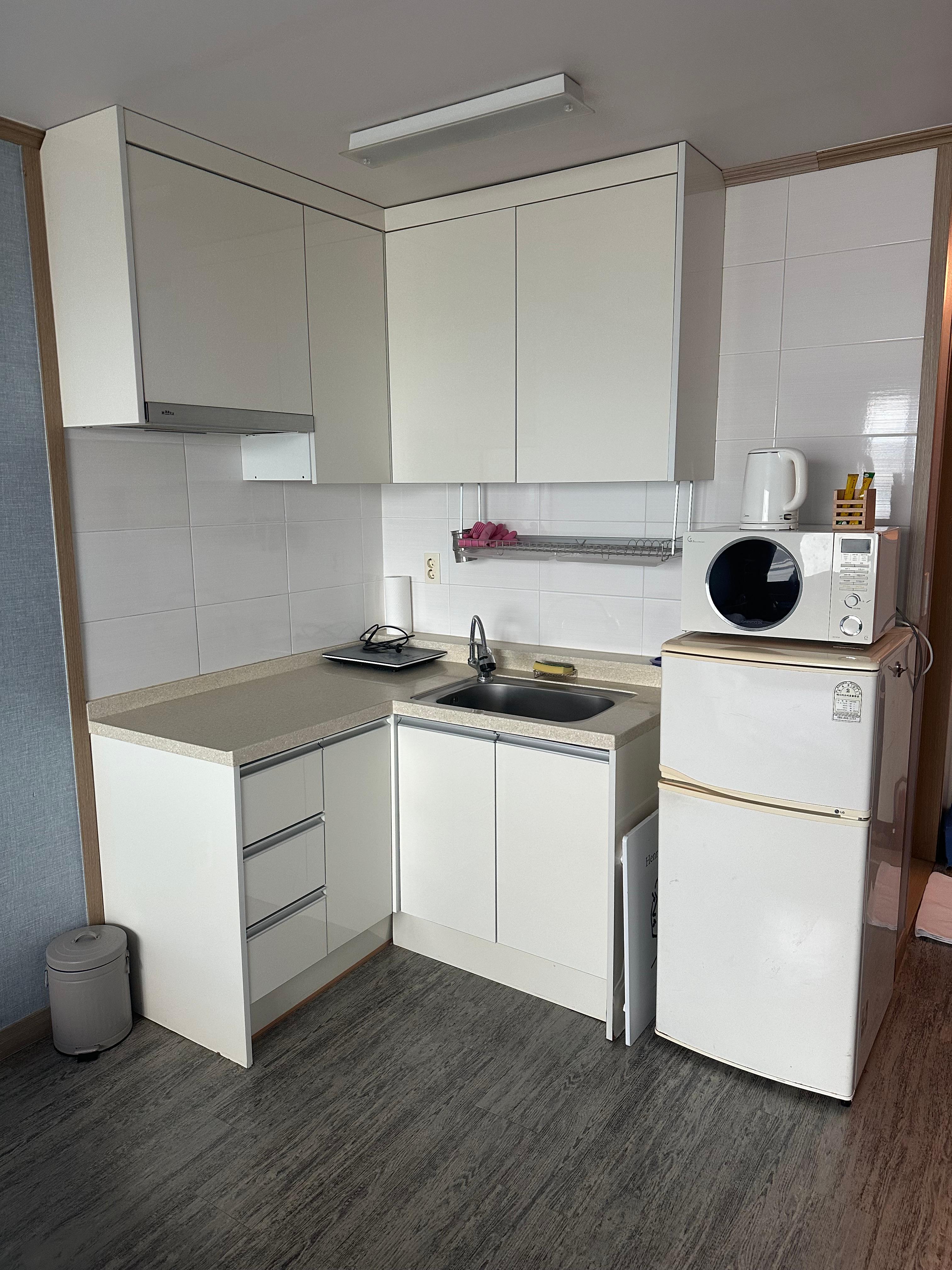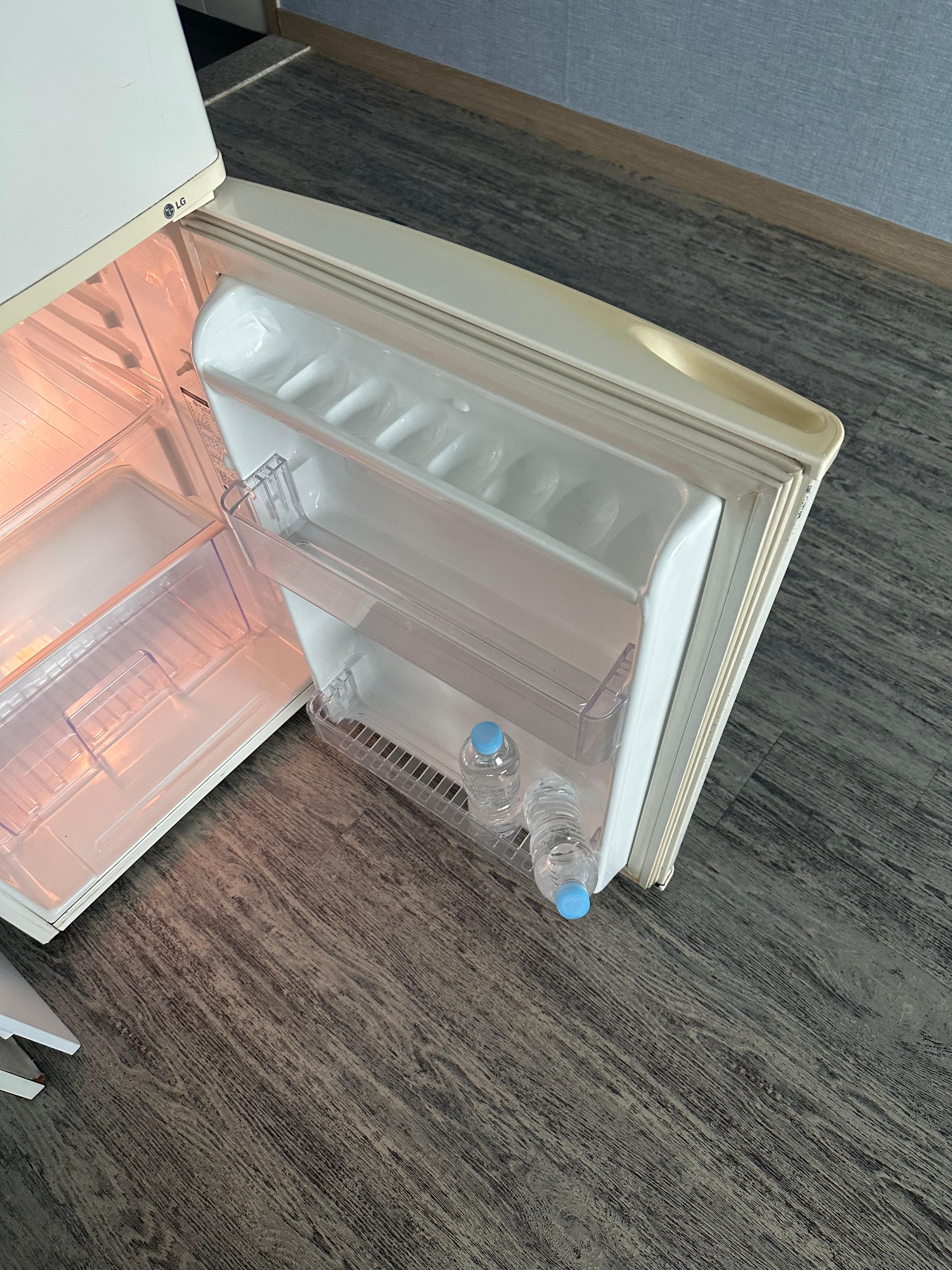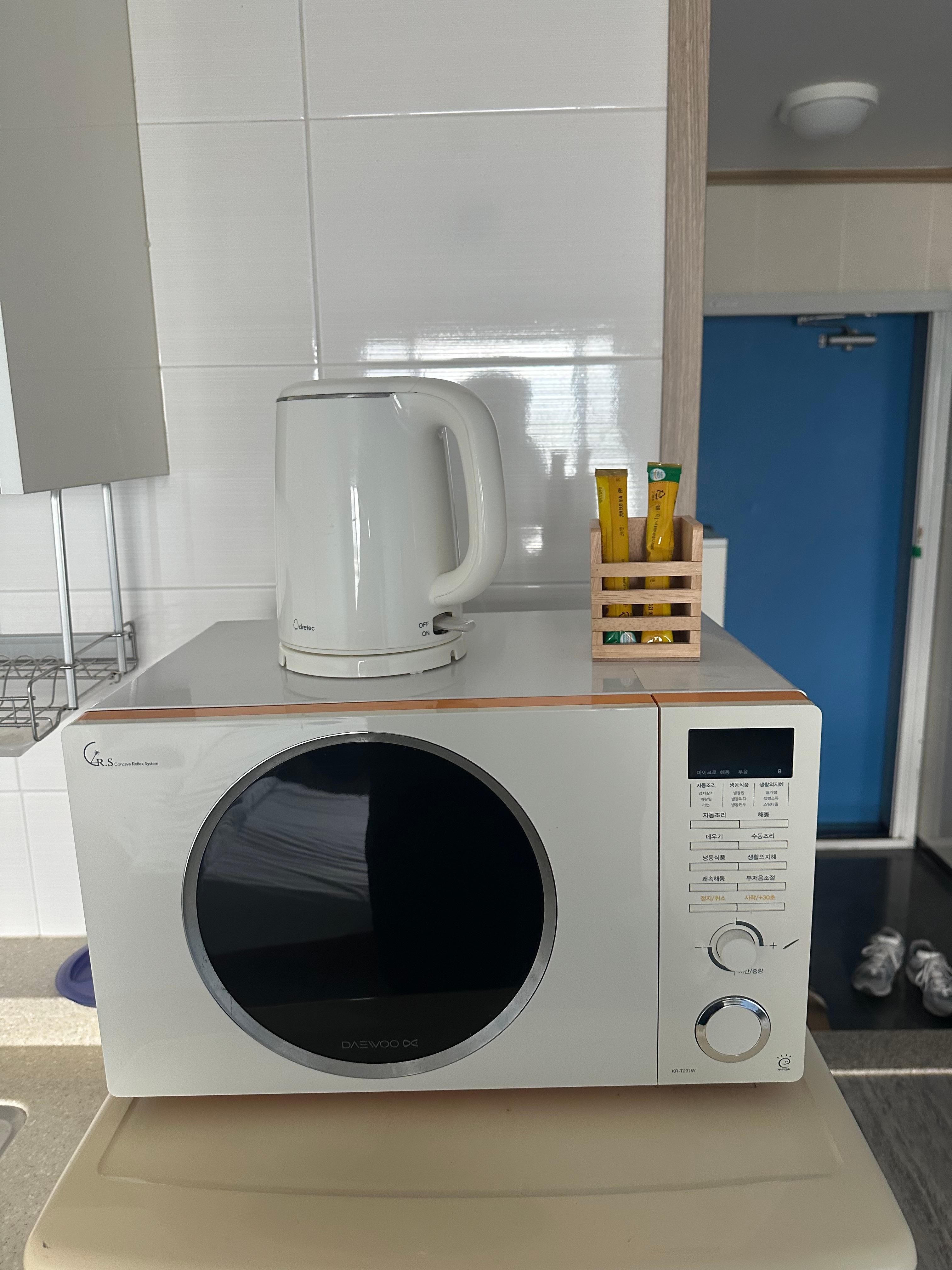 이제 조금씩 숙소를 살펴보도록 하겠습니다. 아무래도 최신 펜션은 아닌것 같구 지어진지 오래된 것같은 인테리어와 가전제품의 모습이었습니다. 냉장고, 인덕션, 전자레인지, 전기포트가 있었습니다. 그래도 믹스커피 2개가 냉장고 위에 있었는데요. 2023년 겨울부터는 에어비앤비를 자주 이용했는데요. 대부분은 믹스커피나 원두커피 정도는 제공되고 생수도 2개정도 지급이 되는 것을 볼 수 있습니다.