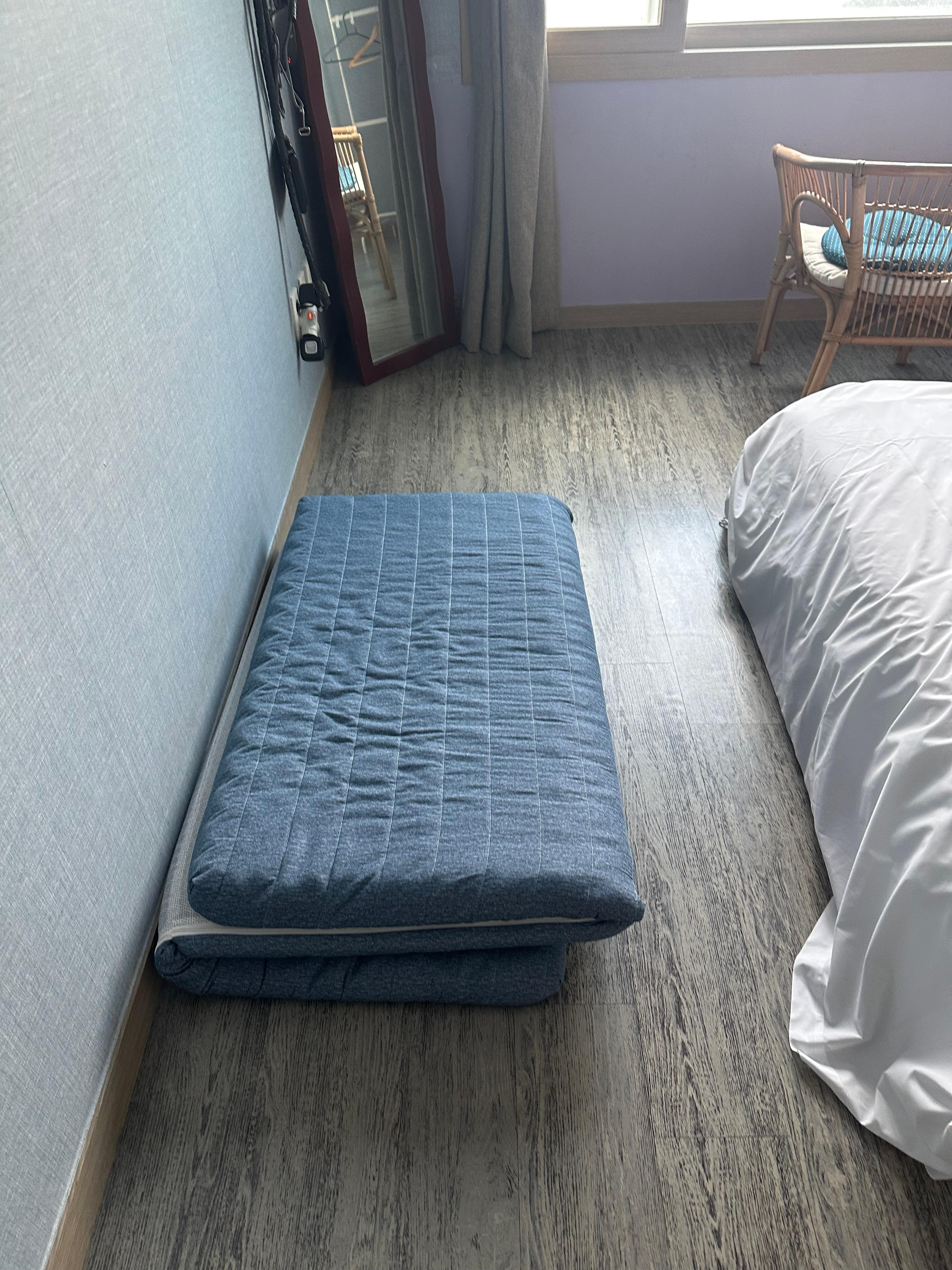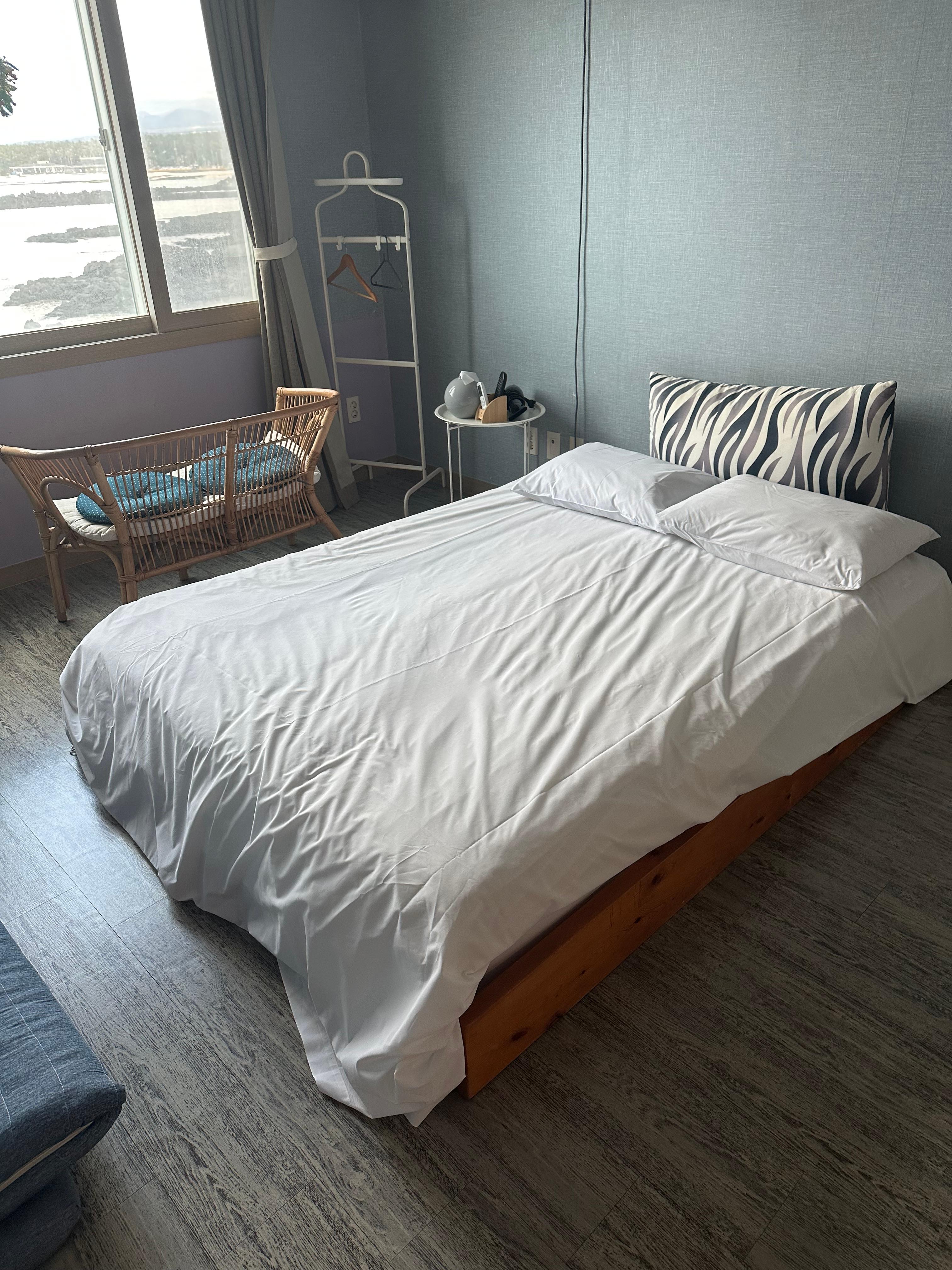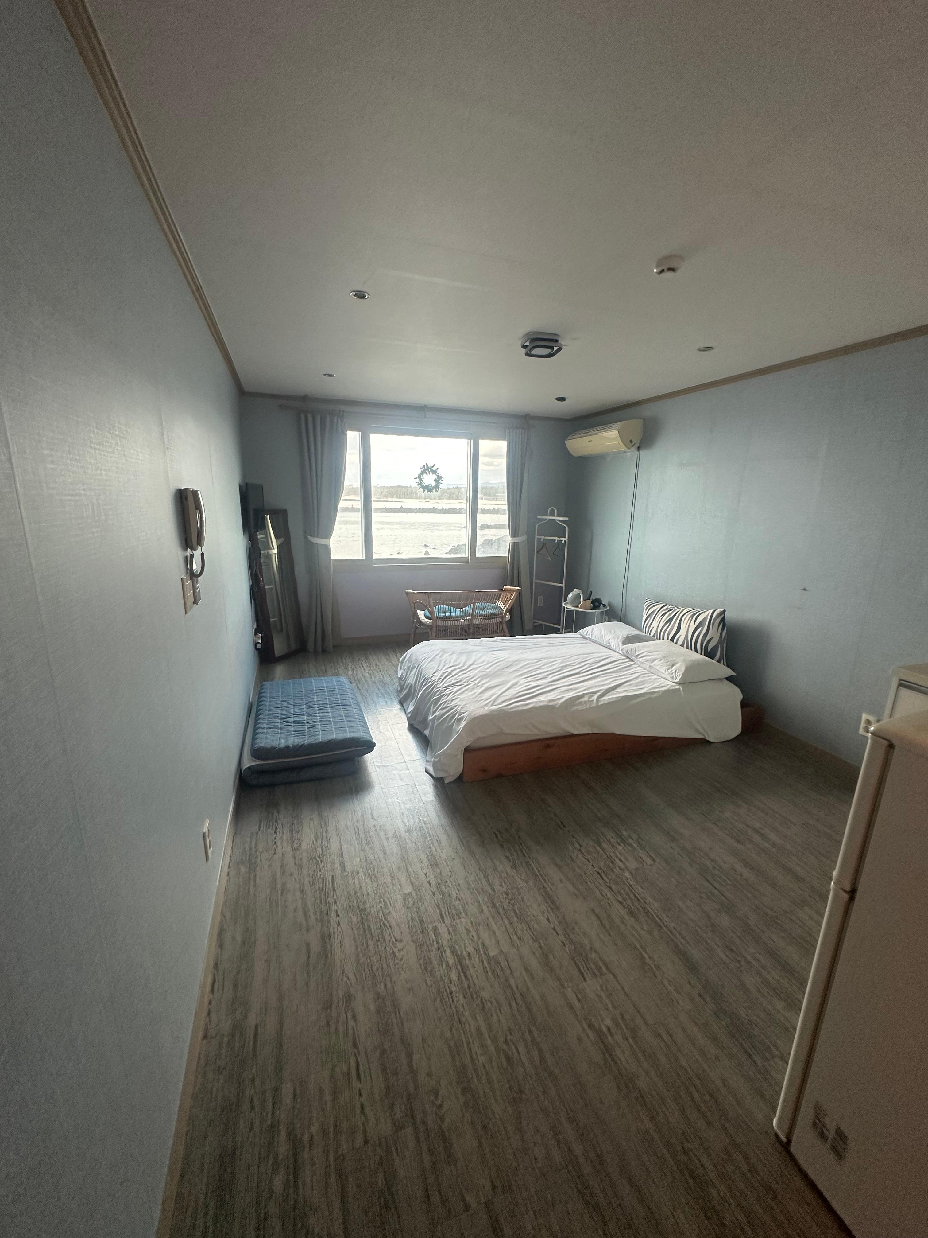침대옆에 이렇게 푸른 바다를 볼 수 있는 창문이 있어서 좋았는데요. 1층이라서 그런지 밤에는 블라인드 커튼을 해야지 안그러면 방안이 다보이는 구조였습니다. 이게 불편하긴 했습니다. 하지만 아침과 낮에는 블라인드 안해도 금능해변을 이렇게 볼 수 있어서 더좋았습니다. 속초 일출펜션의 경우 방파제가 있어서 확 트인 속초의 바다를 볼 수 없었지만 에퀴녹스 펜션 원담점은 1층에 있고 방파제 없이 바로 제주도 푸른 바다를 볼 수 있어서 더 좋았습니다. 침대 앞에는 여분의 매트도 있어서 1-2명 아니더라도 더 들어올 수있는거 같아보여도 매트만 제공되고 따로 이불은 제공되지 않은것보니 추가 인원은 추가 요금이 들어갈 것으로 보입니다.