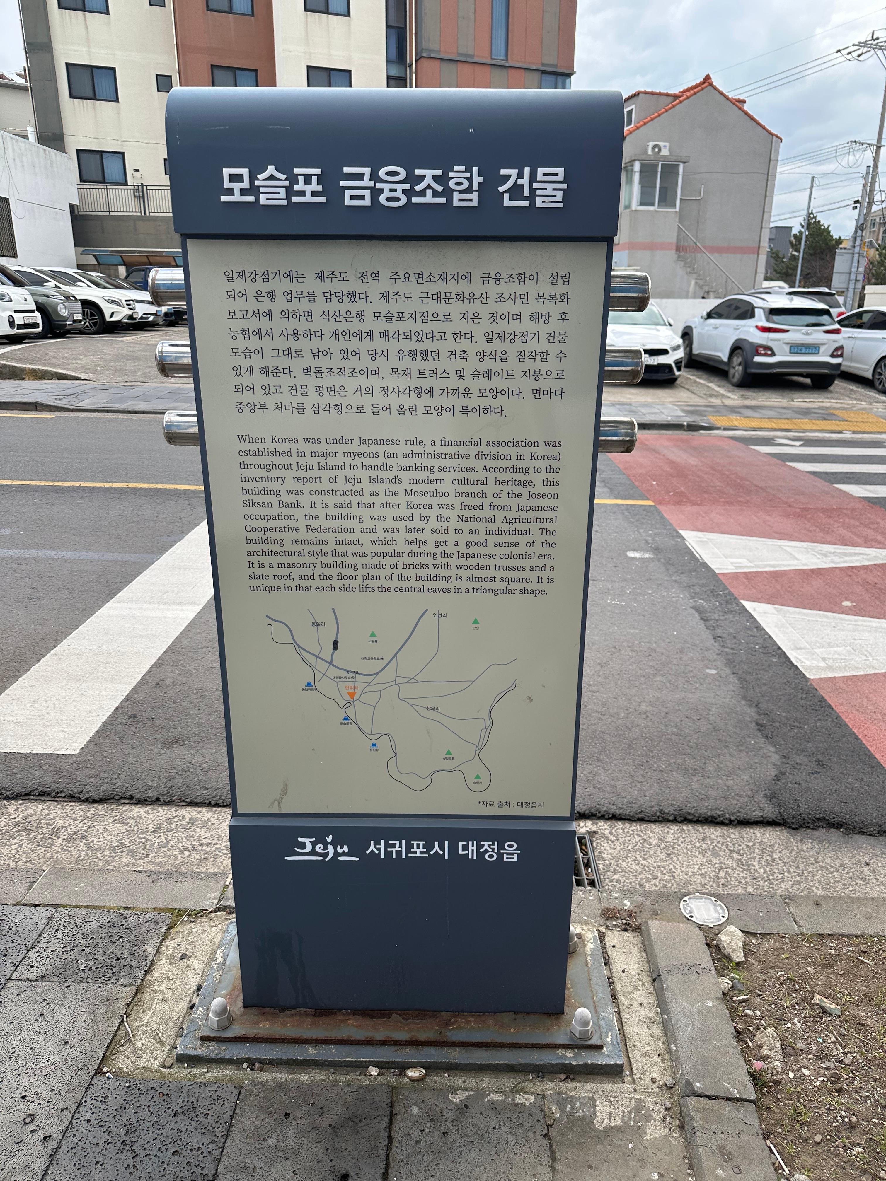 하모2리 정류장에서 하차해서 저는 점심을 먹기 위해 모슬포 고등어회전문점 미영이네로 이동하고 있었습니다. 금능에서도 먹구름이 있어서 비가 올까봐 걱정했는데요. 그래도 큰 비는 오지 않고 이슬비정도의 작은비가 흘려서 우산 없어서 걱정햇지만 조금 비맞으며 걷기에 좋았습니다. 걷다보니까 일제 근대 건물을 볼 수 있었는데요. 우리나라는 지금으로부터 약 100년전에 일제강점기라는 치욕의 역사를 갖고 있습니다. 그래서 국내 여행을 하다보면 전국에는 아직까지 일제 강점기 근대 건물들을 볼 수 있는데요. 하지만 무조건 없애는 것보다는 일부는 남겨놓아서 후손들에게 그때의 역사를 알려주며 다시는 나라 뺏기는 일을 겪지 않도록 교훈으로 남기는것도 중요하다고 생각합니다. 당시 모슬포 금융조합은 현재는 노래방으로도 운영되는데요. 제가 포스팅으로 전해드렸던 구 한국은행과 포항 등 일제강점기라는 건물보다는 밝 색상이 뭔가 거부감 없이 느껴집니다.