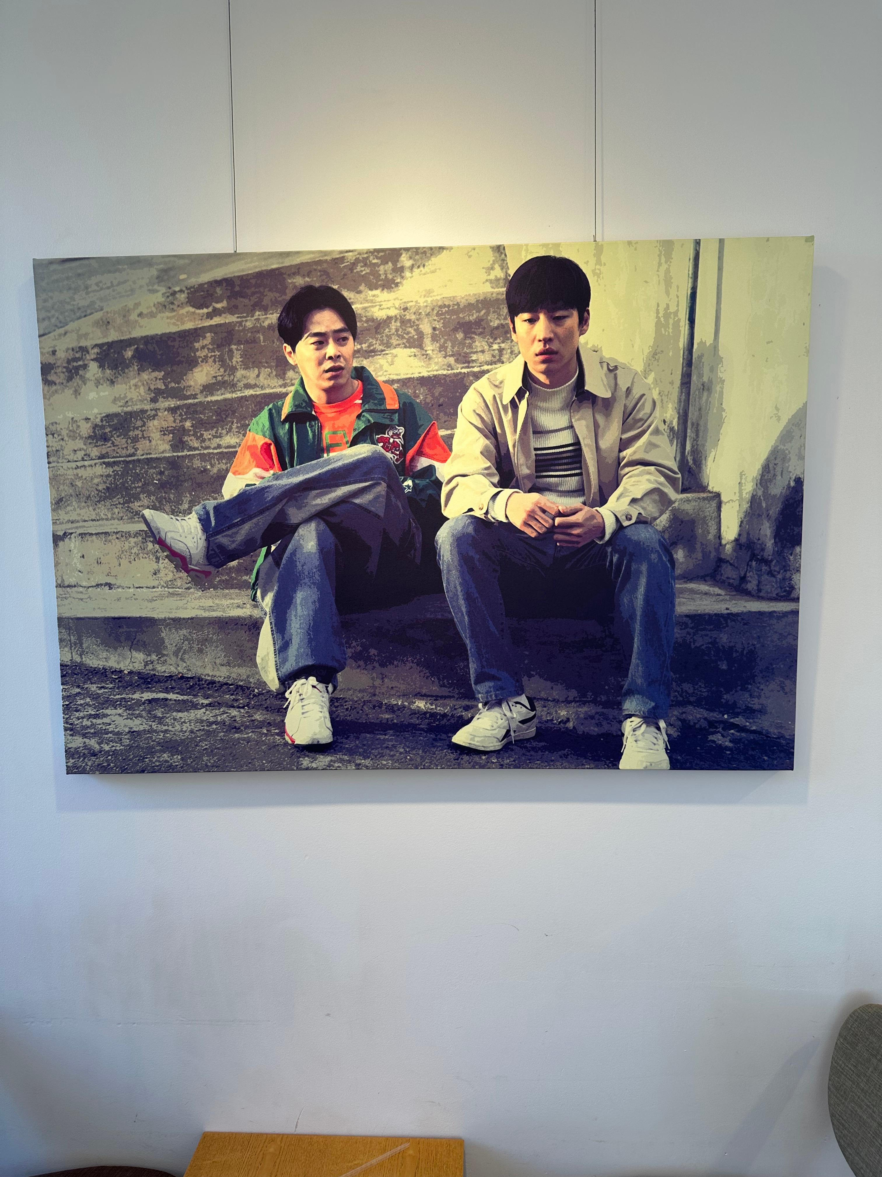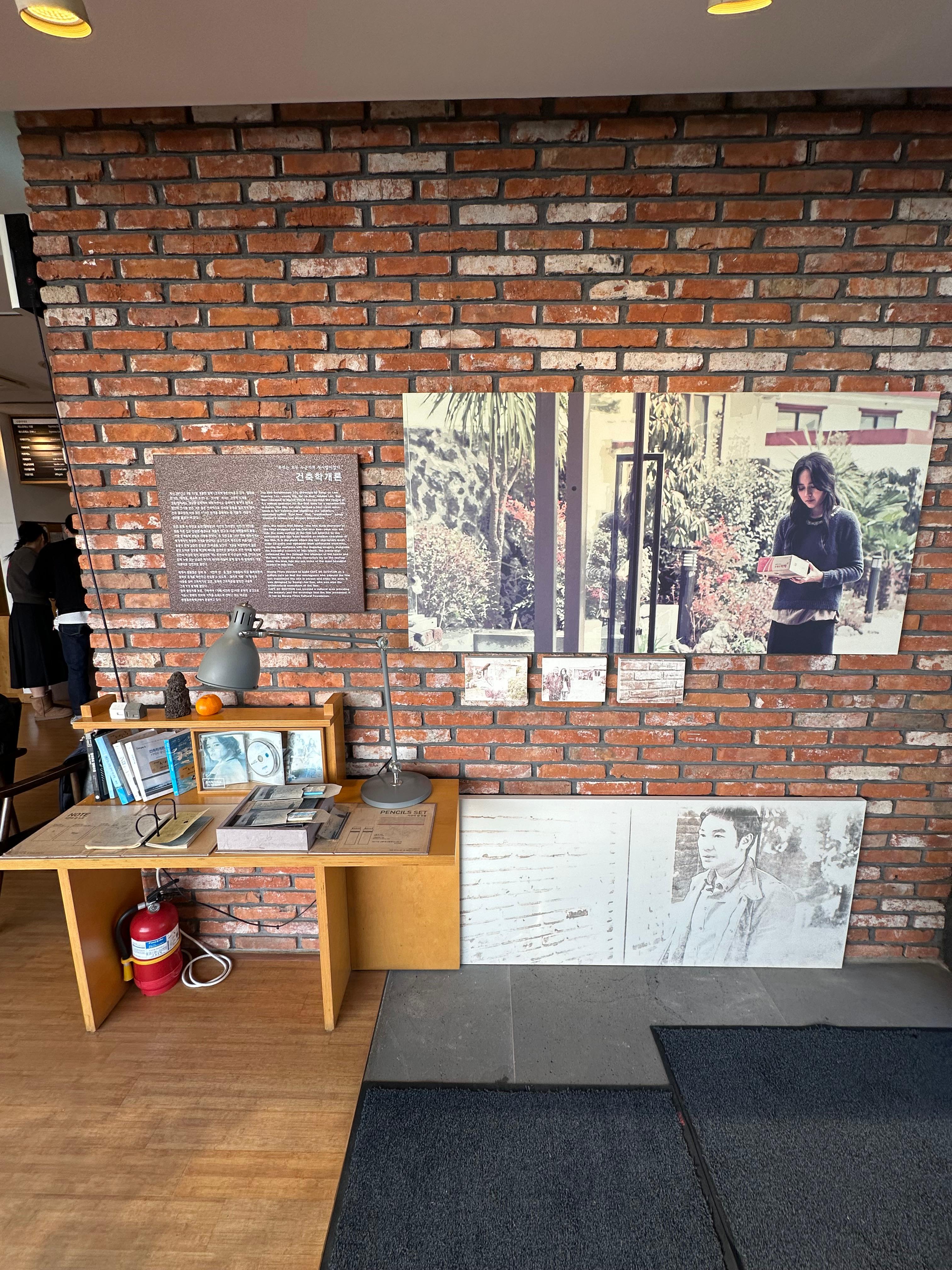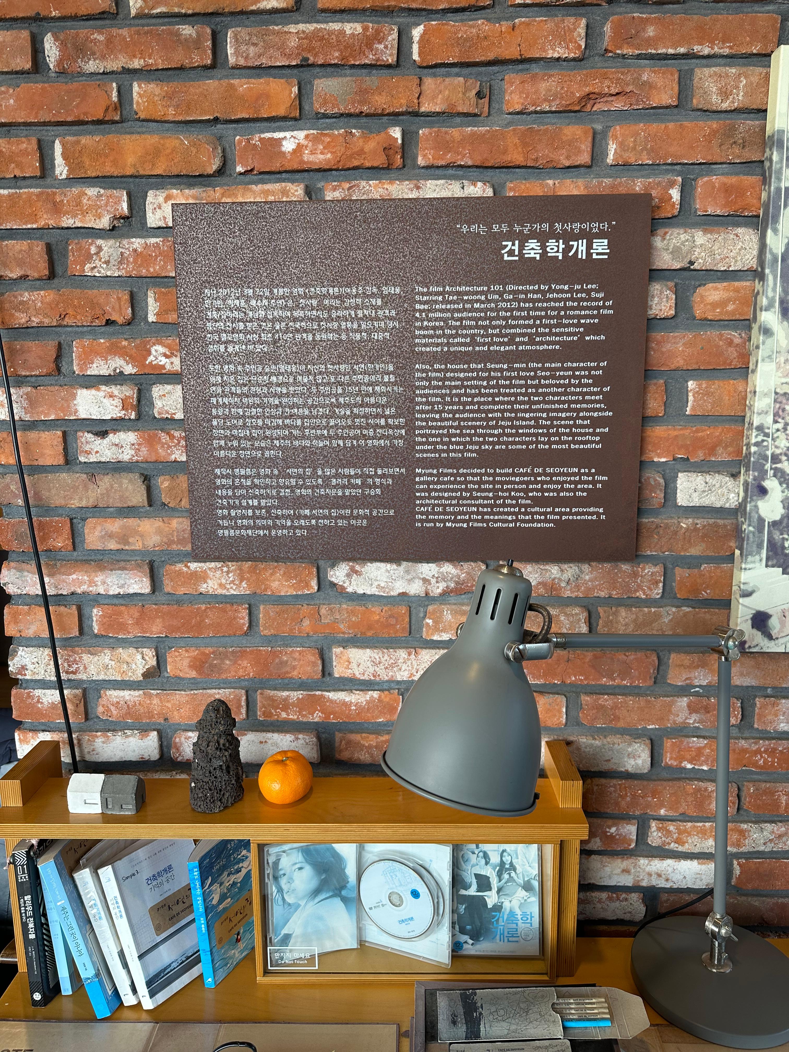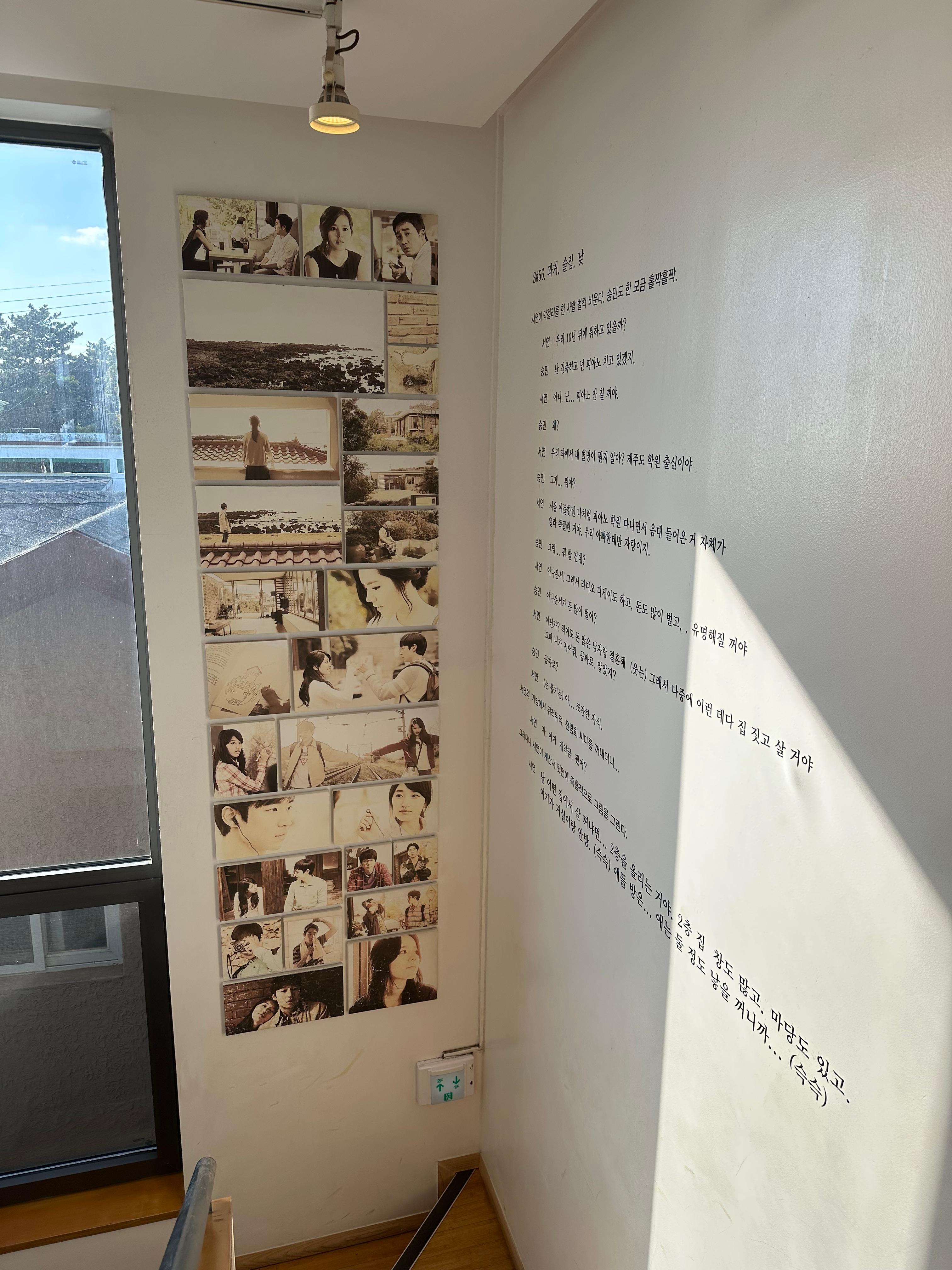 어디를 가든 오션뷰는 인기가 많은데요. 하지만 1층 프론트 옆에 여유롭게 좌석이 남아서 저는 자리를 잡았습니다. 오션뷰 배경은 아니지만 영화 건축학개론의 주인공인 승민의 작업실이 보이는 뷰였습니다. 조용히 혼자서 작업하기 좋았습니다. 1층에서도 곳곳에 영화건축학개론의 장면이 붙은 사진들이 있었는데요. 당시 납득이를 맡았던 조정석이 승민(배우 이재훈)의 고민을 들어주며 조언해주던 재미있던 장면이 떠올랐습니다.