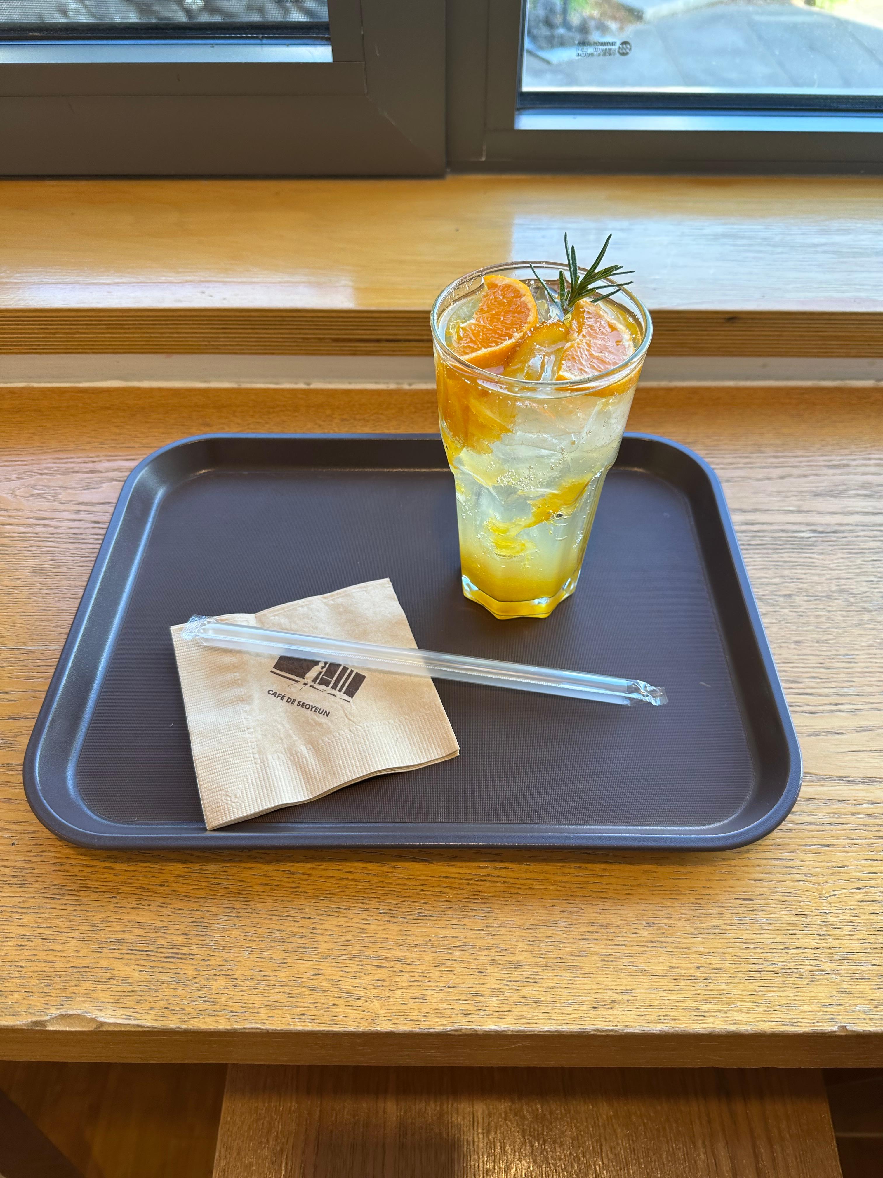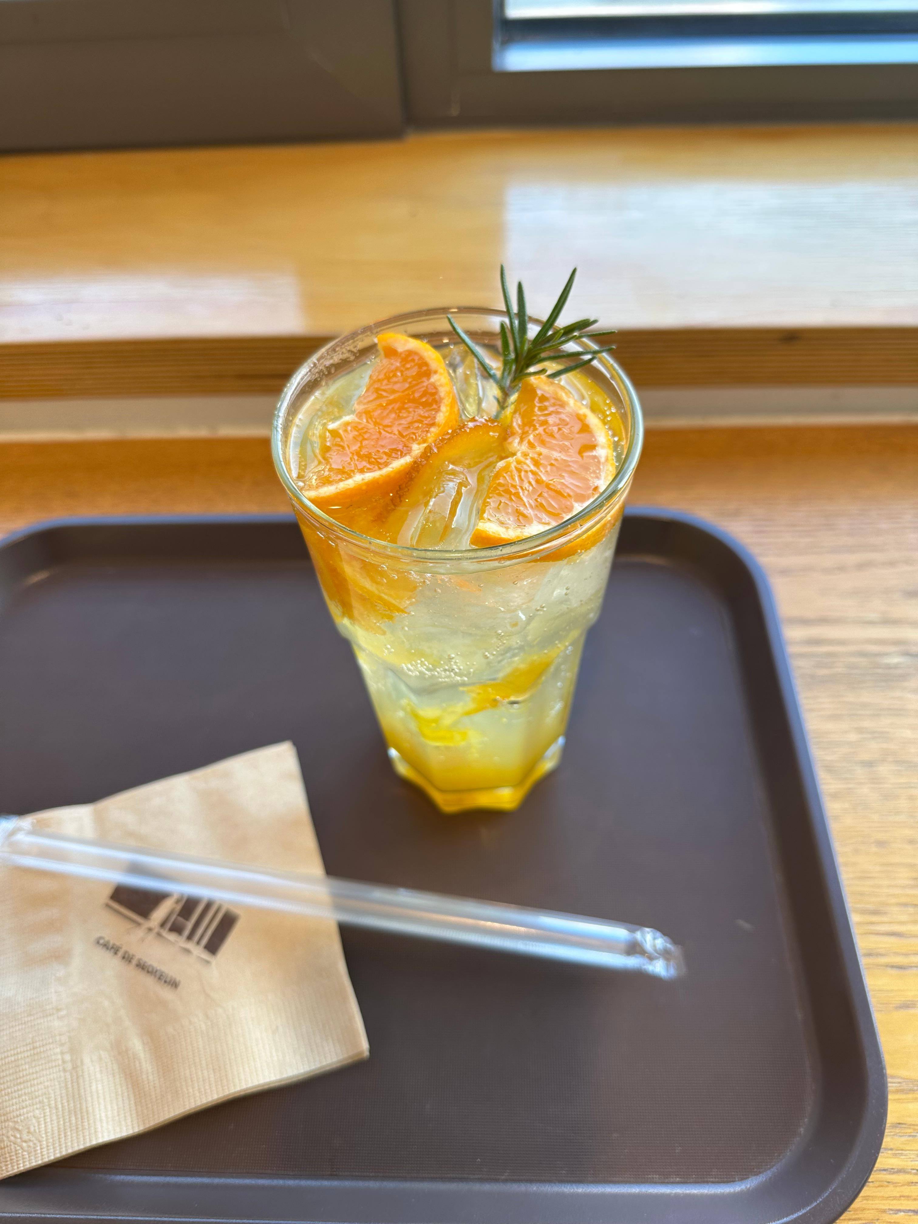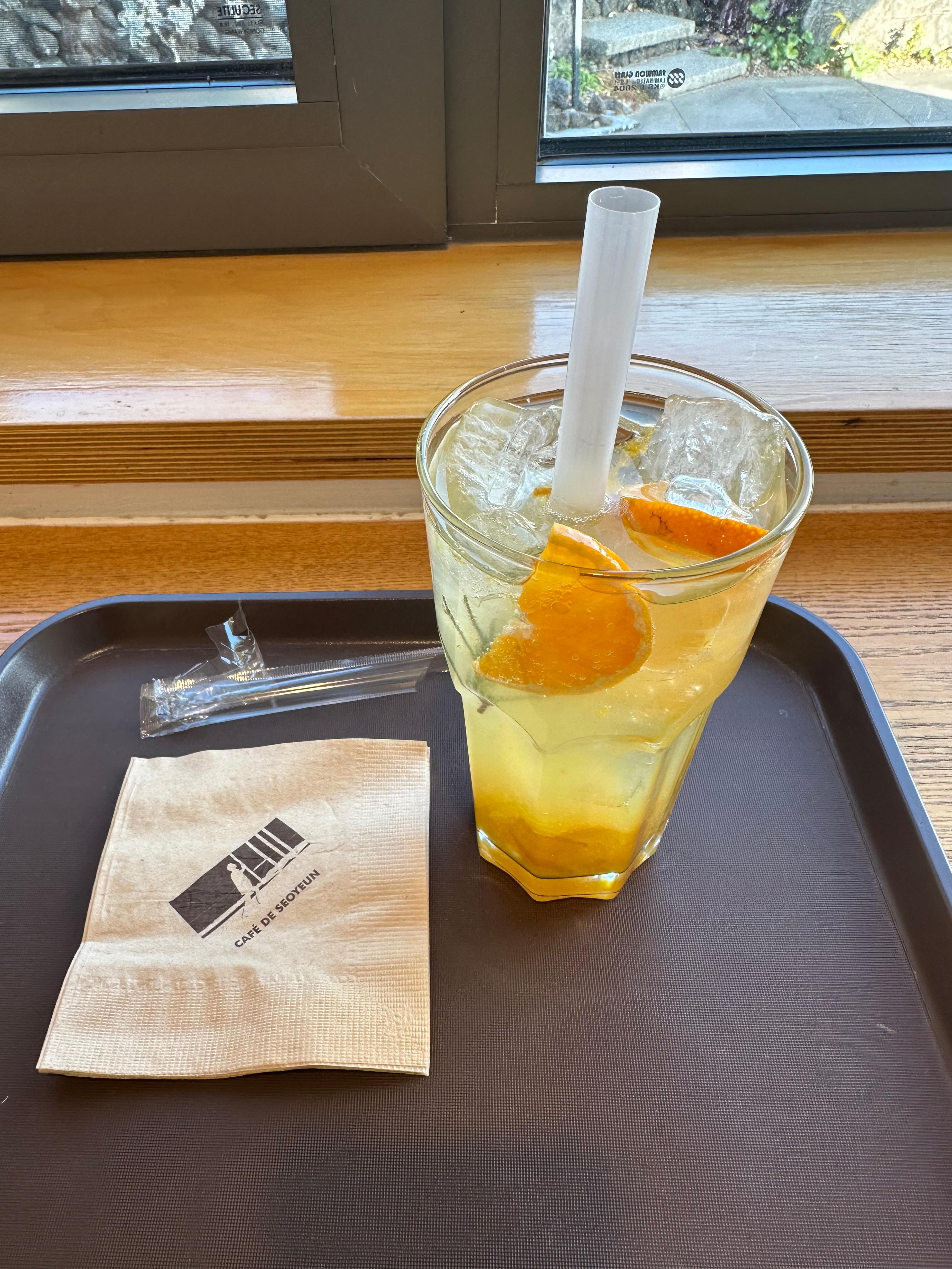 그리고 자리를 잡고 얼마 지나지않아 제가 주문했던 아이스 한라봉꿀이 나왔습니다. 빠르게 나왔는데요. 제주도이다보니 한라봉으로 만든 음료도 먹어봐야겠다 싶었습니다. 한라봉 두개와 함께 컵 안쪽에는 한라봉을 직접 갈아 넣은듯한 음료였습니다. 실제로 먹어보니까 쉬다는 느낌보다 달고 맛있다는 느낌이였습니다. 지난 2023년에도 한라봉꿀을 먹었는데요. 그때도 정말 그 단맛을 잊지 못했느데 2년만에 다시 먹으니까 더 맛있었습니다.