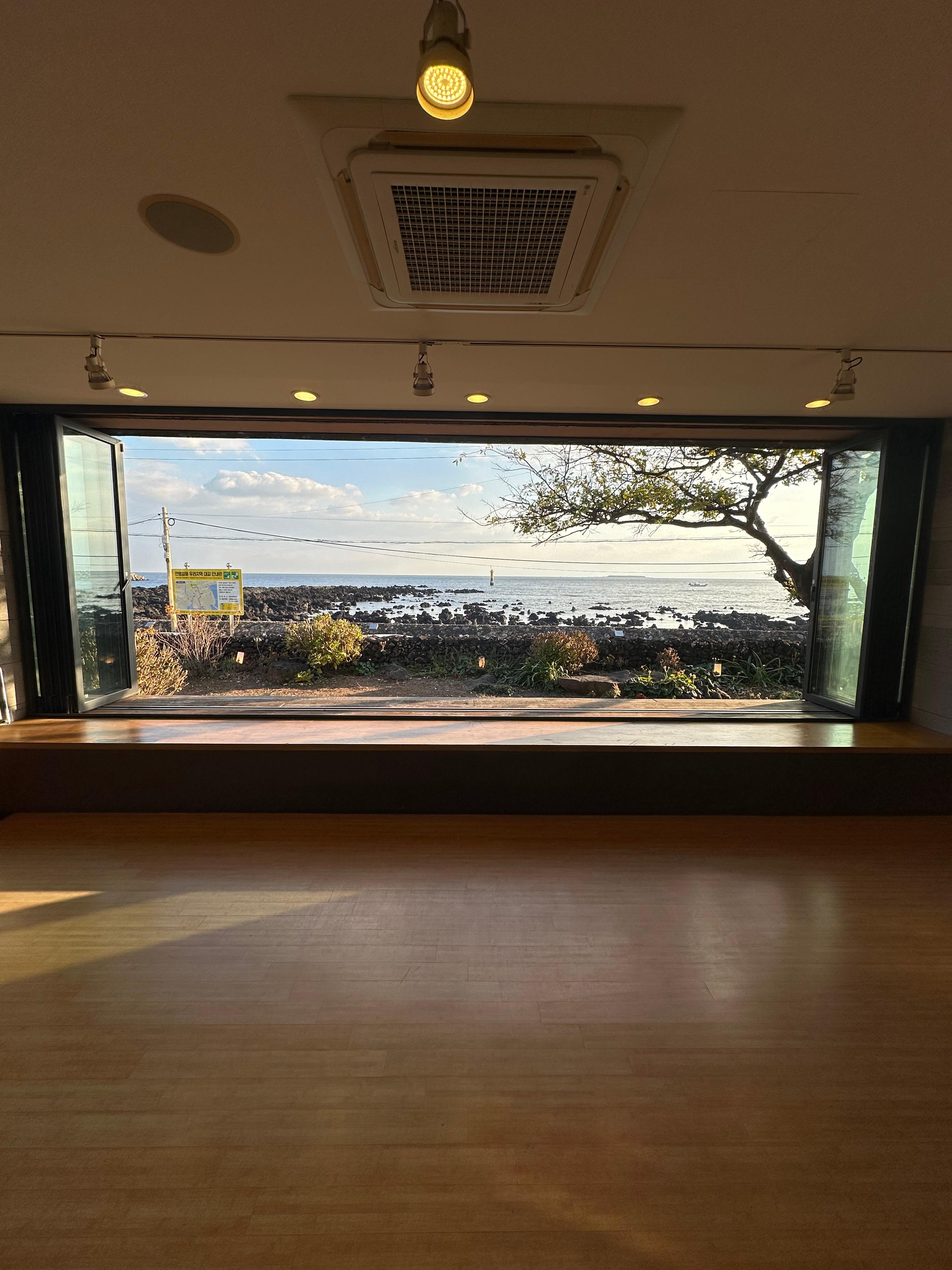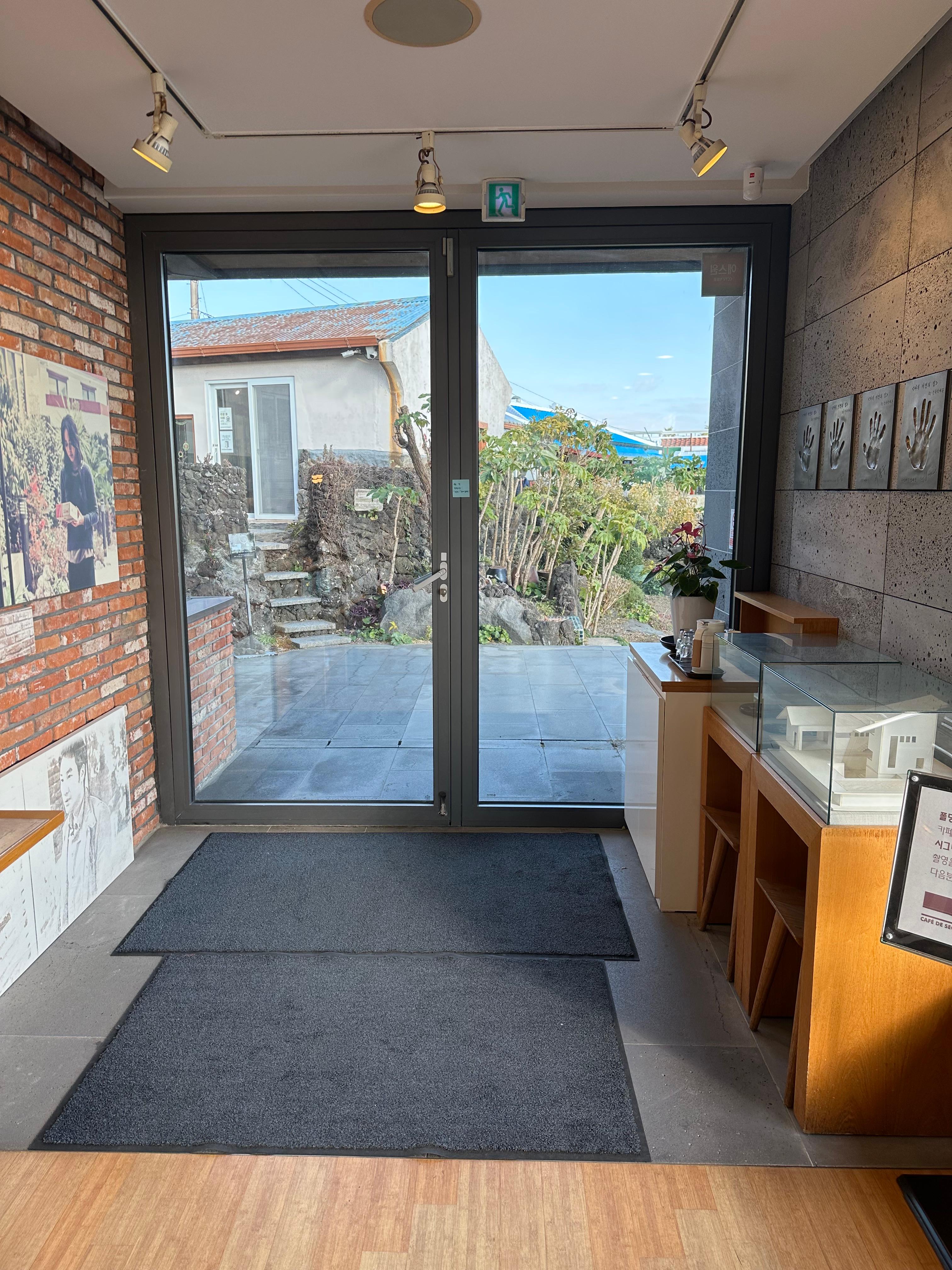2시가 넘어 3시가 되어가는 시간에 공천포를 지나서 남원읍 위미리에 도착하게 되었습니다. 인근 공천포 바다에서 남원읍 위미리까지는 바다를 따라 30분거리의 짧은거리로 산책할 수 있는 거리였습니다. 카페서연의집의 가장 핵심은 바로 카페 정문으로 창문인데요.