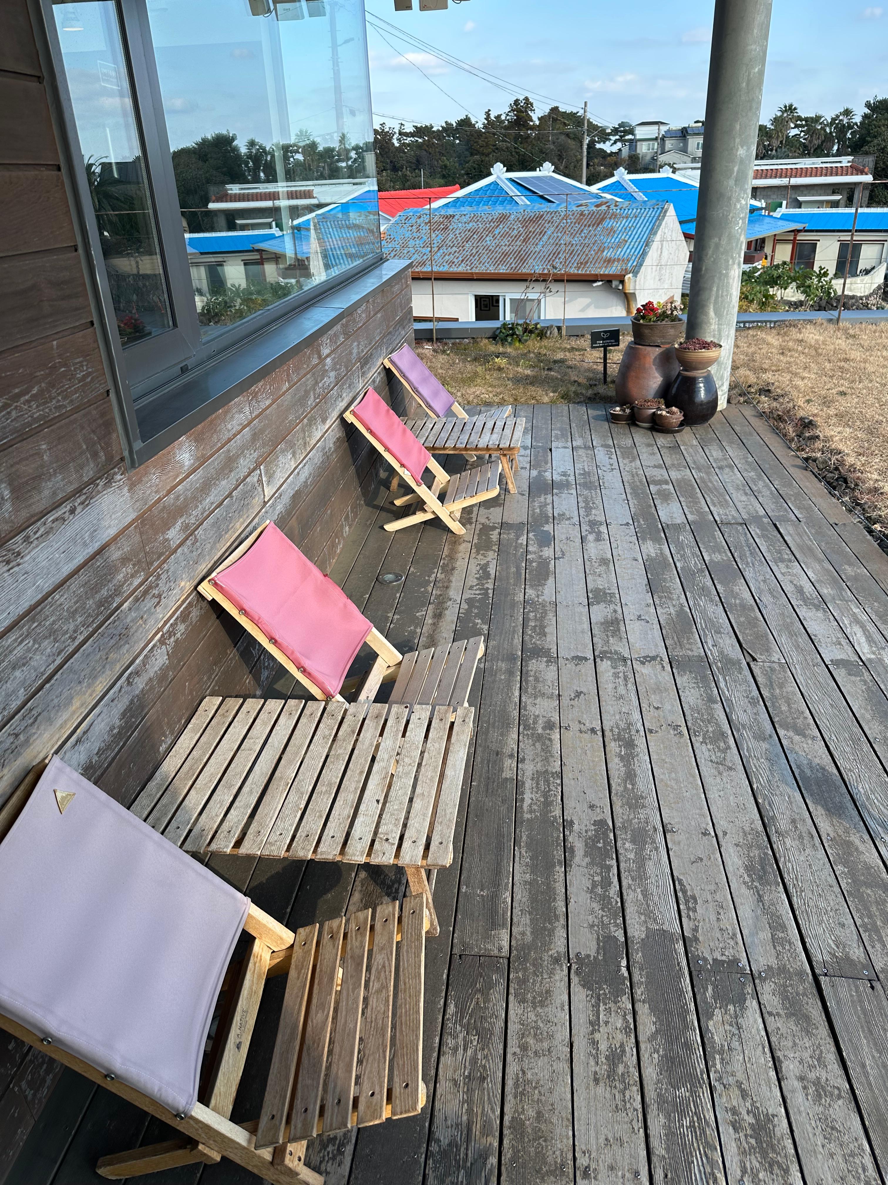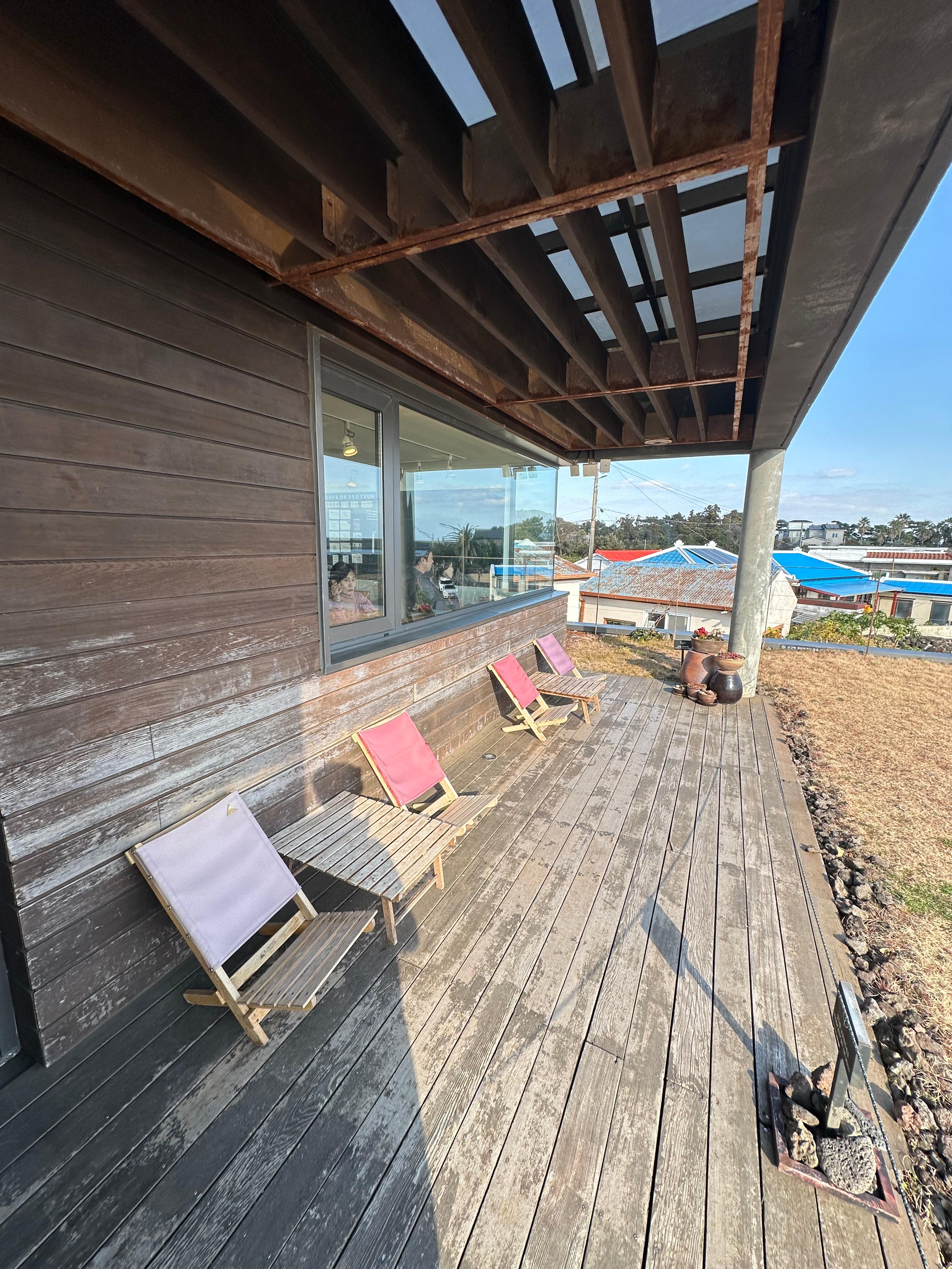 2층 테라스와 벽면한쪽에는 이렇게 야외를 그대로 보며 즐길수있도록 캠핑용 의자가 준비되어있었습니다. 저는 노트북을 하느라 조금 더 기다리거나 다른 콘덴서 있는 자리를 선호했는데요. 그래서 앉지는 않고 조금 바다를 보며 시간을 보내다가 1층으로 내쳐갔습니다.