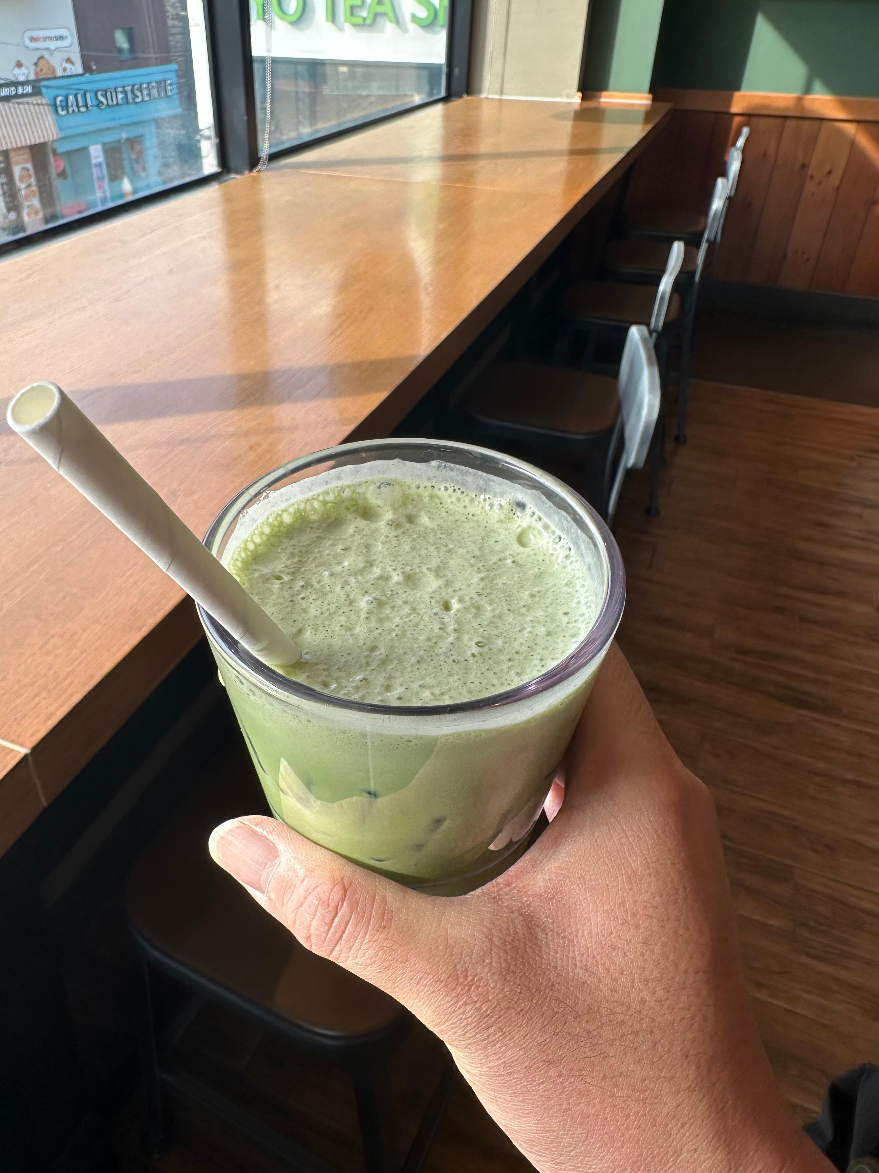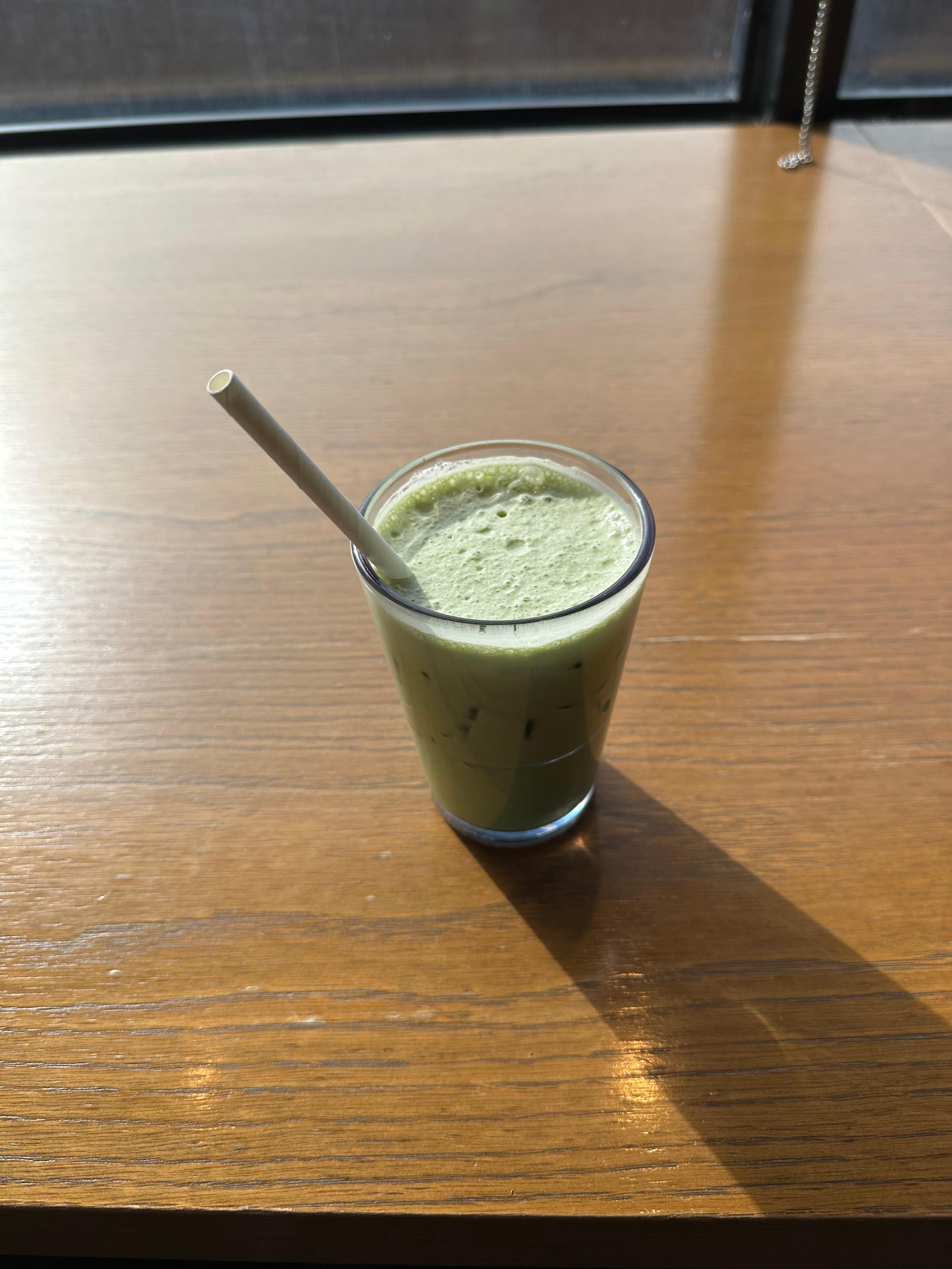 햇빛이 너무 강해서 그런지 직원분이 와서 블라인드를 내리더라구요. 그리고 얼마 지나지 않아 제가 주문했던 아이스말차라떼가 나왔습니다. 커피 음료는 아니고 녹차 색깔에 부드러운 우유 느낌이었습니다. 이 아이스 말차라떼는 오직 제주도에서만 먹어볼 수 있다고 하니까 특히 제주도 여행한다면 커피보다는 아이스말차라떼를 추천드립니다. 제주도 다녀오고 나서 한참 지나 포스팅하면서 찾아봤는데 최근에는 제주도에서 인절미 아이스 말차라떼도 먹어볼 수 있다고 하니까 포스팅 보신다면 참고하시면 좋을 것 같습니다.