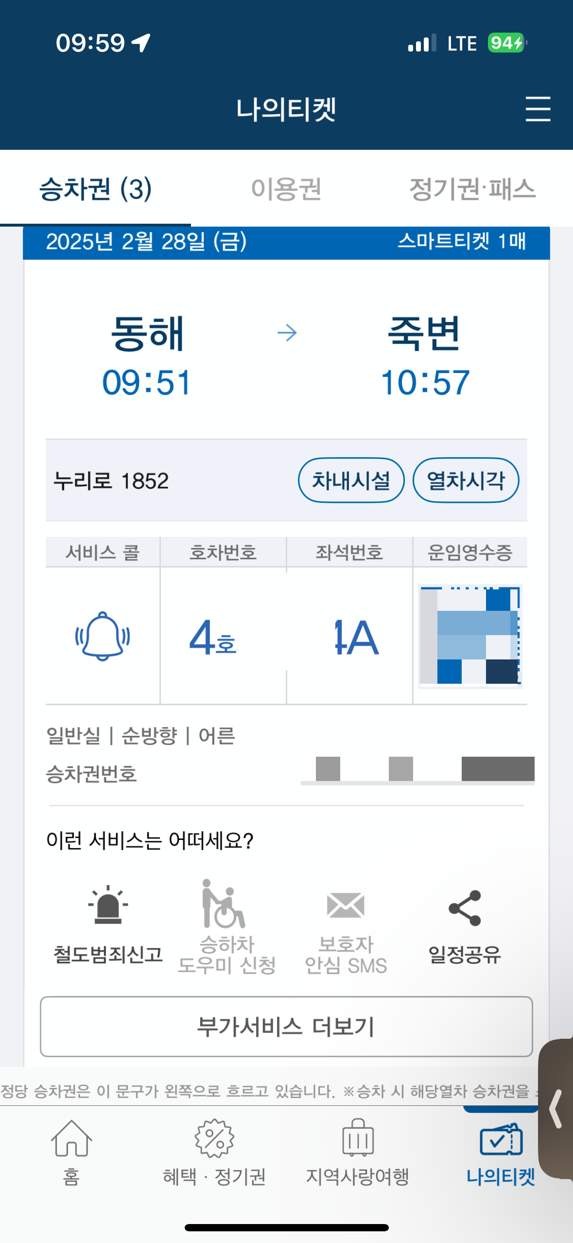 약 10분도 되지 않은 환승시간이라 혹시 열차가 지연되서 못타면 하고 걱정도 되었는데요. 다행히 지연되서 도착하지 않았습니다. 정확히 9시 40분에 도착했고 누리로 열차도 제시간에 맞춰서 동해역에 도착했습니다. 올해부터인가 코레일앱에서 승차권 캡쳐가 되지 않도록 완전히 차단이 되었는데요. 원래 아이폰 기준으로 캡쳐가 되다보니 블로그 하면서 인증을 했었습니다. 하지만 이제는 캡쳐 할 경우 QR코드와 함께 무인승차 방지 하기 위해 나오지않도록 했습니다. 당시 2월만하더라도 제대로 기능이 적용안되었는지일부는 화면이 찍히고는 했습니다.