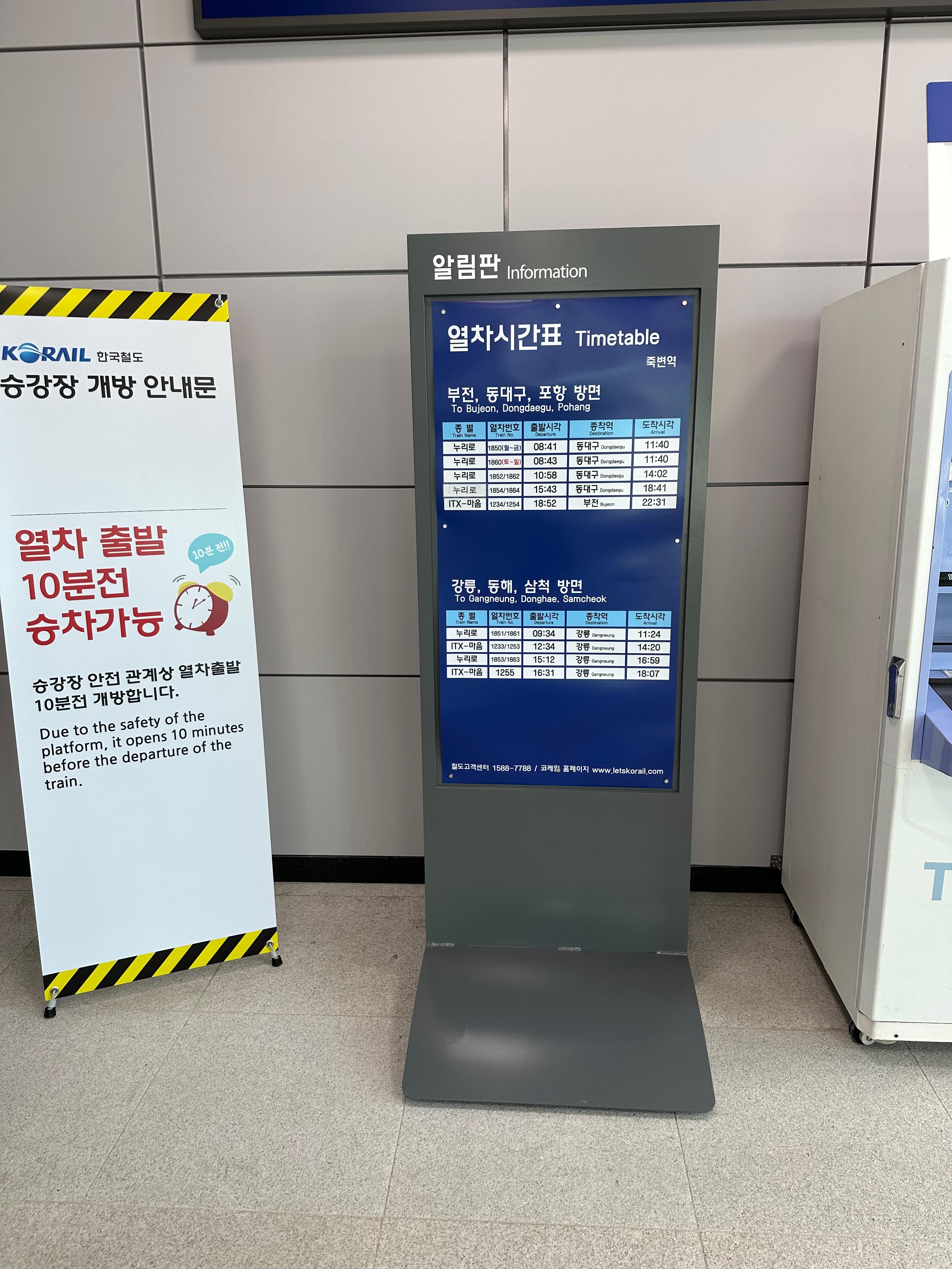 서울과 수도권에서 죽변역까지 당일치기를 하려면 청량리역에서 7시 16분 첫차를 타야 가능한데요. 저는 청량리역에서 7시 16분 첫차를 타고 9시 39분에 도착했는데요. 기차는 대부분 지연없이 정확한 출발시간에 맞춰서 정확하게 도착시간에 도착하는데요. 동해역에서 죽변으로 가는 9시 47분 누리로 열차를 타야 했습니다.