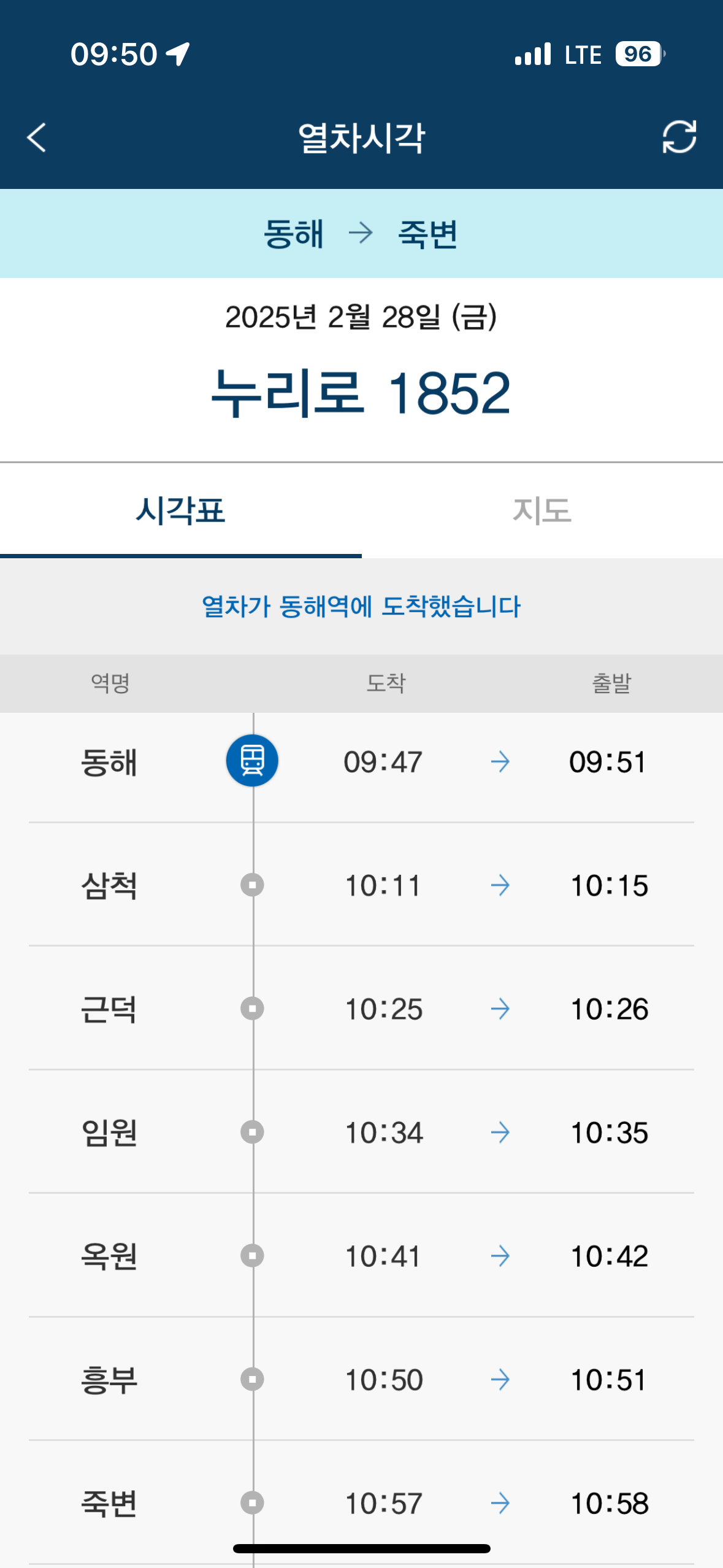 약 10분도 되지 않은 환승시간이라 혹시 열차가 지연되서 못타면 하고 걱정도 되었는데요. 다행히 지연되서 도착하지 않았습니다. 정확히 9시 40분에 도착했고 누리로 열차도 제시간에 맞춰서 동해역에 도착했습니다. 올해부터인가 코레일앱에서 승차권 캡쳐가 되지 않도록 완전히 차단이 되었는데요. 원래 아이폰 기준으로 캡쳐가 되다보니 블로그 하면서 인증을 했었습니다. 하지만 이제는 캡쳐 할 경우 QR코드와 함께 무인승차 방지 하기 위해 나오지않도록 했습니다. 당시 2월만하더라도 제대로 기능이 적용안되었는지일부는 화면이 찍히고는 했습니다.