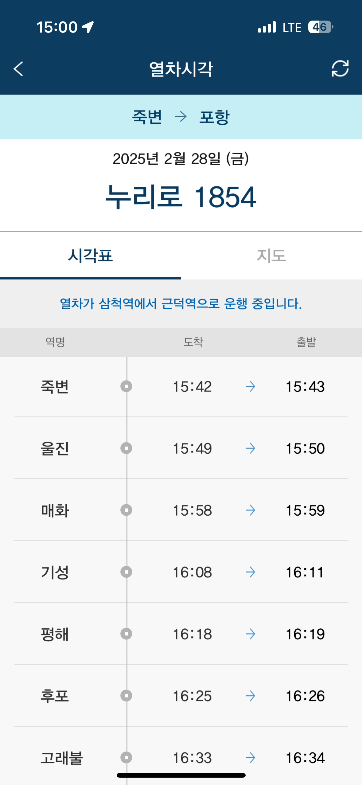 저는 15시 42분에 동대구로 가는 누리로 열차를 탑승했구요. 워낙 정차하는 역이 많아서 시간표에 포항과 동대구까지는 포함되지 않았는데요. 15시 42분에 출발하는 동대구행 누리로 열차는 포항역에 17시 30분쯤에 도착했습니다. 대략 2시간이 조금 걸리지 않은 거리였는데요. 아무튼 시간이 많이걸렸습니다. 생각해보면 누리로 열차가 ITX 마음열차에 비해 더 많이 정차하는 것을 볼 수 있었고 시간이 더 많이 걸리는 것 같습니다.