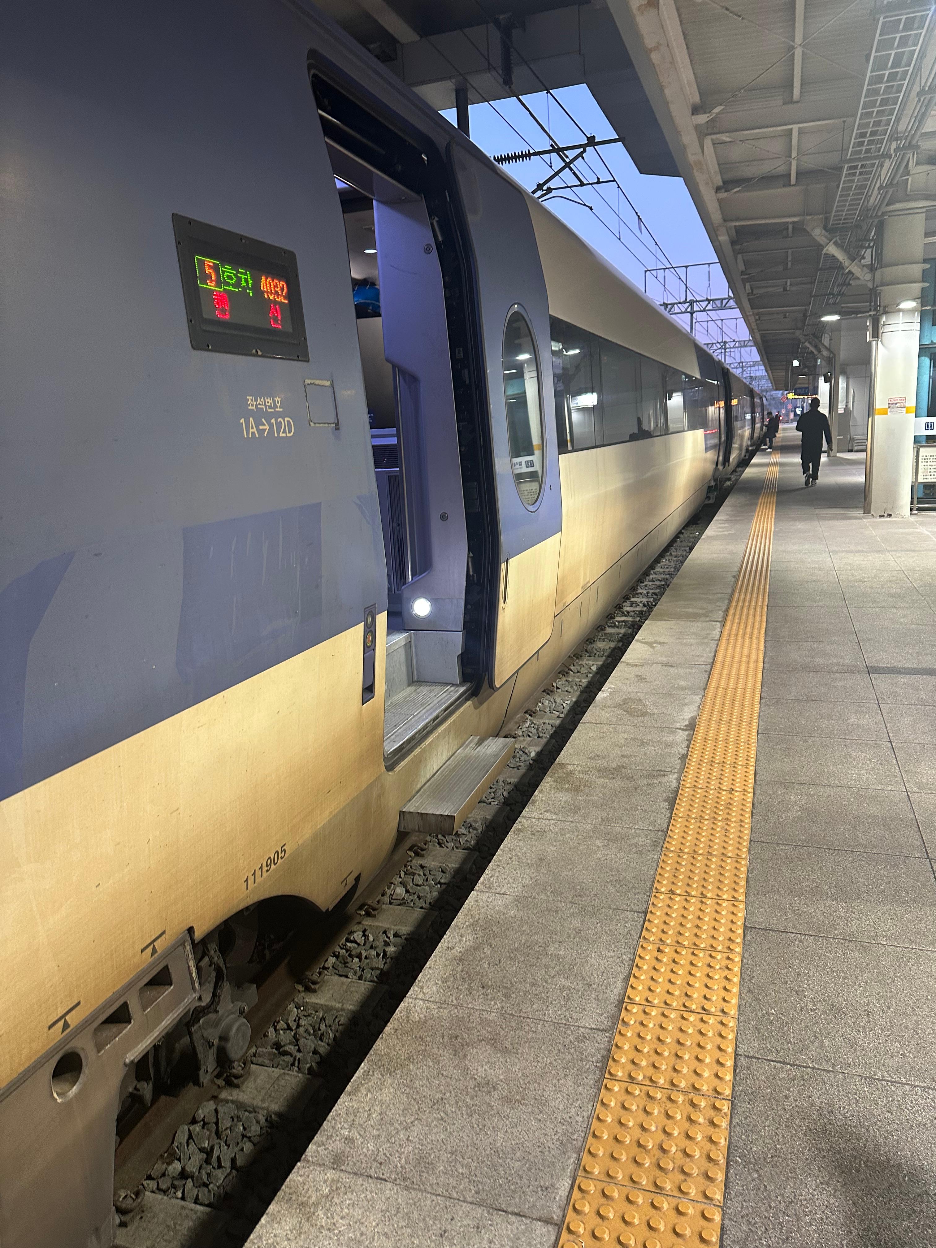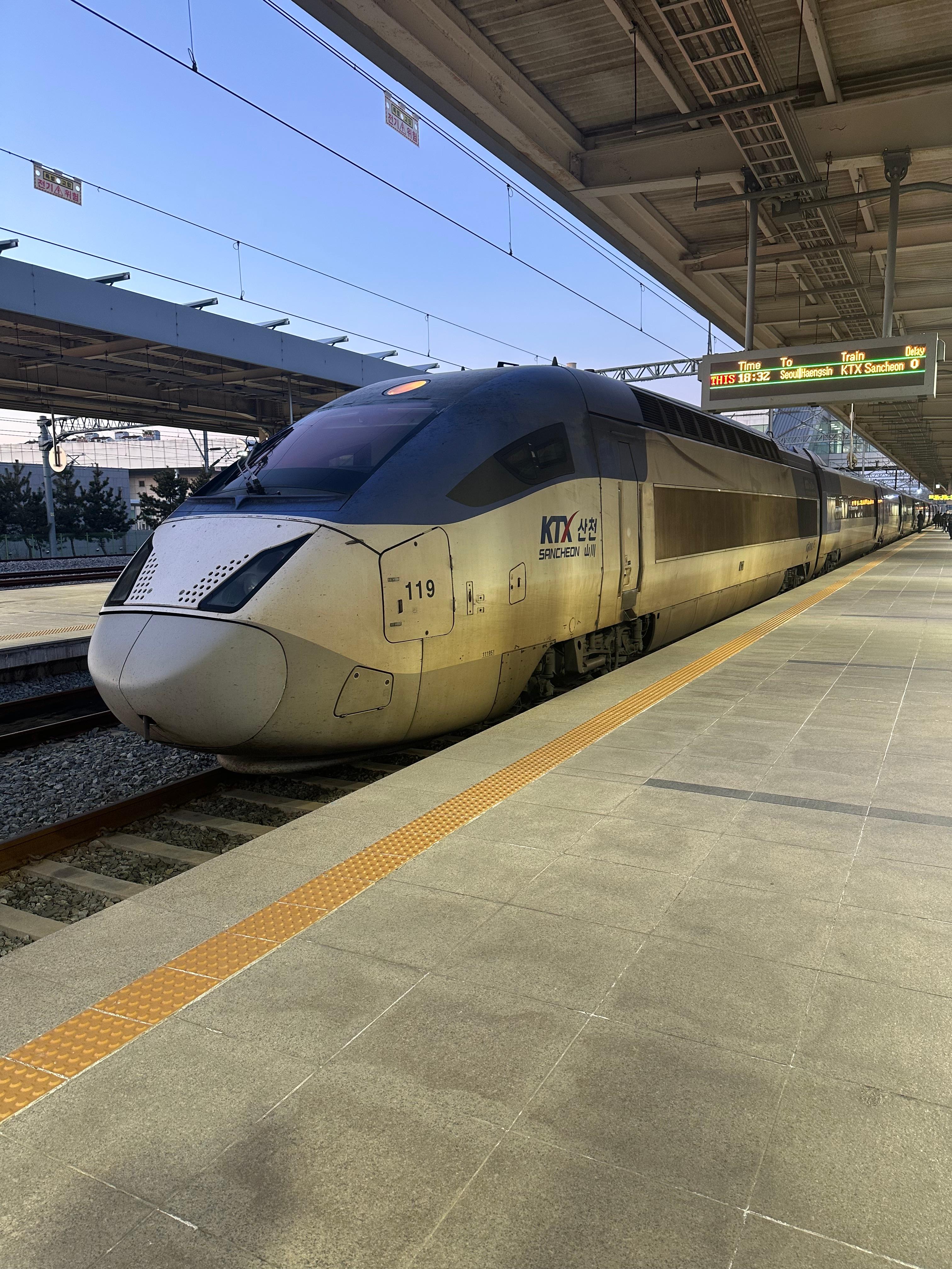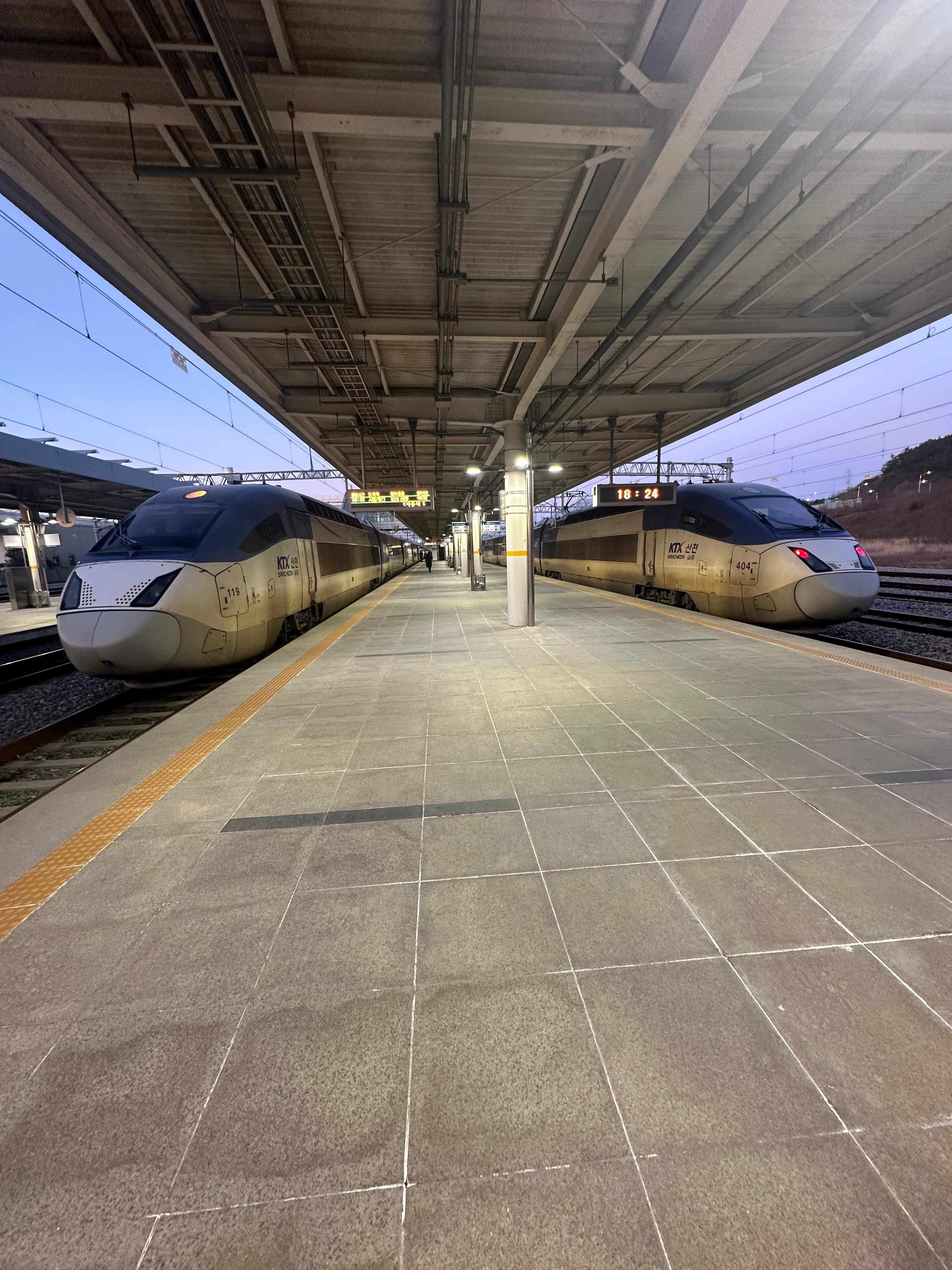 제가 동대구역까지 타고갈 KTX 산천은 18시 32분에 출발하는 4032호 열차였는데요. 시간 맞춰서 승강장에 내려오니까 양쪽에 KTX 산천열차가 있었습니다. KTX 산천열차는 지난 2024년 5월에 목포까지 간닥도해서 한번 소개해드렸는데요. 당시 목포까지 저렴한 가격대가 있어서 익산 이후로는 고속선을 이용하는줄 알았는데 수원에서 익산, 익산에서 목포까지 모두 일반선을 이용하다보니 시간이 정말 많이 걸렸던기억이 있습니다.