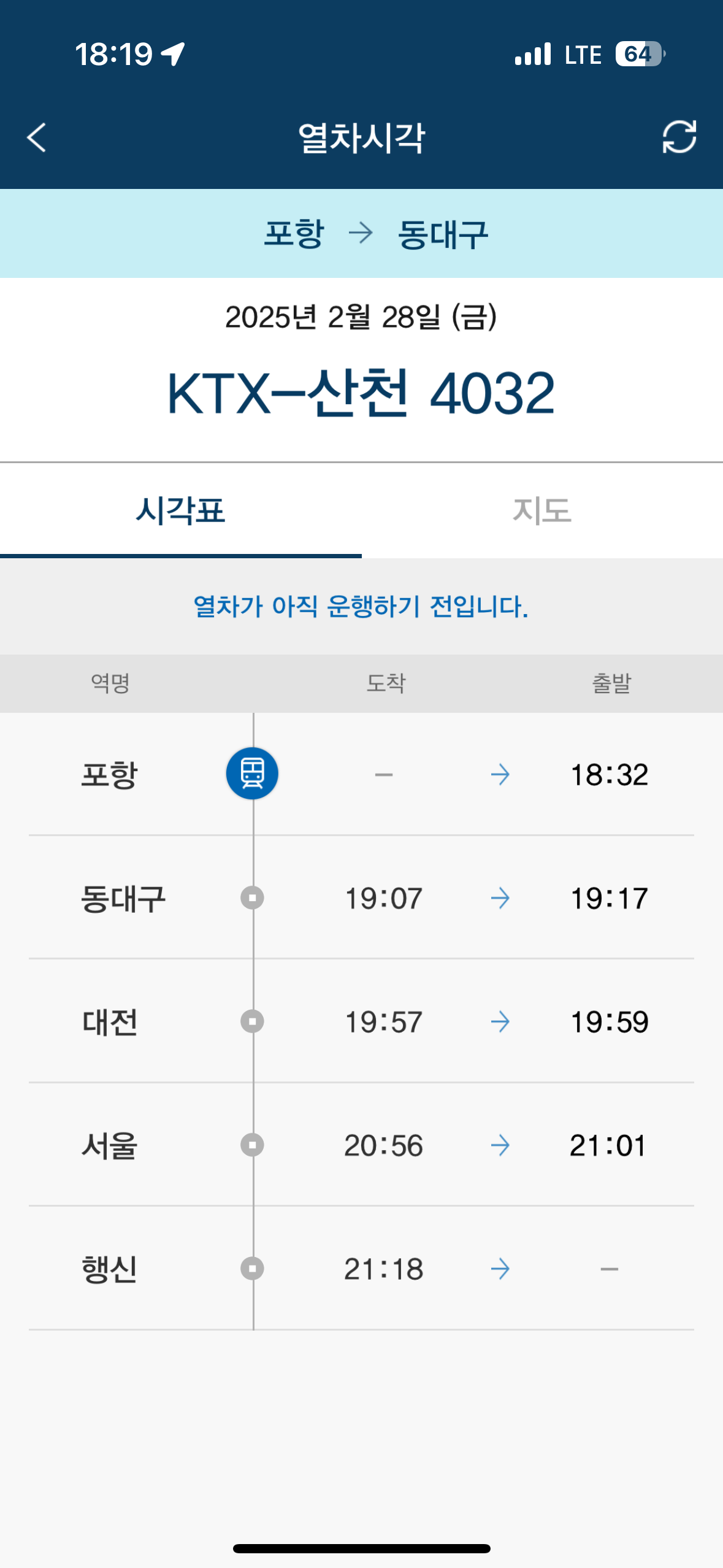 포항역에서 KTX를 탑승할때만 하더라도 한참 일몰이 지는 시간이었는데요. 30분 넘게 달리다보니 어느새 KTX 밖의 풍경은 어두워져서 전혀보이지 않게 되었습니다. 포항역에서 동대구역까지는 일반선로를 달리기 때문에 빠른 속도 체감은 하기 어렵습니다. 서경주역을 지나서 건천연결선을 통해 경부선으로 합류해서는 동대구역까지 잠시나마 최고속도로 KTX 산천이 달리는 것을 볼 수 있게 됩니다.