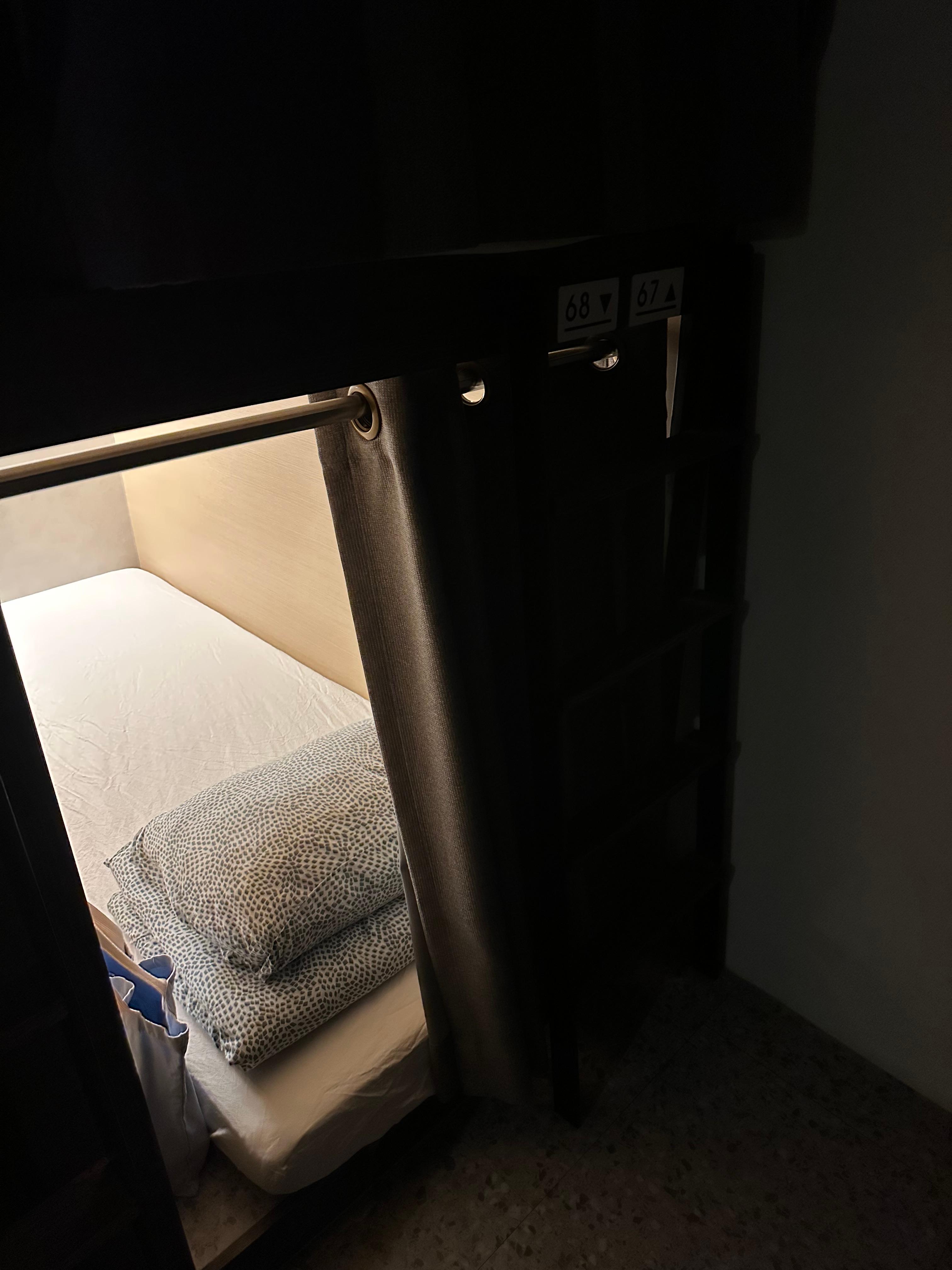 오후 8시가 넘은 시간대라 그런지 제 위에 2층 캡슐은 사람이 없어서 한번 찍어보았는데요. 전반적으로 서울종로큐브 도미토리 객실은 저녁시간에는 약간 어두운 분위기였습니다. 캡슐마다 조명등이 있어서 오히려 아늑하고 자유롭게 불을 켜고 자기만의 시간을 보낼 수 있는 공간이라 더 좋았습니다. 도미토리는 여러 사람이 이용하기 때문에 아무리 프라이버시한 공간이더라도 시끄럽게 즐길 수는 없는데요. 그래도 뚫린 공간보다는 이렇게 캡슐형태의 프라이버시한 공간이 더 즐기기에는 좋은 것 같습니다.