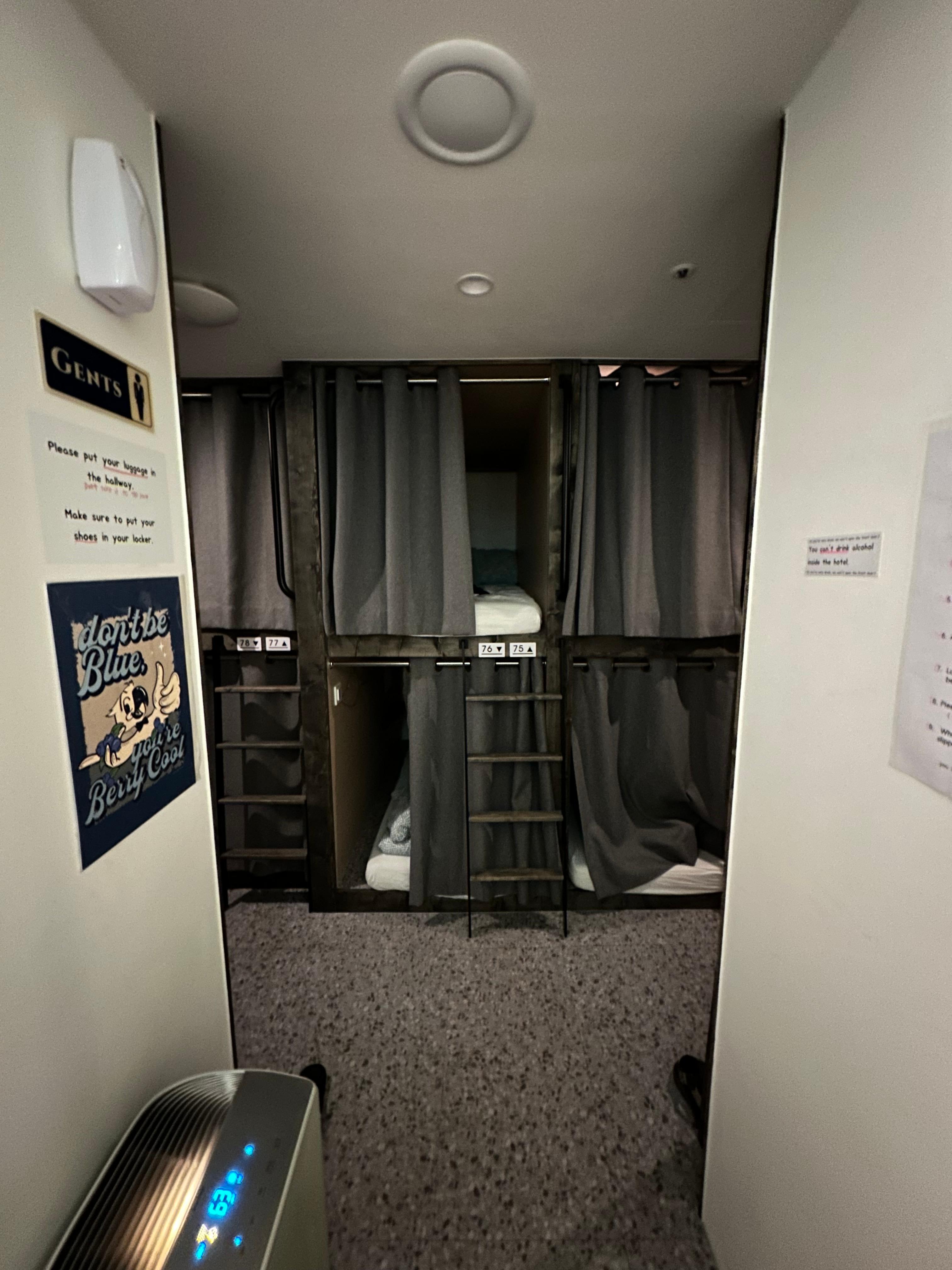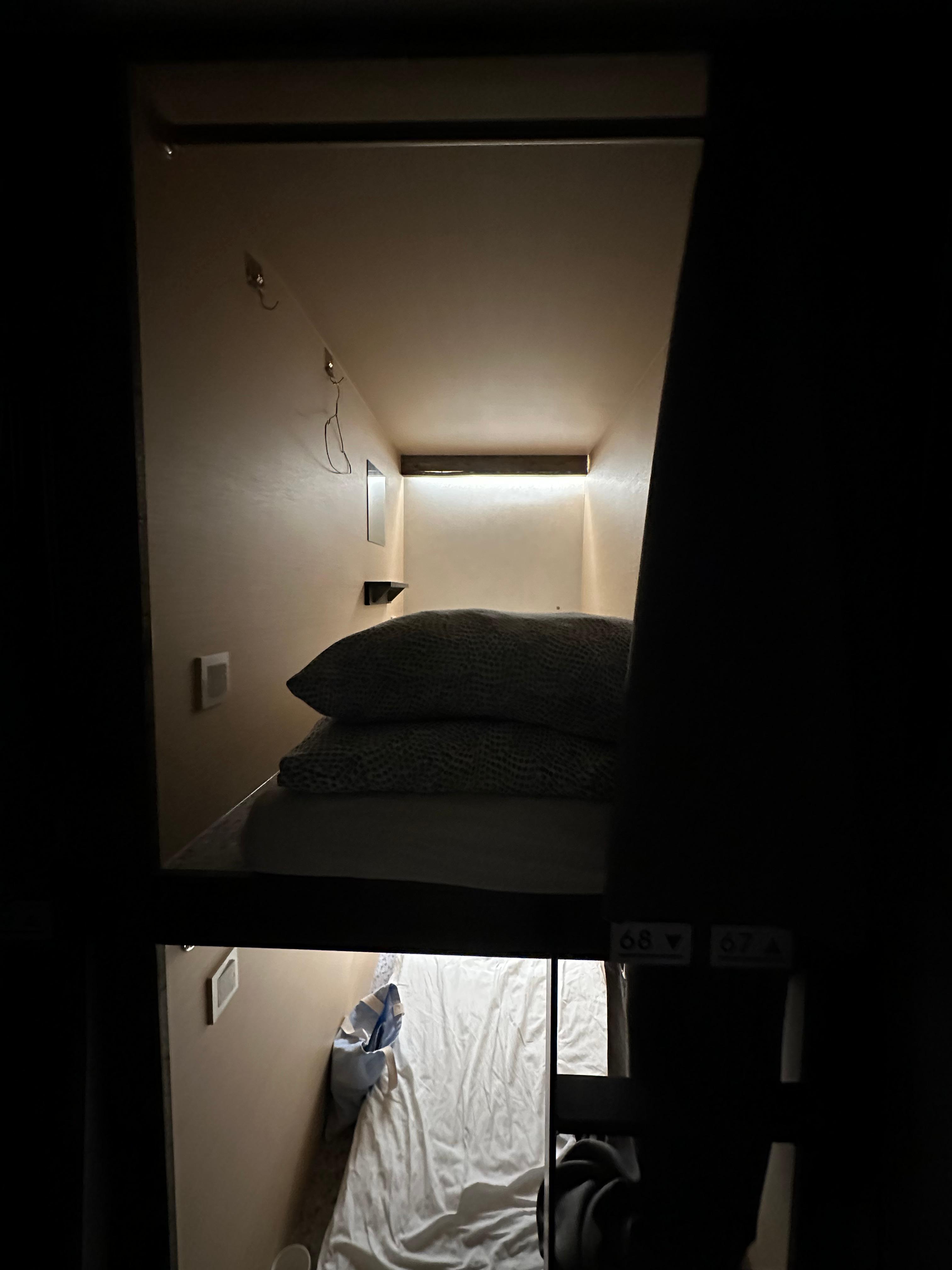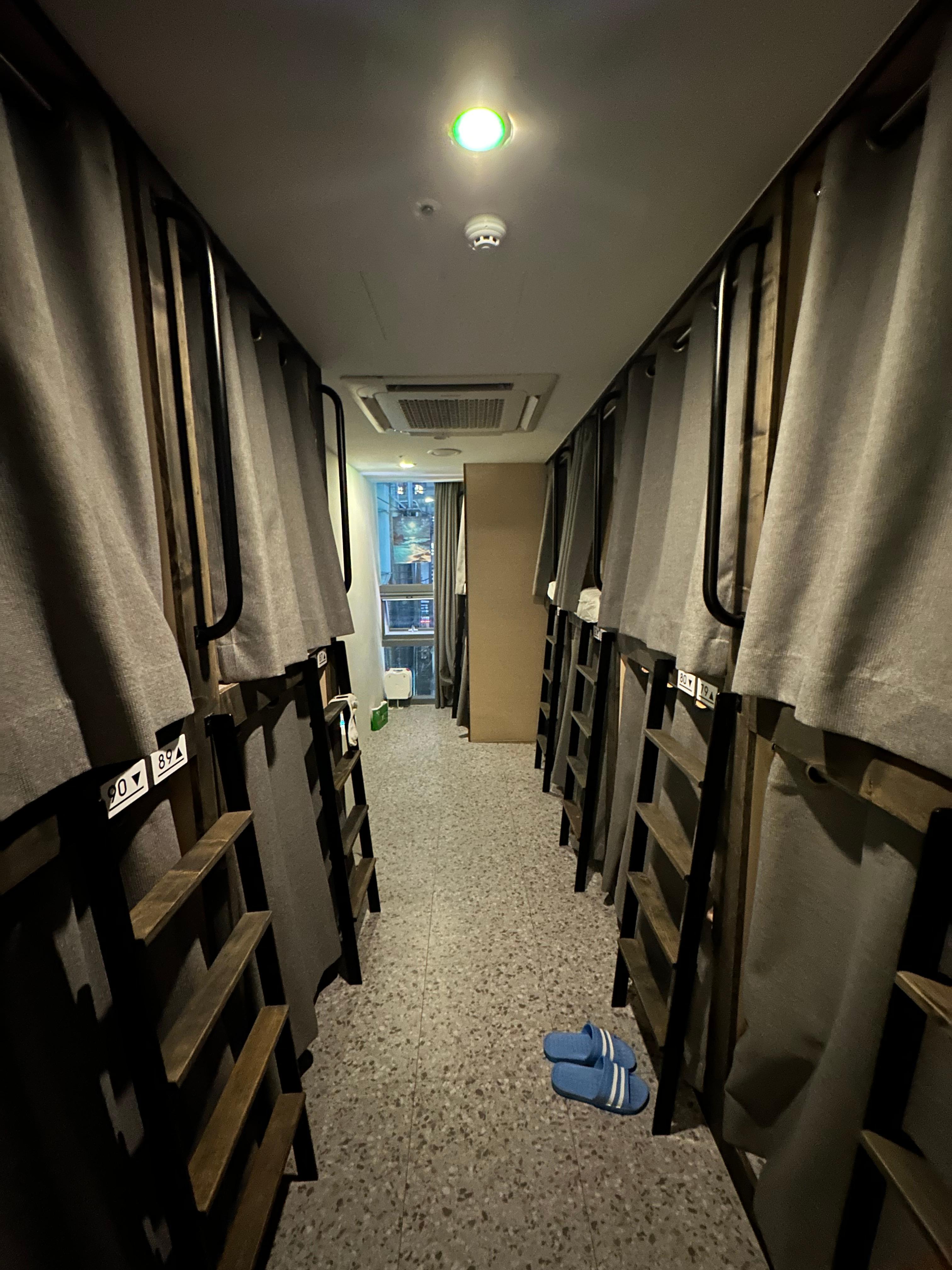 캡슐형태로 1층과 2층 침대로 구성되었는데요. 2층침대가 걸릴 경우 계단을 통해 올라가야하다보니 불편했지만 1층으로 배정받아서 조금 편하게 이용했습니다. 아무래도 평일이라 약간 여유로웠습니다. 일부 캡슐은 비어있는 것도 볼 수 있었습니다.