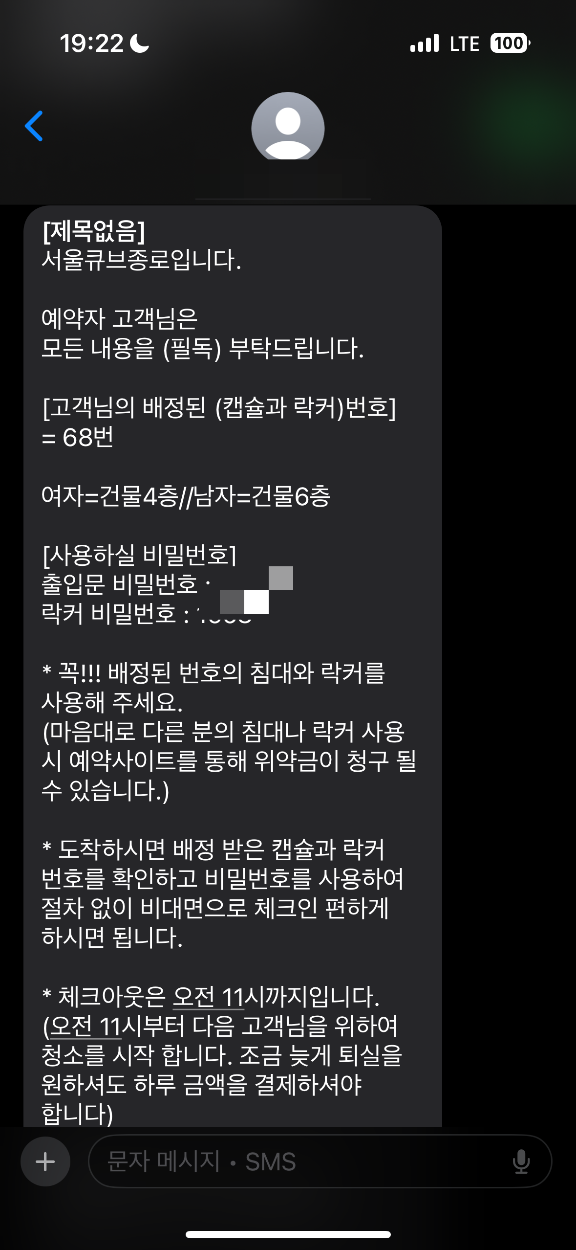 저는 한달전에 방문했을 때도 그리고 재방문 했을 때 모두 네이버 예약을 통해서 예약 했는데요. 네이버 예약으로 할 경우 예약 화면에서 10% 할인쿠폰을 다운받아서 할인을 적용 받을 수 있습니다. 네이버 예약이 아니더라도 야놀자나 그 외 숙박사이트에서 각종 할인을 받을 수 있으니 참고 하시면 좋을 것 같습니다. 그리고 예약을 마치면 예약 당일날 서웅ㄹ큐브종로에서 출입문과 락커 비밀번호 그리고 캡슐 번호를 문자메세지로 전달받게됩니다.