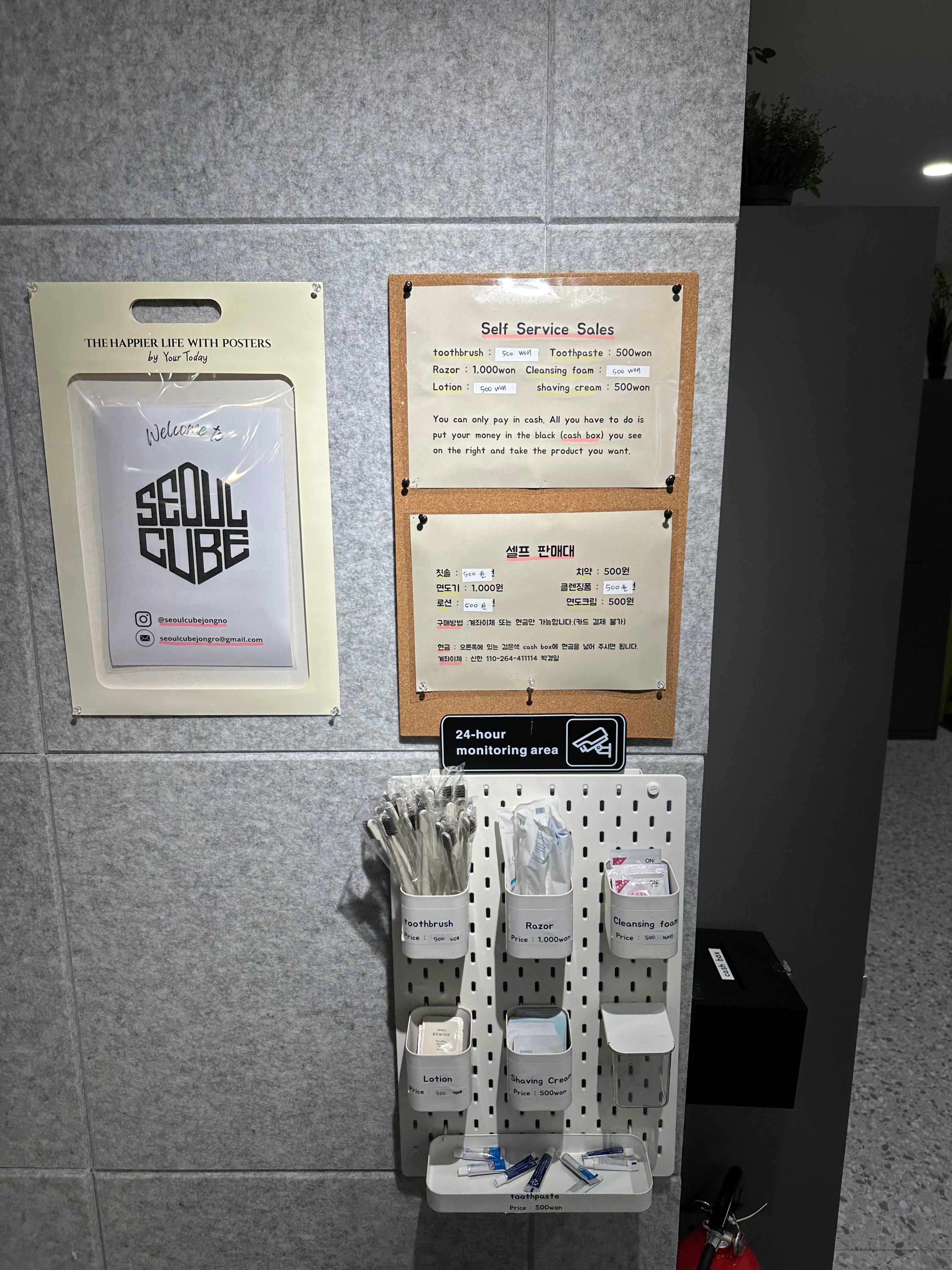 공용공간 한쪽에는 일회용 세면도구도 판매하고 있었는데요. 아무래도 퇴근하거나 잠시 서울에 들려서 숙박을 하는 경우에는 집에서 안가져올 수도 있을 수 있을 것 같습니다. 셀프판매대로 운영되고 있으며 계좌이체 또는 현금으로 양식판매 형태로 운영되고 있었스빈다. CCTV를 통해 모니터링 되고 있기 때문에 그냥 가져다가 쓸 경우 처벌 받을 수 있을 수 있으니 주의바랍니다. 칫솔, 면도기, 로션, 치약, 클렌징폼, 면도크림을 판매하고 있습니다. 기후위기를 생각하면 일회용품은 좋지 않지만 그래도 잠시 머무르는 공간에서는 일회용품만큼 편리한게 없는것같습니다.