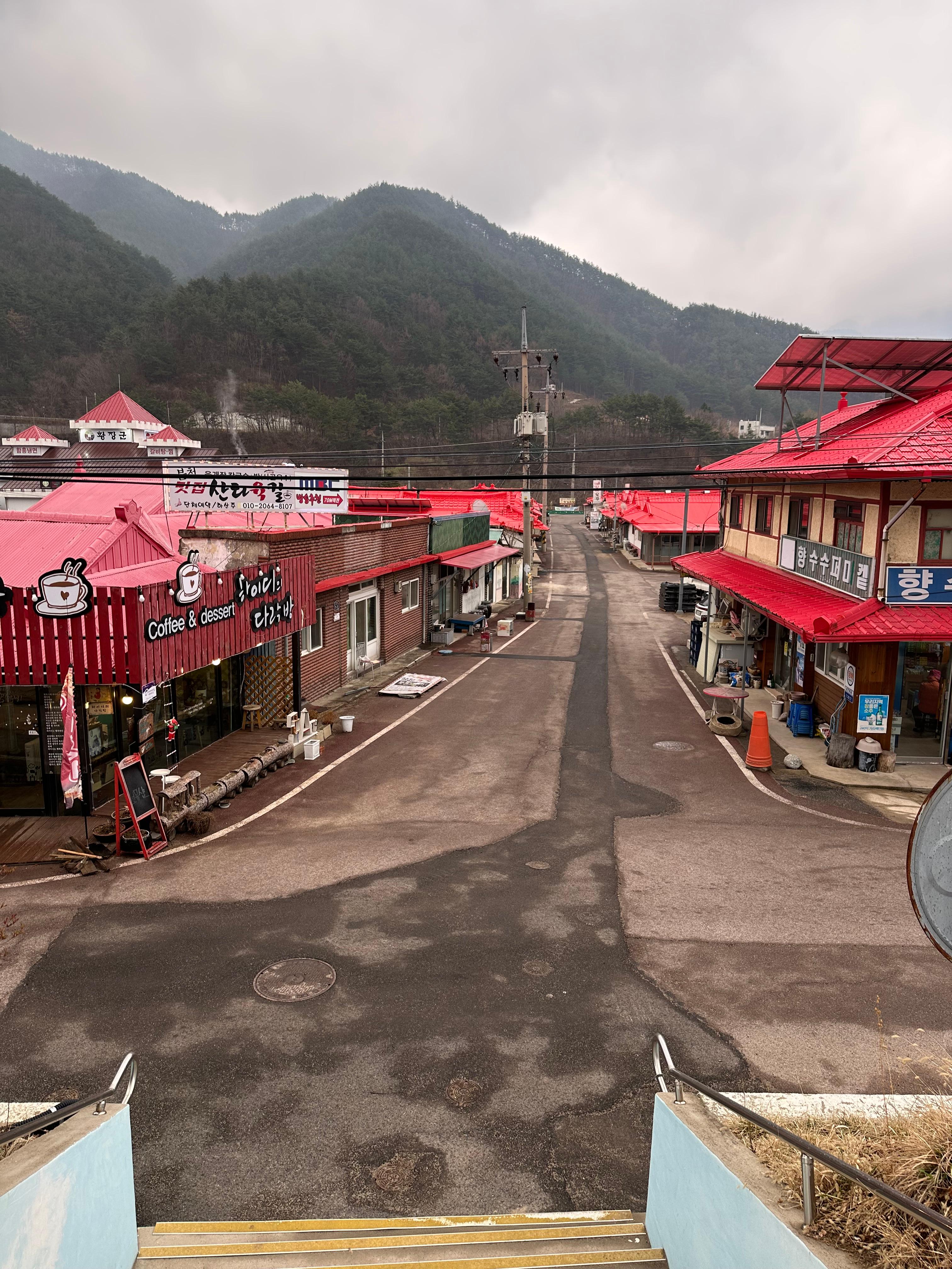 시간이 정말 안가는 기분이었습니다. 분천역까지 이렇게 올라왔는데요. 분천산타마을이라는 이름처럼 마을이 온통 빨간색이며 산타를 인상시키는 느낌 그대로였습니다. 분천역에서 5분도 걸리지 않은 거리에 산타육칼이 있었습니다. 정말 가깝죠? 특히 분천역에는 편의점이 보이지 않고 슈퍼마켓만 있는점도 참고바랍니다. 분천역에서 산타육칼 방향으로 바로 앞에 하이디의 다락방이라는 카페가 있는데요.