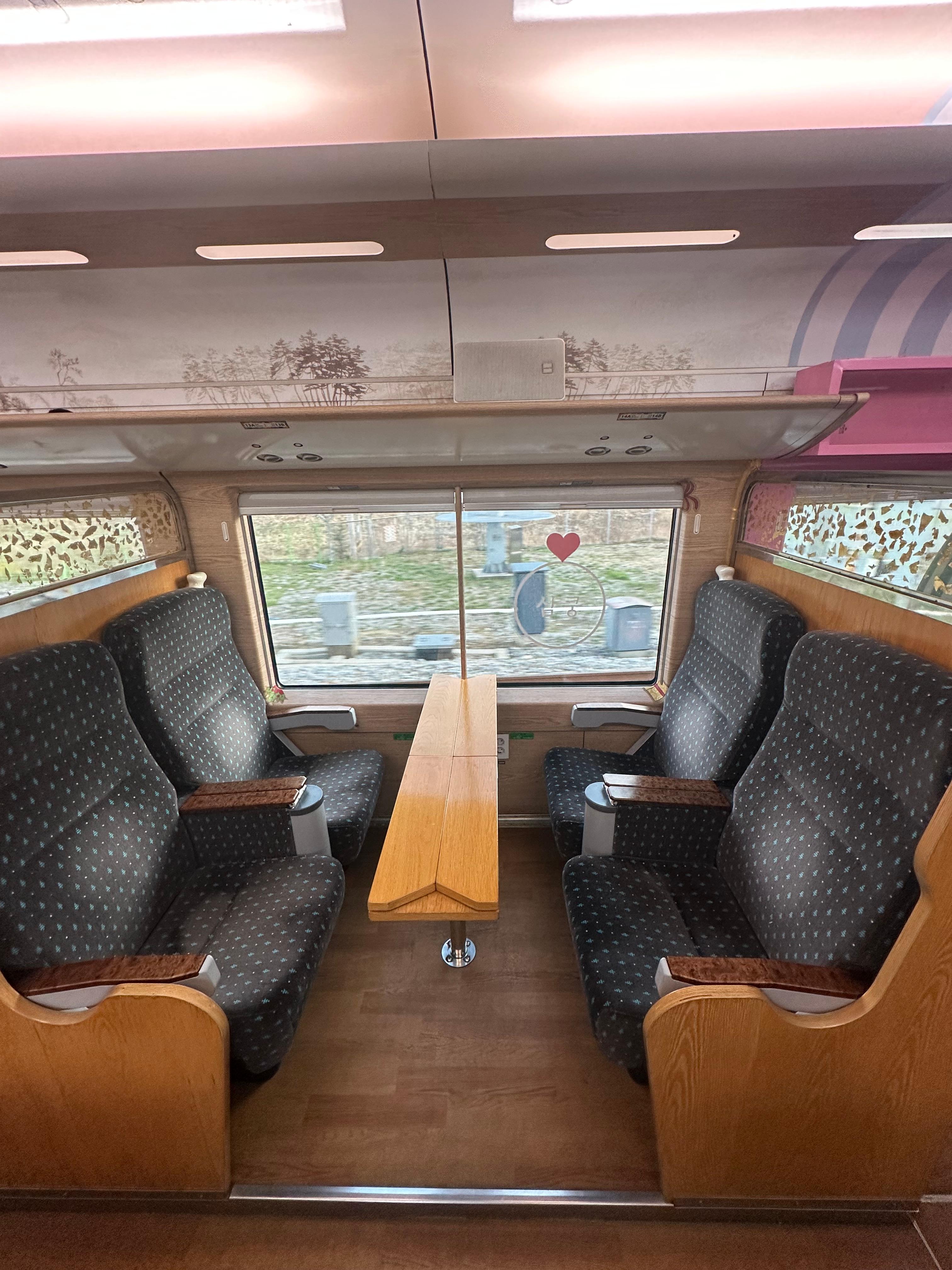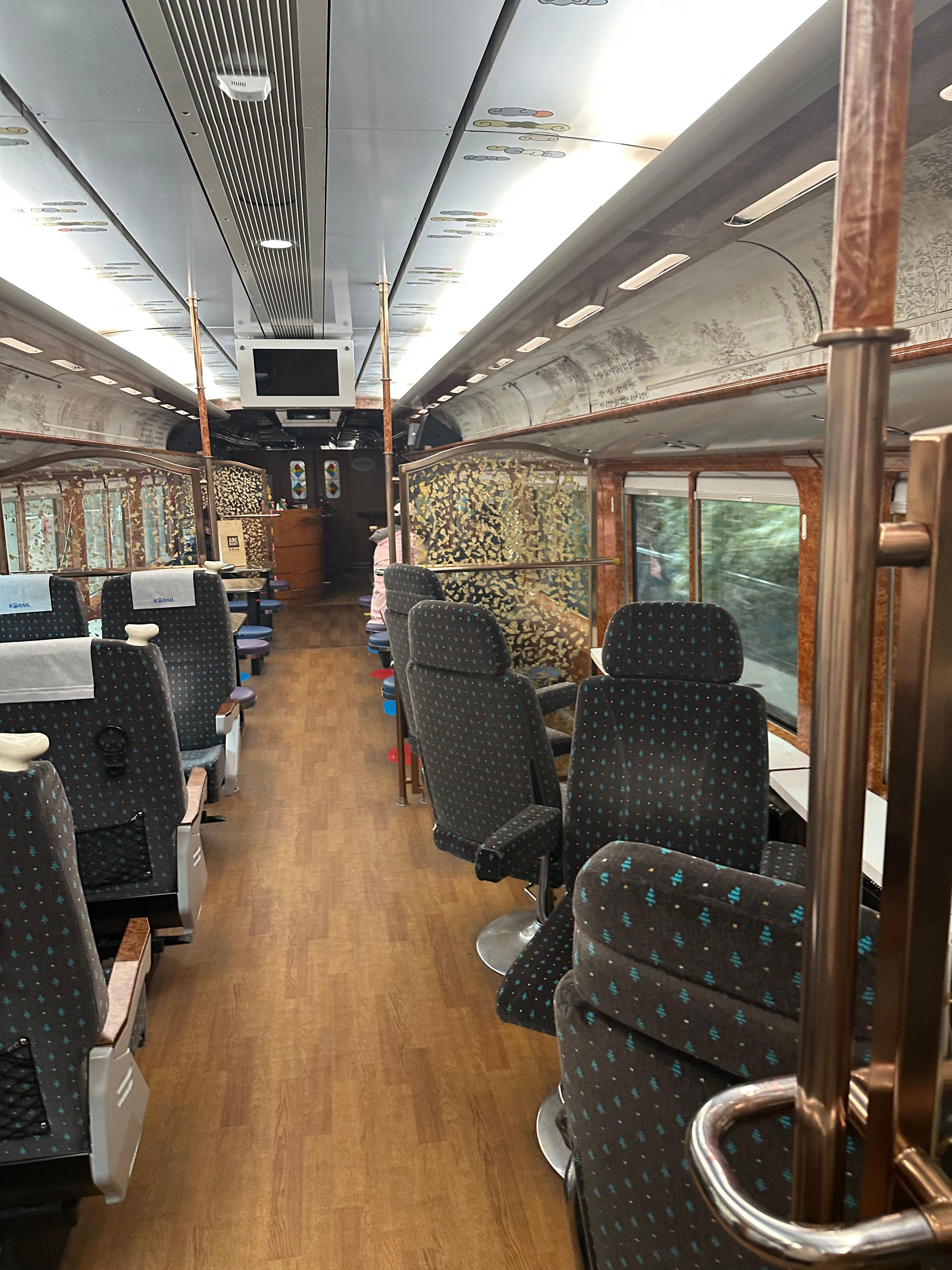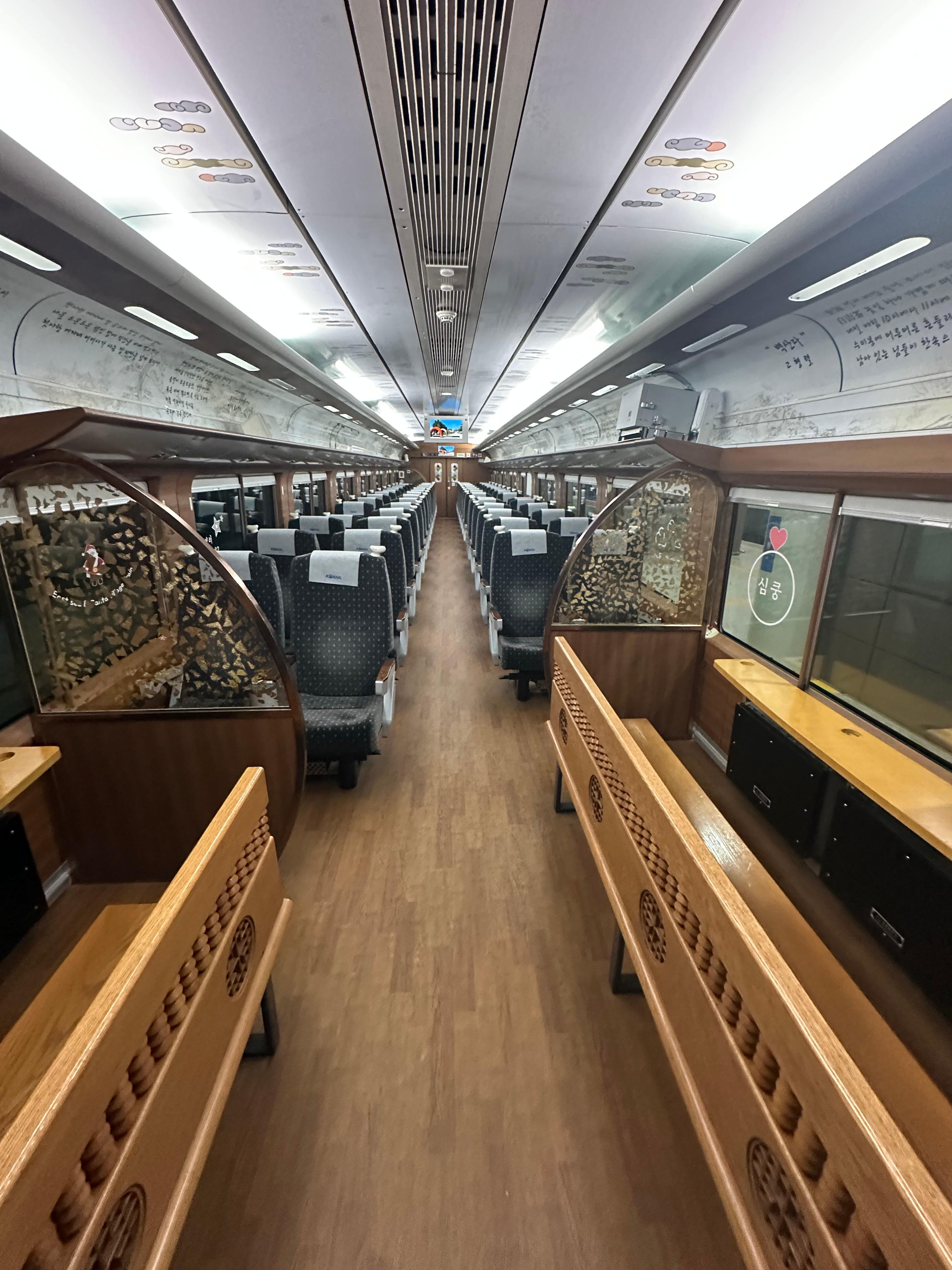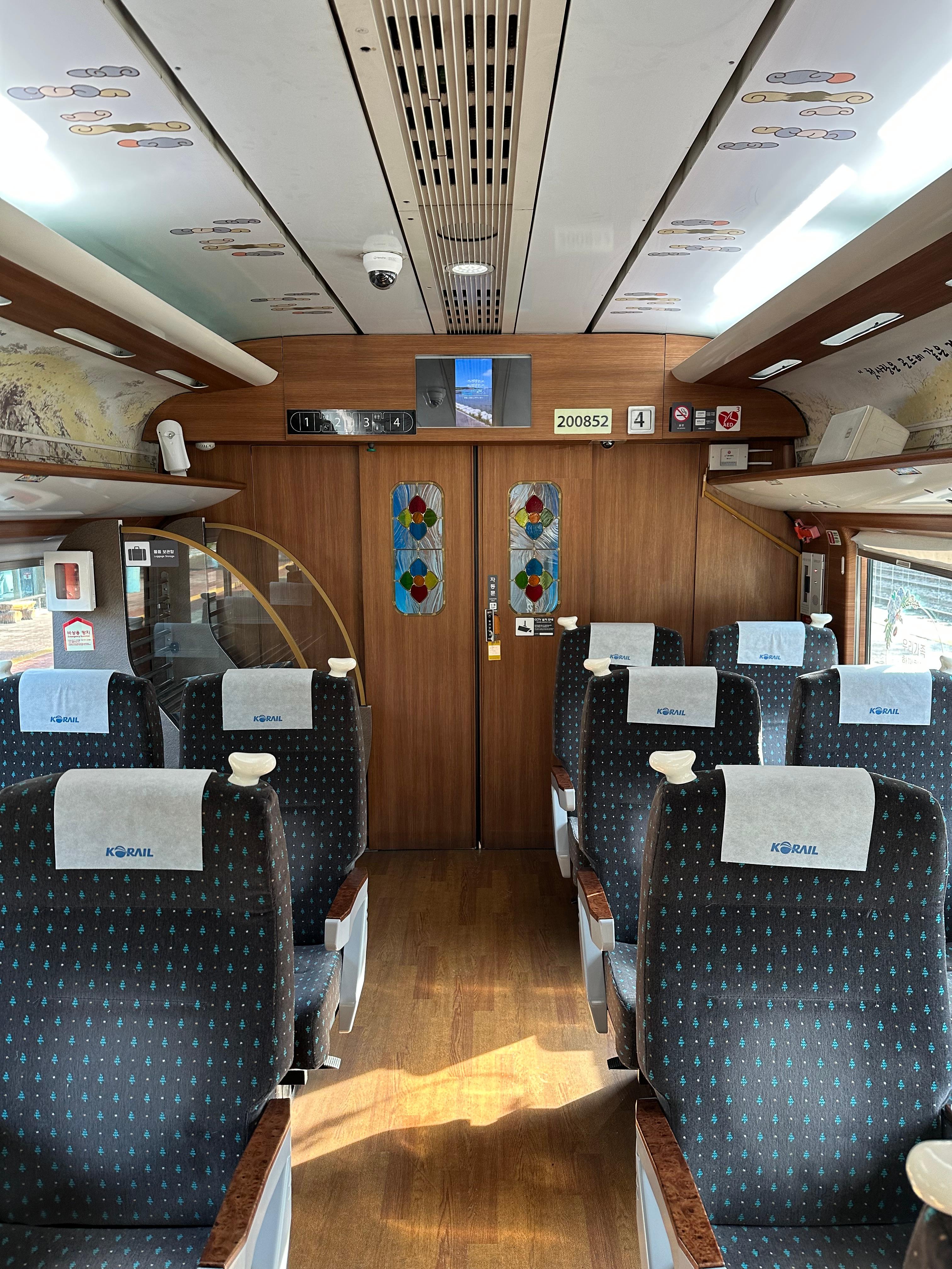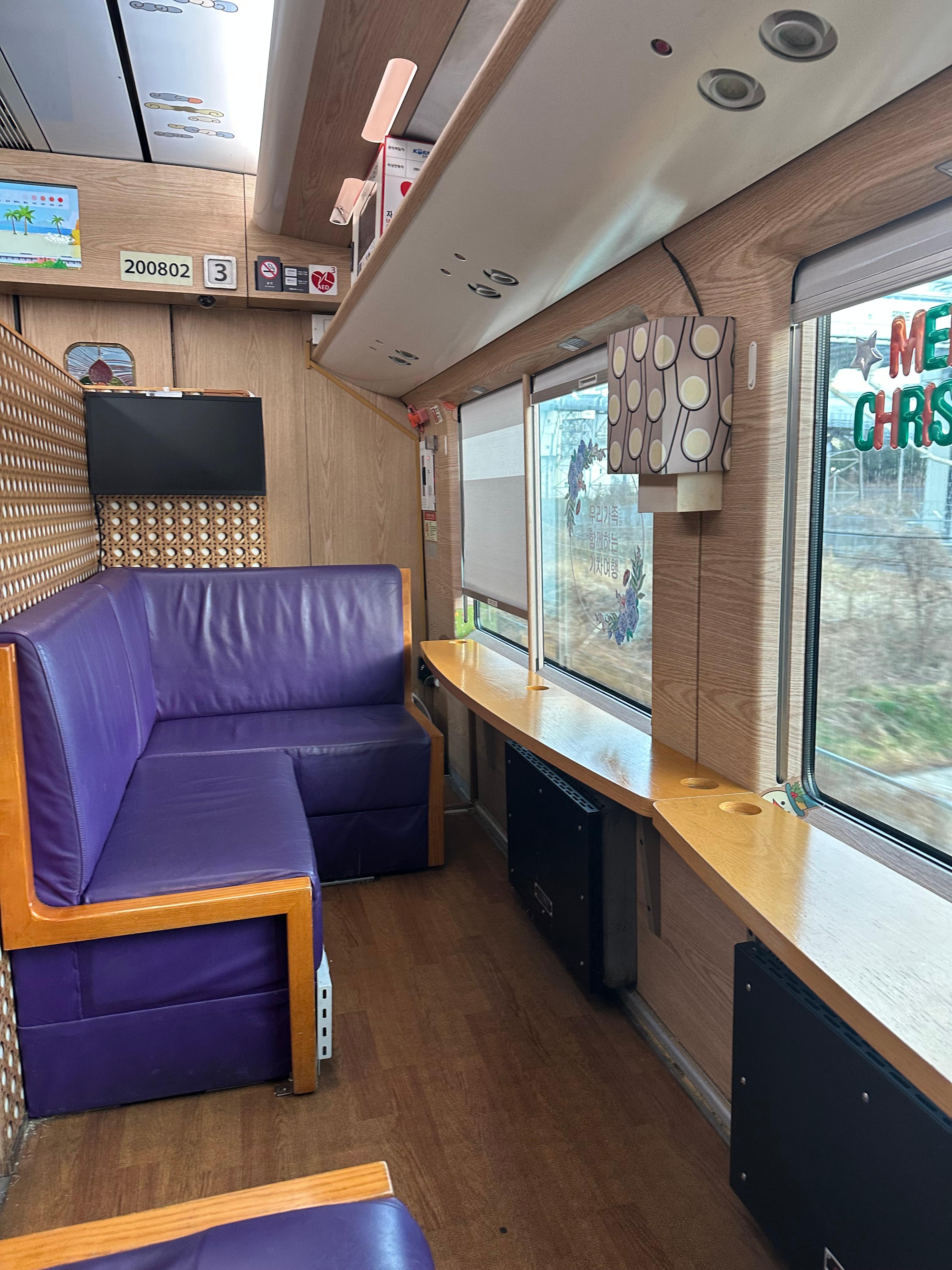 4호차인지 객실차량 몇호인지 정확히 기억은 안나는데요. 일부 객실에는 커플석인지 가족석인지 패밀룸도 아닌 마치 무궁화호 식당칸처럼 자유롭게 구성된 좌석이 있습니다. 마치 피시방 좌석처럼 몇년전 동해 강릉을 달리던 바다열차처럼 창문을 통해 바다를 바라 볼 수 있도록 만들어졌습니다. 이 좌석은 동해산타열차 예매하는 곳에서 따로 선택은 불가능한걸로 보이며 입석으로 이용하거나 좌석이 있더라도 자유롭게 이용할 수 있는 좌석이 아닐까 생각이 듭니다.