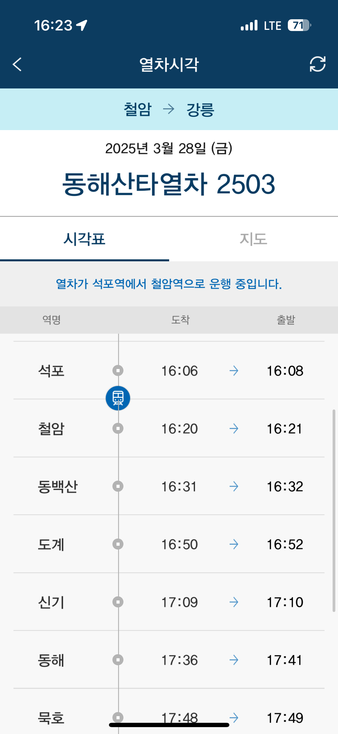 제가 백두대간협곡열차를 타고 먼저 출발하고 그 뒤를 따라오는 열차였습니다. 그리고 철암역에서 16시 21분에 출발하여 강릉역에 18시 25분에 도착하는 약 2시간 정도 소요되는 열차였습니다. 내일로 기차여행때도 경부선, 호남선, 전라선, 경전선을 많이 이용하고 영동선과 태백선은 7일이라는 내일로 기간동안 채우면서 이용하기에는 힘들었는데요. 이번 동해산타열차 통해서 영동선과 태백선 구간을 처음과 같은 느낌으로 이용하게 되었습니다.