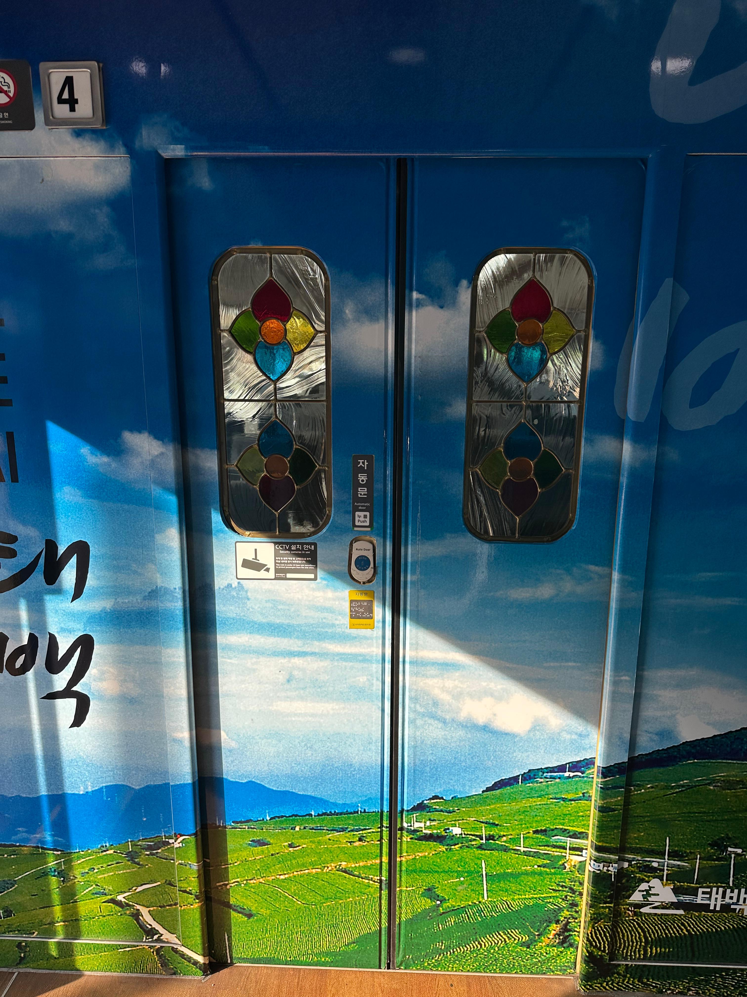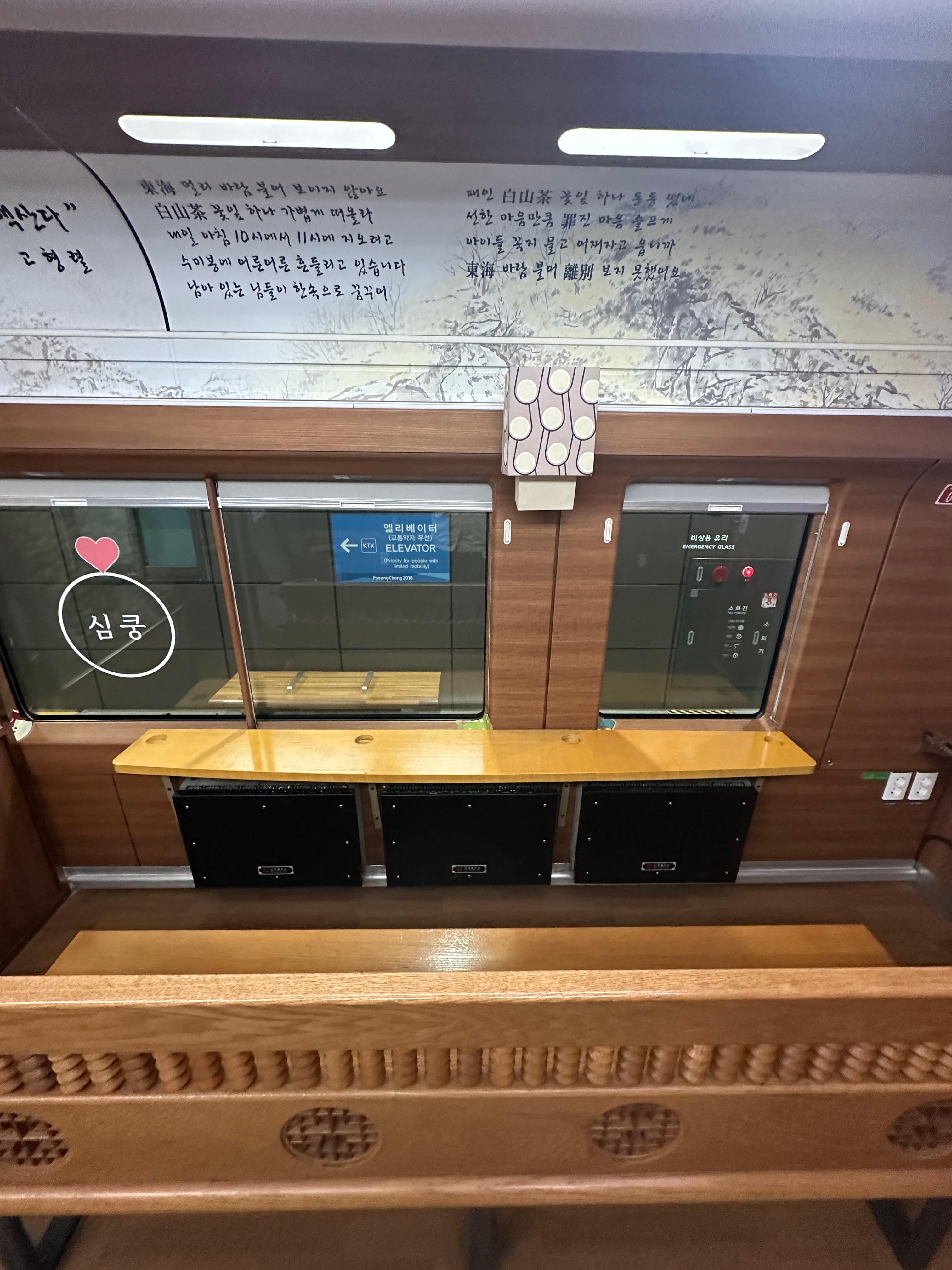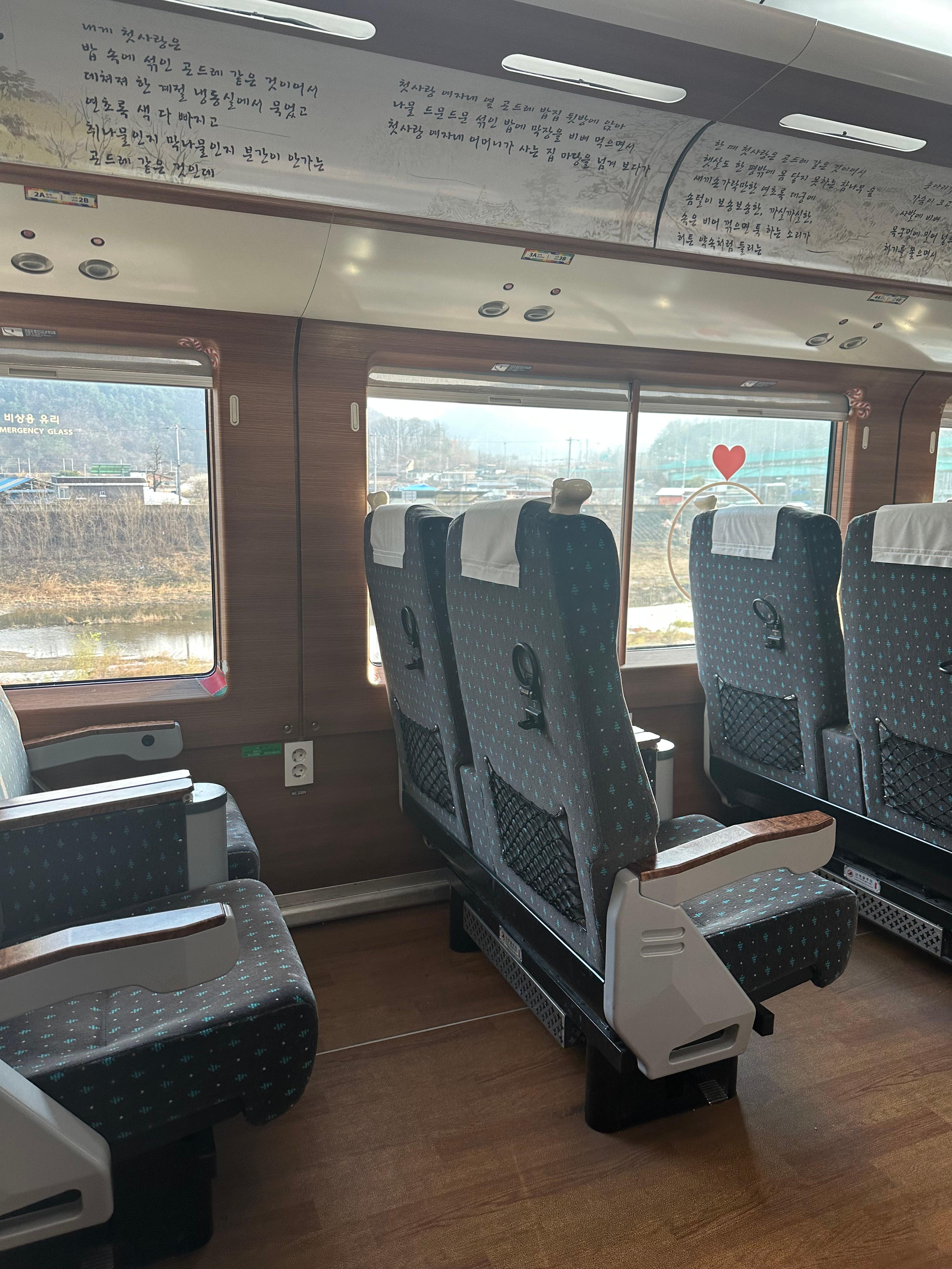 열차 외형과 통로측에서 산타와 크리스마스 분위기를 느낄 수 있었다면 제가 이용했던 객실은 그냥 평범한 누리로 객실에서 조금 꾸며놓은 듯한 느낌이었습니다. 강원도 태백과 강원도 일대 지역 느낌과 정보가 있는 광고가 붙어있는 객실이었습니다. 그러나 확실히 누리로보다는 고급되고 세련된 느낌을 주었습니다.