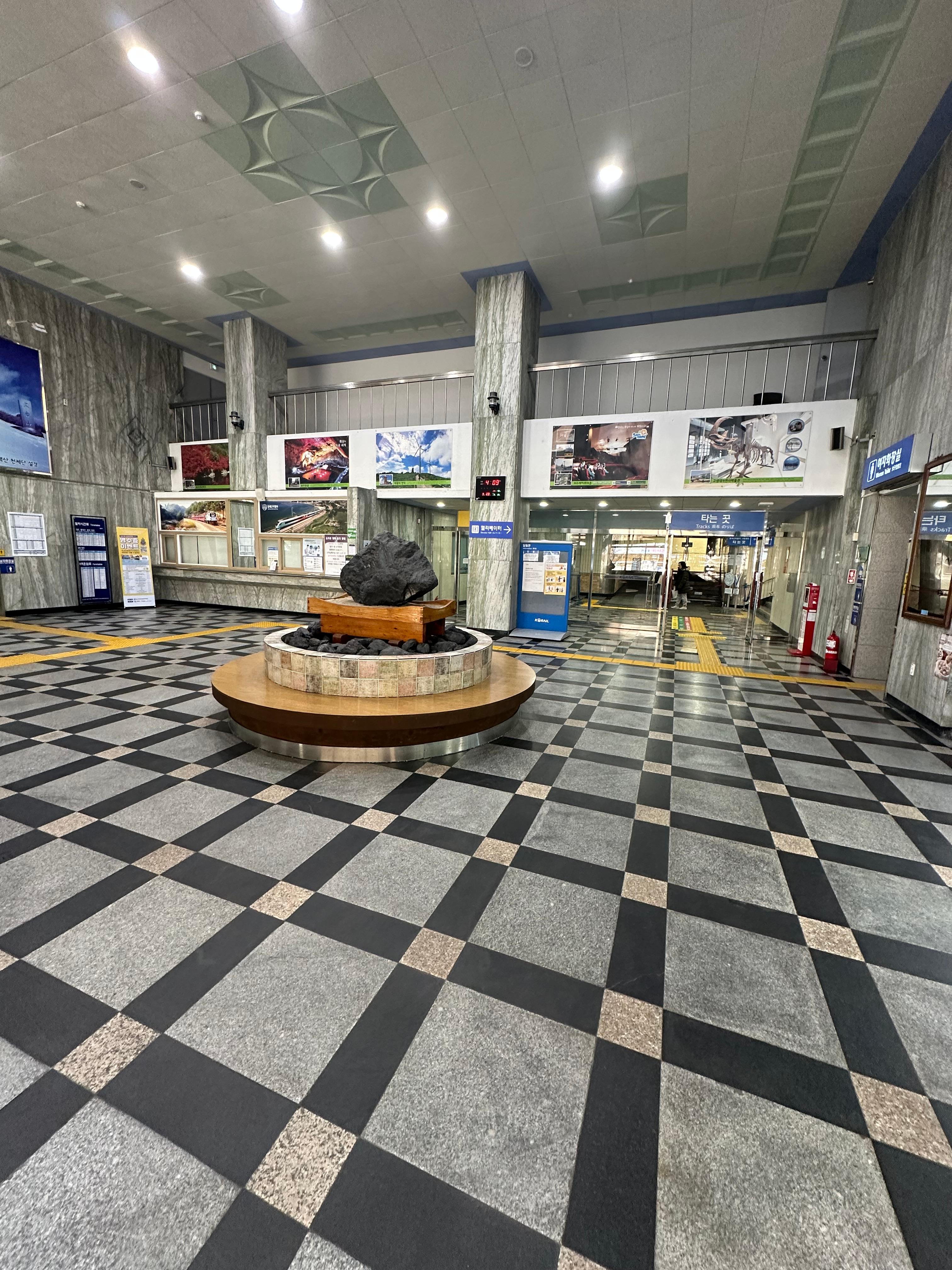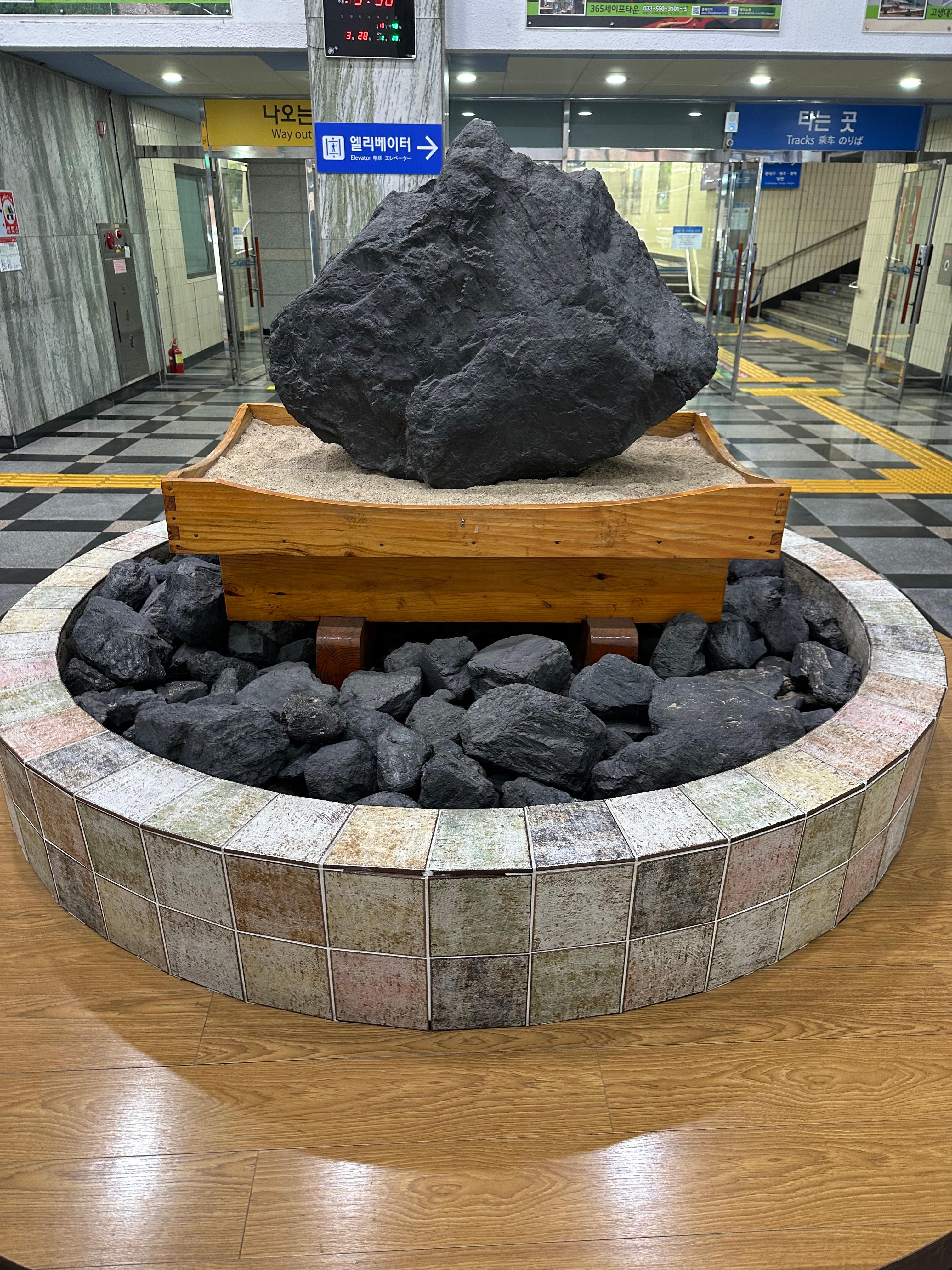 강원도 태백시에 위치한 철암역은 한때는 석탄탄광촌으로 유명한 지역이다보니 석탄역 대합실 한가운데는 석탄 조형물을 볼 수 있습니다. 당시 석탄을 그대로 느낄 수 있도록 검은돌 큰거와 아래에 석탄 여러개가 전시되어있는것을 볼 수 있습니다. 사실 저도 석탄이 활발할 때 태어난 것이 아니고 석탄이 어떤것인지는 티비로만 봤기 때문에 실제 석탄은 어떤지는 볼 수 없었습니다. 철암역은 석탄산업이 죽은 후로는 관광객이 줄었다고 해요. 그리고 제가 타고온 백두대간협곡열차와 동해산타열차로 사람들이 다시 찾기 시작했다고 합니다.