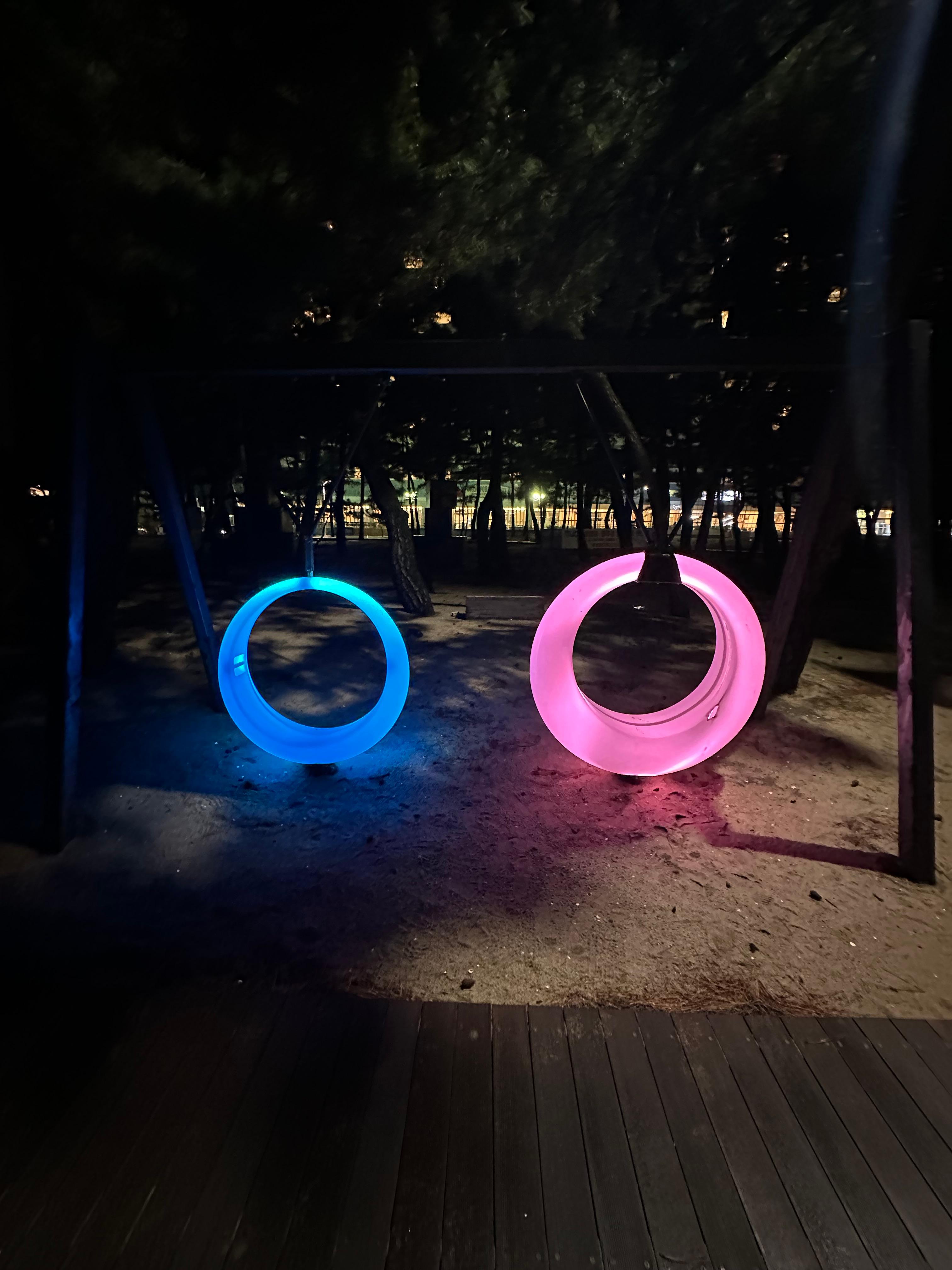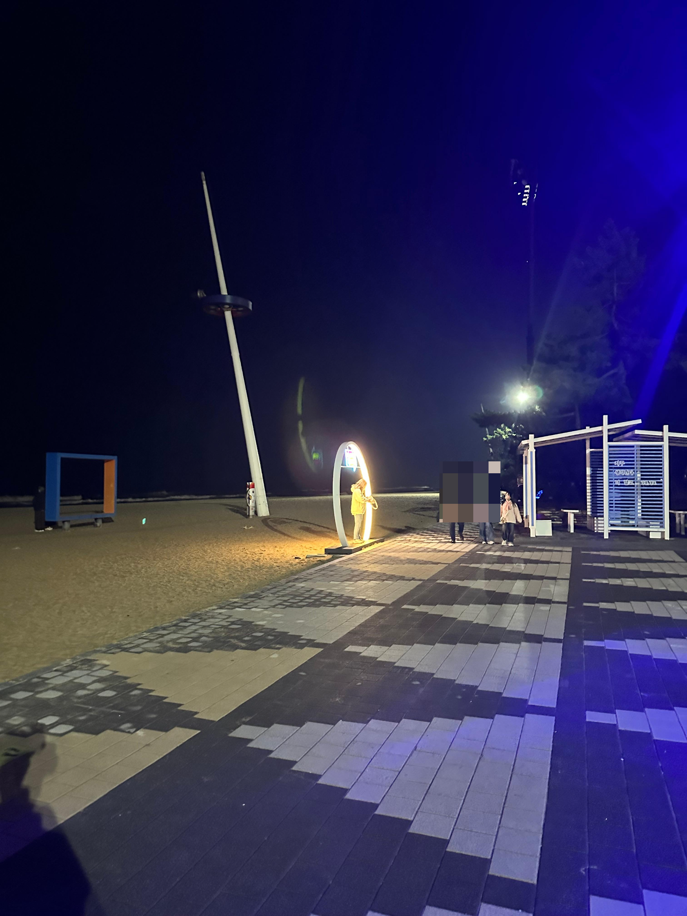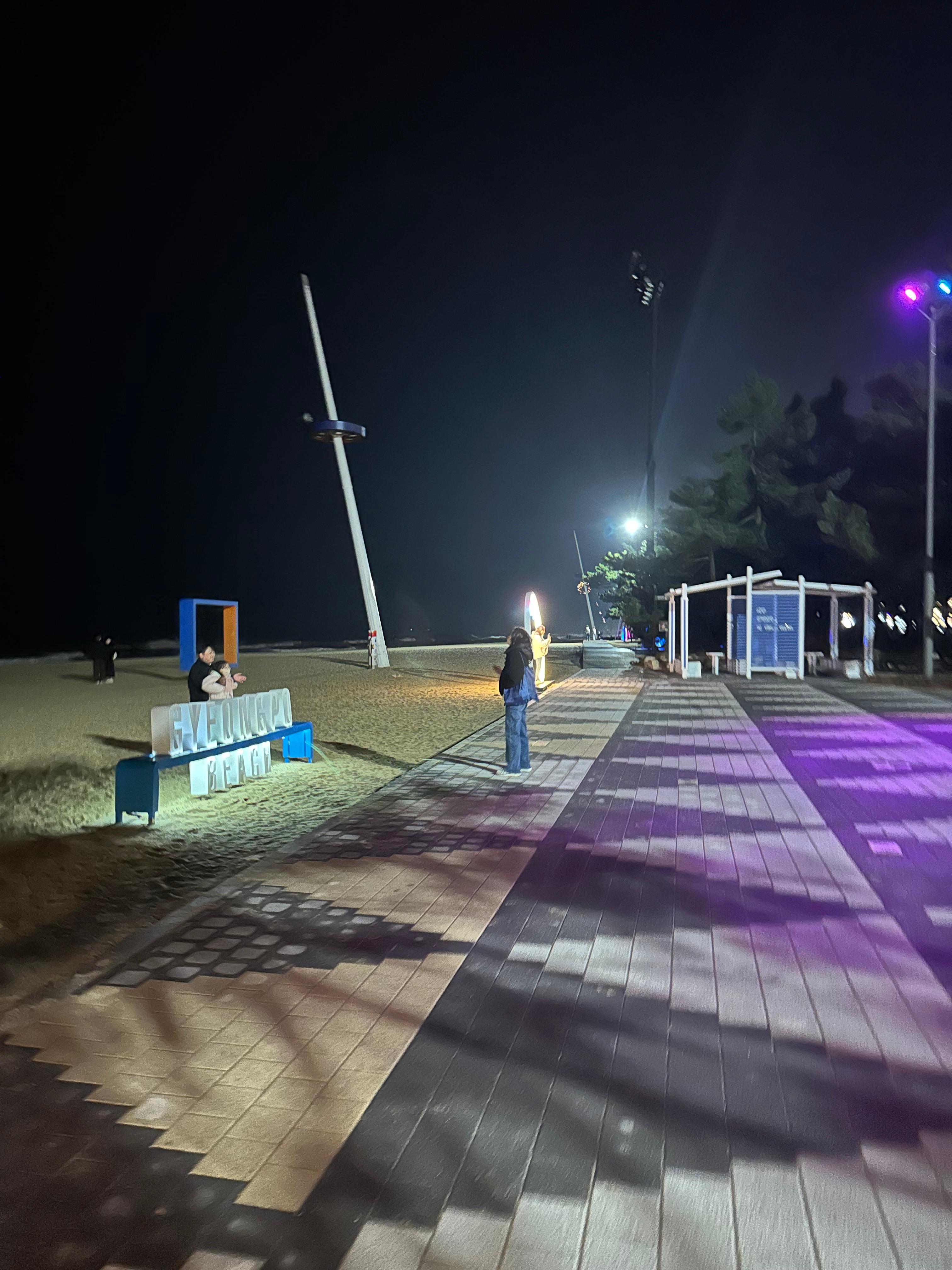 이 조명 마저 보이지 않았다면 바다는 컴컴해서 보이지도 않았을 것 같습니다. 어두운 밤이지만 조명 덕분에 조명과 경포해변 동해바다와 함께 사진이 잘나오는 모습이었습니다.