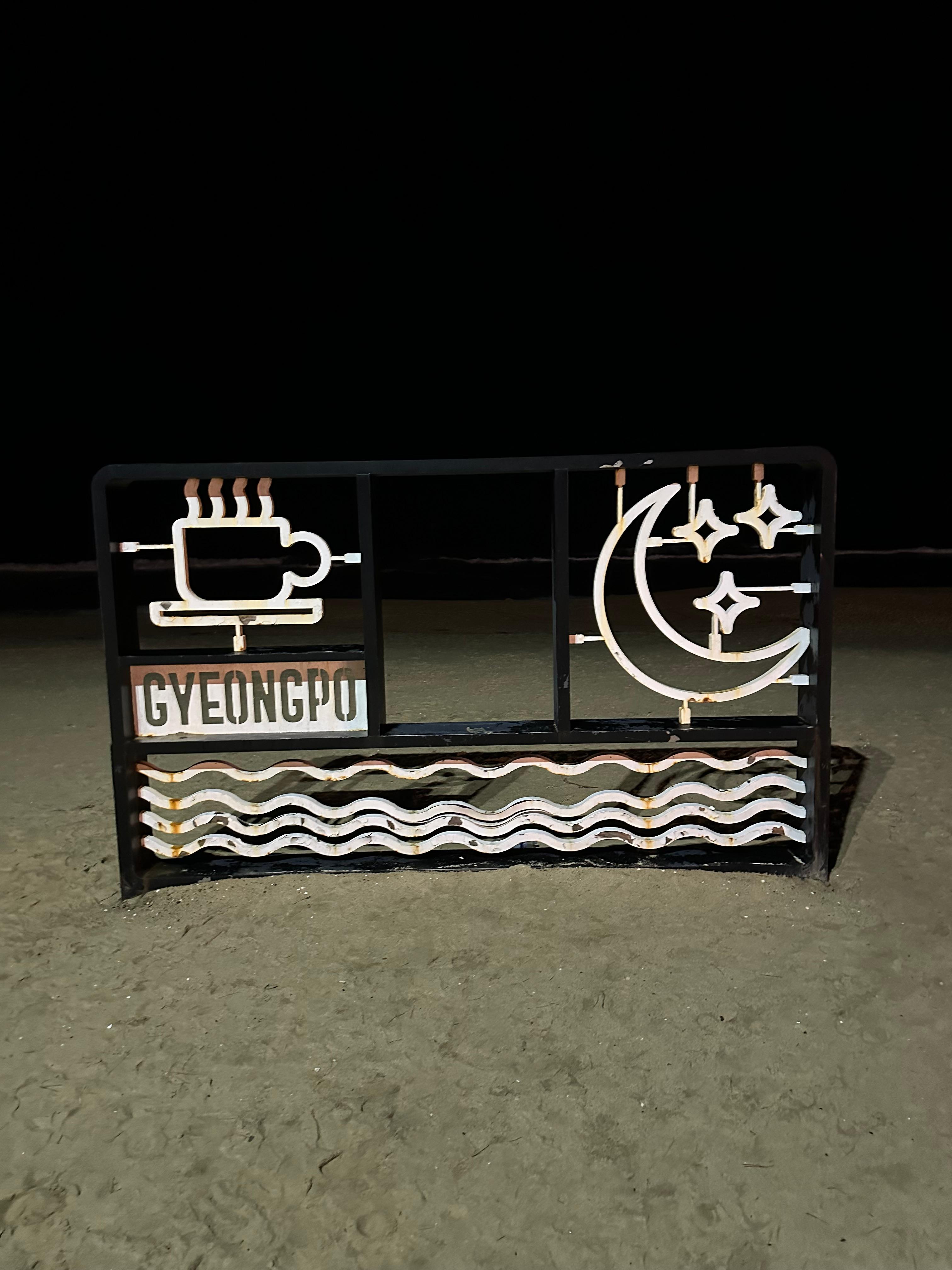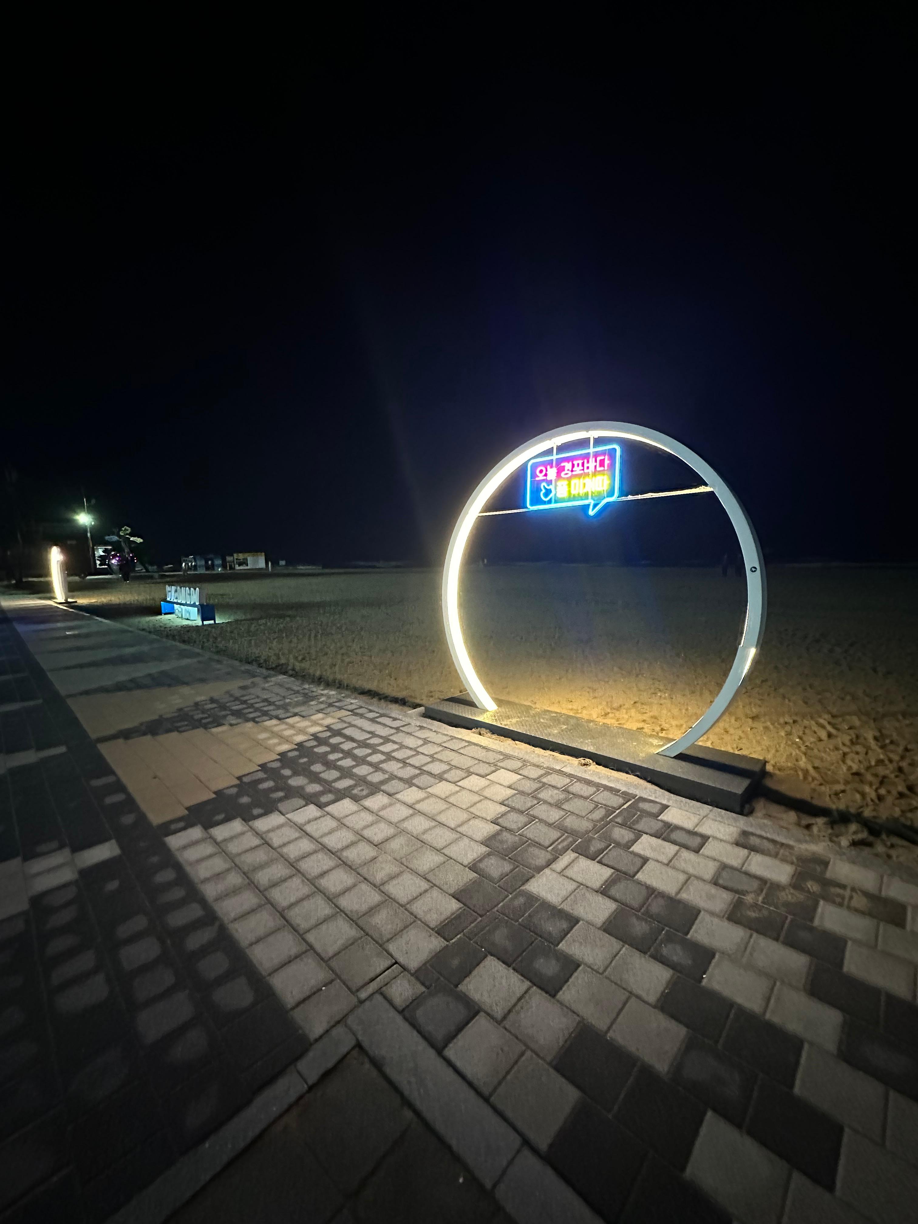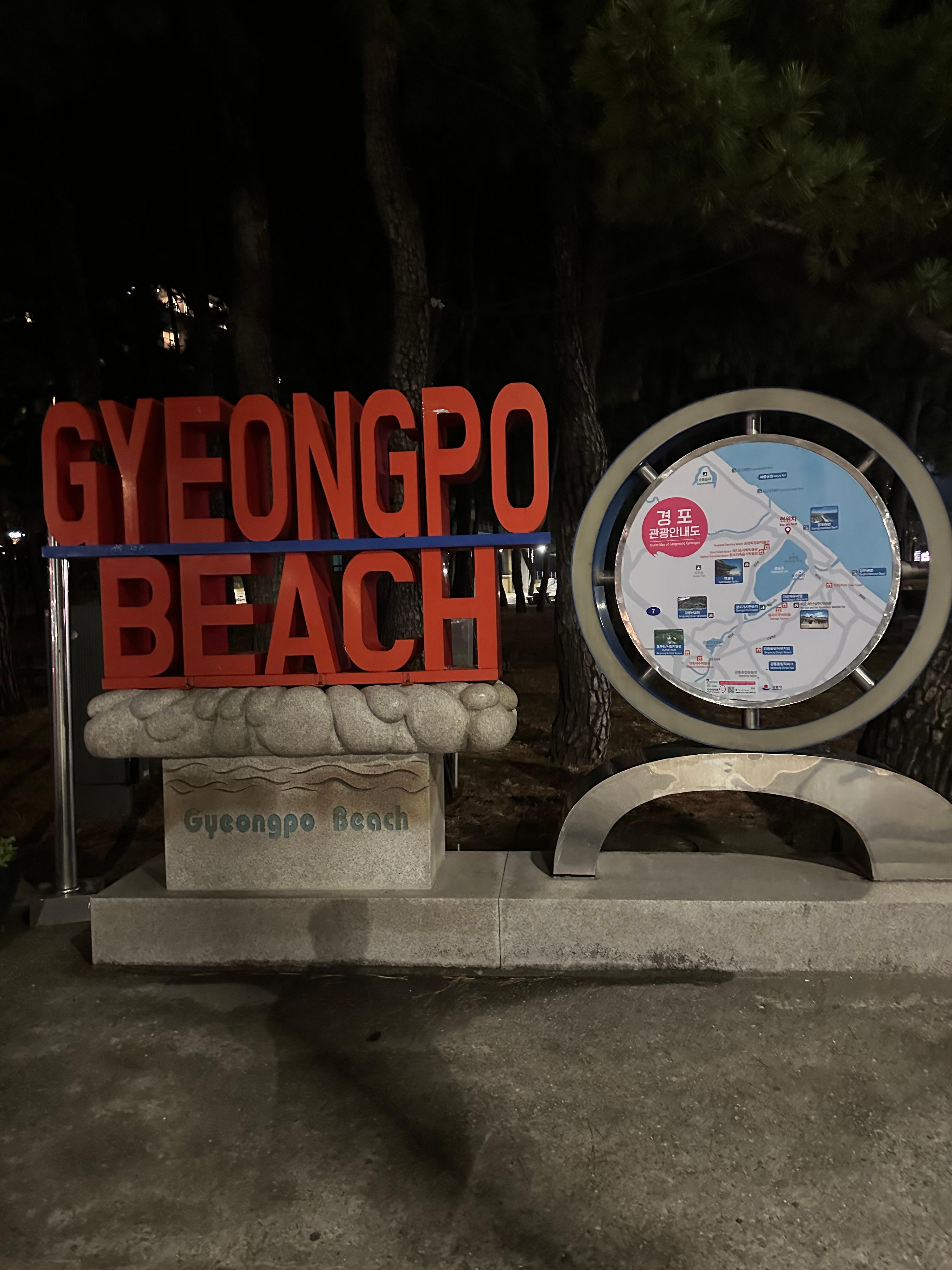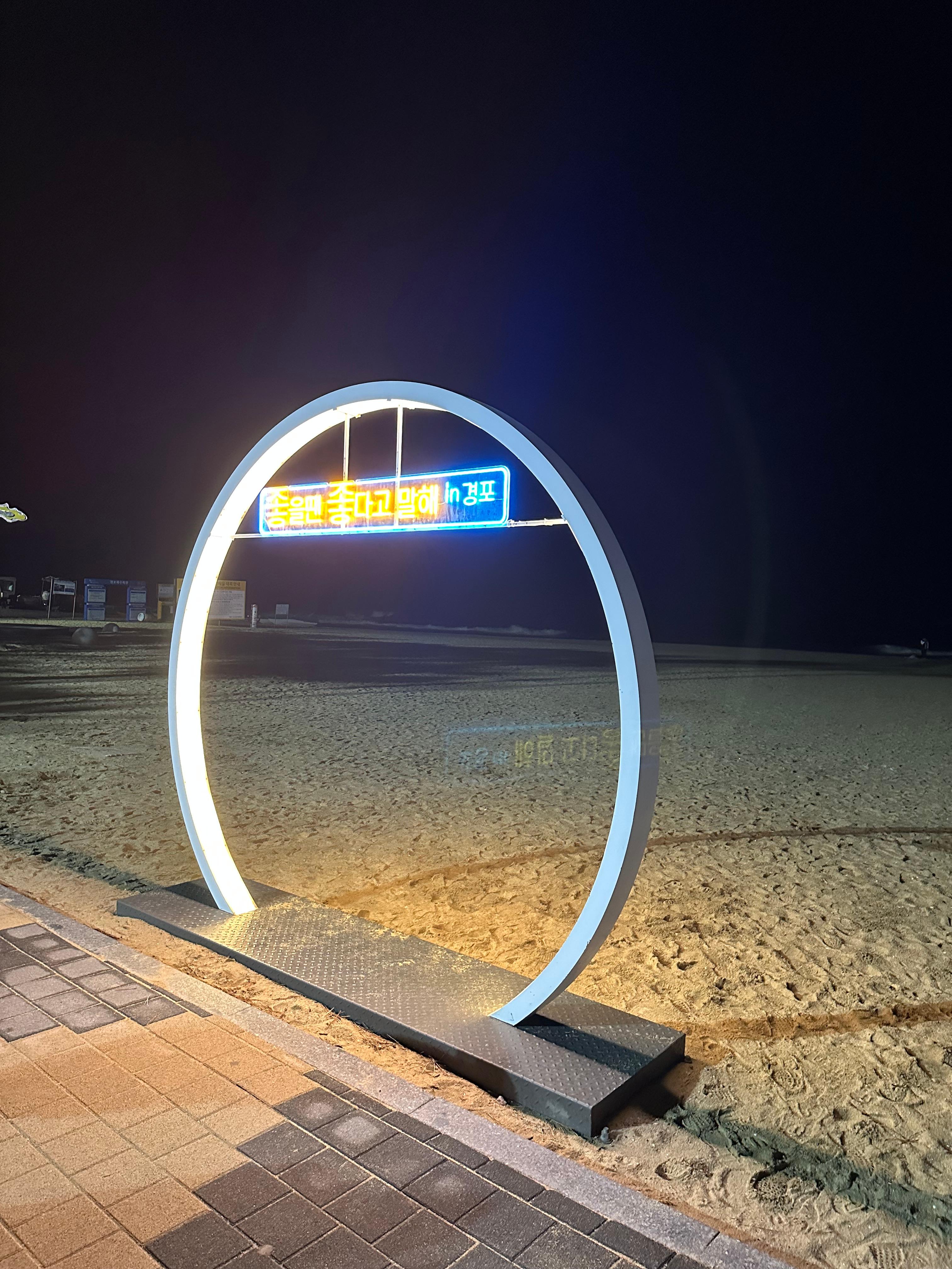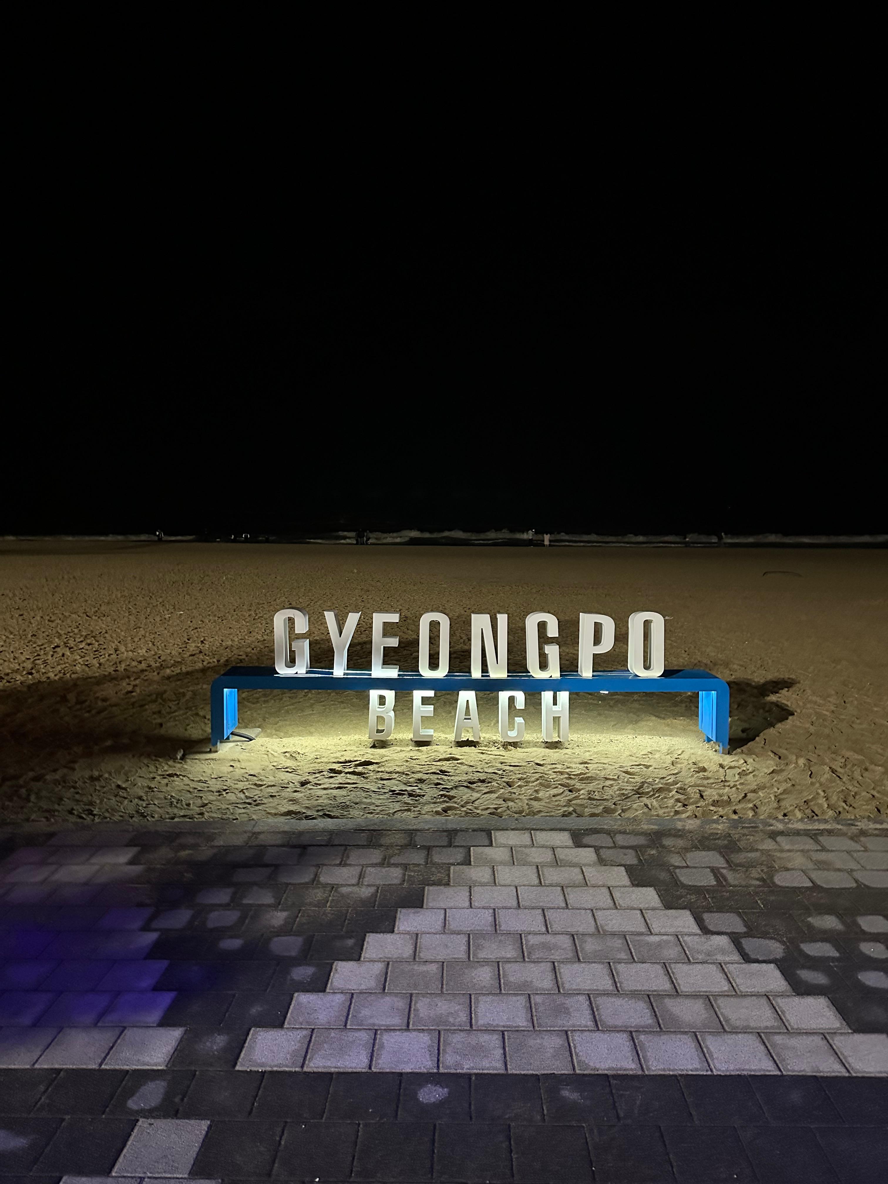 경포해변이라는 영어와 함께 너무 밝지도 않은 잔잔한 조명이 좋았습니다. 아무튼 사진 찍기에는 너무 좋았습니다.잔잔한 조명 때문에 조명 뒤로 경포해변 바다가 보이는 모습이었습니다.