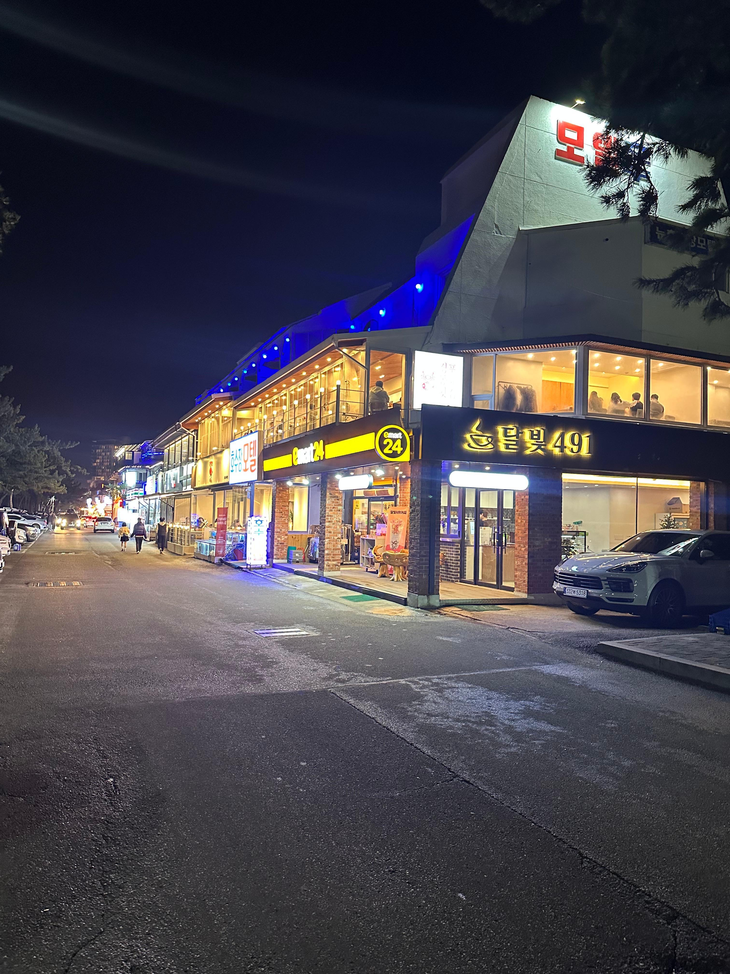 경포해변 중앙광장을 지나서 저는 경포해변의 거리를 걸어봅니다. 어두운 밤이라 바다는 보이지 않지만 네온사인과 함께 경포해변 앞으로는 이렇게 카페와 편의점, 맛집, 횟집의 모습들이 거리에 나열되어있는 것을 볼 수 있습니다. 국내 해변이라고 하면 부산이 대표적인데요. 부산에 비하면 강릉 경포해변과 강문해변은 그렇게 엄청나지는 않았습니다. 어두운 밤바다에 부산만큼 시끄럽진 않아도 조용한 밤바다에 취해 힐링 할 수 있습니다. 부산 해운대와 광안리는 서울처럼 도시 위에 바다이기 때문에 시끄럽다면 강릉 경포해변은 약간 시골느낌이지만 시골같지 않은 바다 거리였습니다.