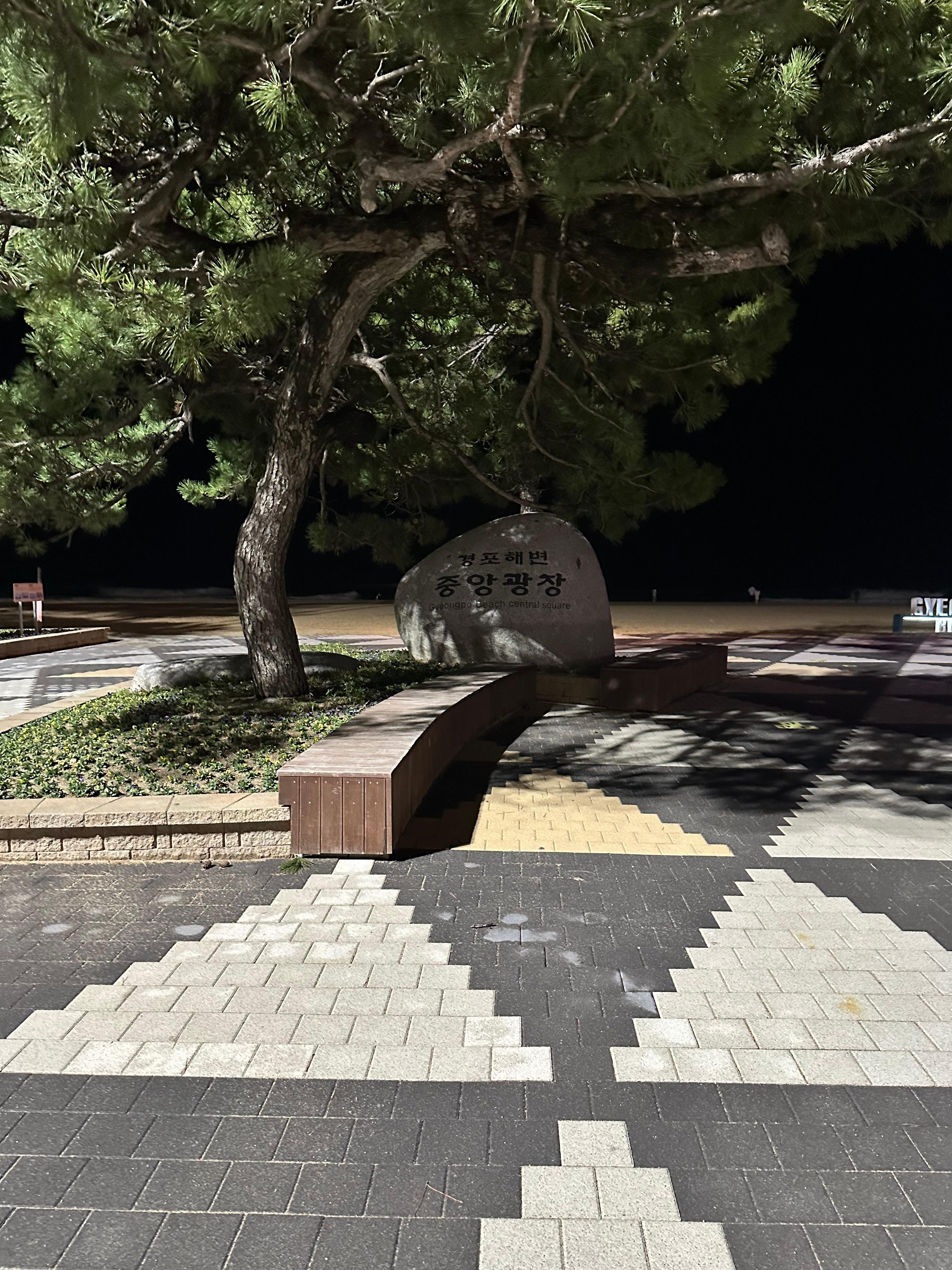 경포해변 중앙광장에는 이렇게 인증샷을 찍을 수 있는 공간이 있었습니다. 다행히 주말이 아니라서 밤거리에 한산하고 조용했습니다. 중앙광장 한가운데는 이렇게 조명이 있어서 사람들이 조명대 앞에서 혼자 혹은 사랑하는 가족, 연인들과 함께 사진 찍는 모습들을 볼 수 있었습니다. 주말이였다면 밤에 폭죽도 터트리고 사진 찍는 사람들도 더 많이 붐비지 않았을까 싶습니다.