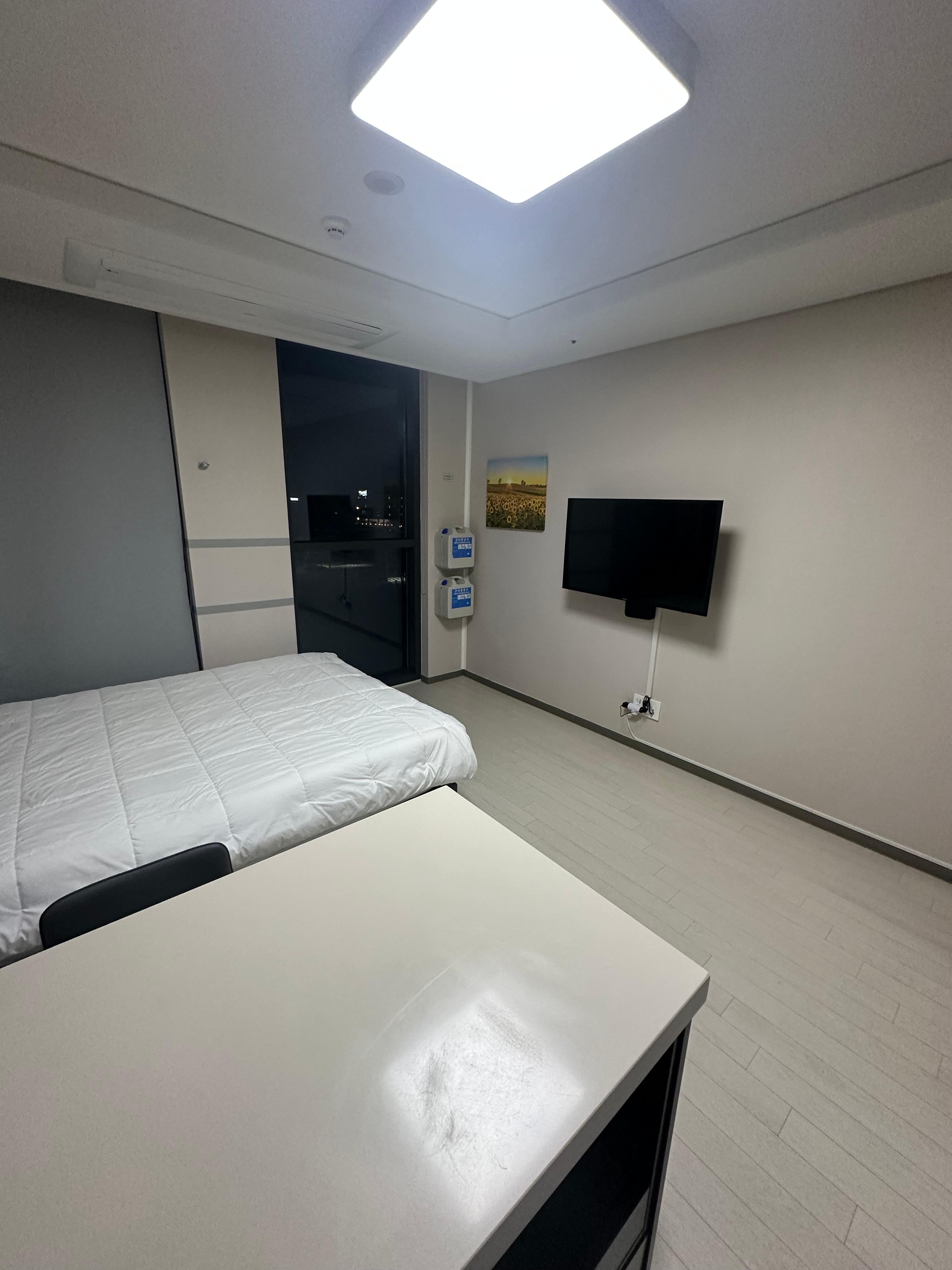 객실로 입실을 하게 되었습니다. 방 구조는 작은 원룸형 구조였습니다. 2명정도 이용하기에 딱 좋았습니다. 침대 하나에 넷플릭스가 지원되는 티비가 있고 거실, 화장실 이렇게 되었습니다. 침대 위에서 두명도 잘 수 있는 구조이다보니까 세명이서 오면 따로 이불을 제공받고 해야할 것 같습니다.