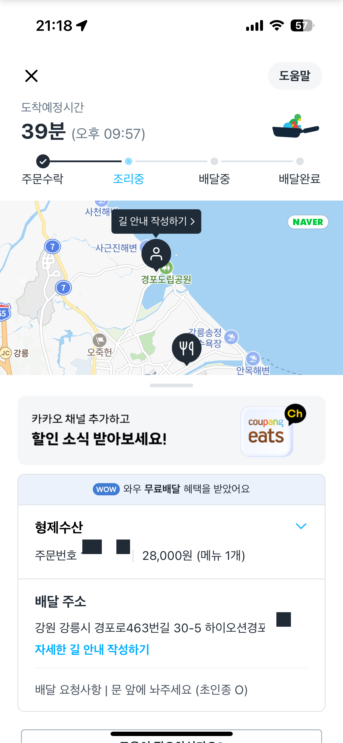 그래도 여행을 왔으니까 아무리 춥고 몸이 좋지 않아도 바로 자는건 너무 아까운것 같습니다. 저는 그래서 쿠팡이츠 앱을 켜서 주변에 무엇을 먹을까 고민을 했는데요. 아무래도 경포해변 바다에 왔으니까 수산물을 먹어야 할것 같았습니다. 그래도 배달 무료로 이용할 수 있는 쿠팡이츠를 쓰고 있어서 유용하게 이용하는 것 같습니다. 안산 반달섬 살면서 2년넘게 살다보니 맛집이나 먹을게 많아서 배달을 잘 안하는데요. 특히 여행와서 쿠팡이츠를 잘 쓰게 됩니다. 안목해변쪽에 형제수산이라고 해서 참숭어(밀치)가 1인 기준으로 28,000원에 주문이 가능하더라구요. 특히 혼자 먹기에는 괜찮은 가겨이라 바로 주문을 하게 되었습니다.