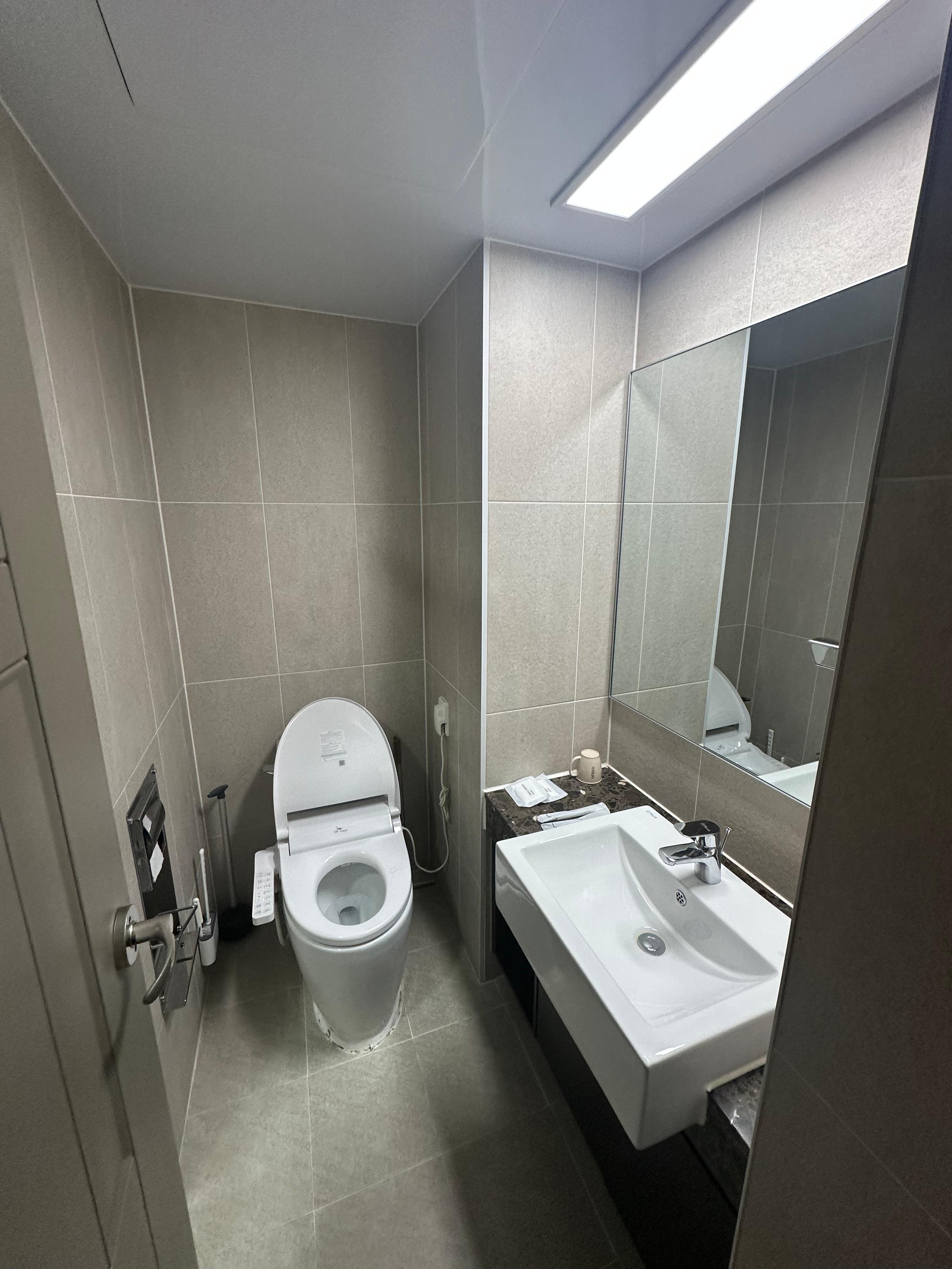화장실은 비교적 넓은 편입니다. 비데까지 설치가 되어있는데요. 거기에 일회용품도 있어서 출장을 오거나 일회용품 놓고온 경우에는 좀 더 편리하게 이용할 수 있었습니다. 기후위기로 왠만한 숙소에서 일회용품이 제공안되지만 제공이 된다면 편리하게 이용할 수 있는 것 같습니다. 하루 조금 머무르는데 치약 칫솔을 나가서 사는것도 일이면서 치약과 칫솔만 사면 다시 집에가면 안쓰는 경우도 있고 또 출장을 오거나 여행오는데 사는것도 아까운 일인것 같습니다.