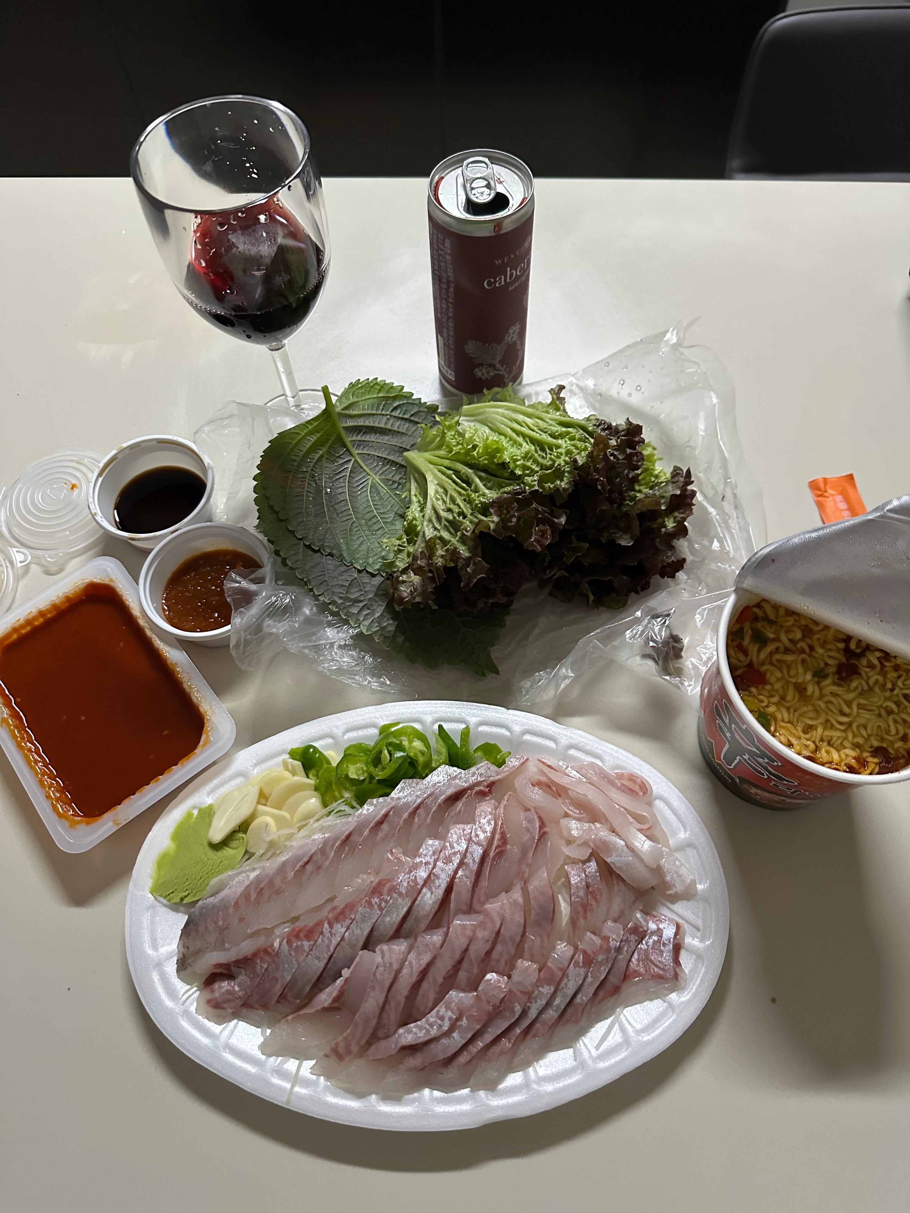 요즘에는 편의점에서 와인도 캔으로도 판매하고 있었습니다. 그래서 편의점에서 와인 캔으로 된거 2명 구매했구 마침 쿠팡이츠 배달이 왔습니다. 그래서 컵라면과 와인 그리고 참숭어(밀치)와 함께 2일차의 힘들었던 하루를 마무리하게 되었습니다. 에어비앤비를 이용하면 가정집처럼 왠만한 주방도구도 다 있구요. 저는 혹시 몰라 와인 캔으로 된것을 구매했지만 와인따개도 제공되는경우도 있고 와인잔도 제공되더라구요. 제가 이용하던 에어비앤비도 와인잔이 제공되서 와인잔에 와인을 담아서 참숭어(밀치)회를 먹으며 넷플릭스를 보며 그렇게 하루를 마무리하게되었습니다.