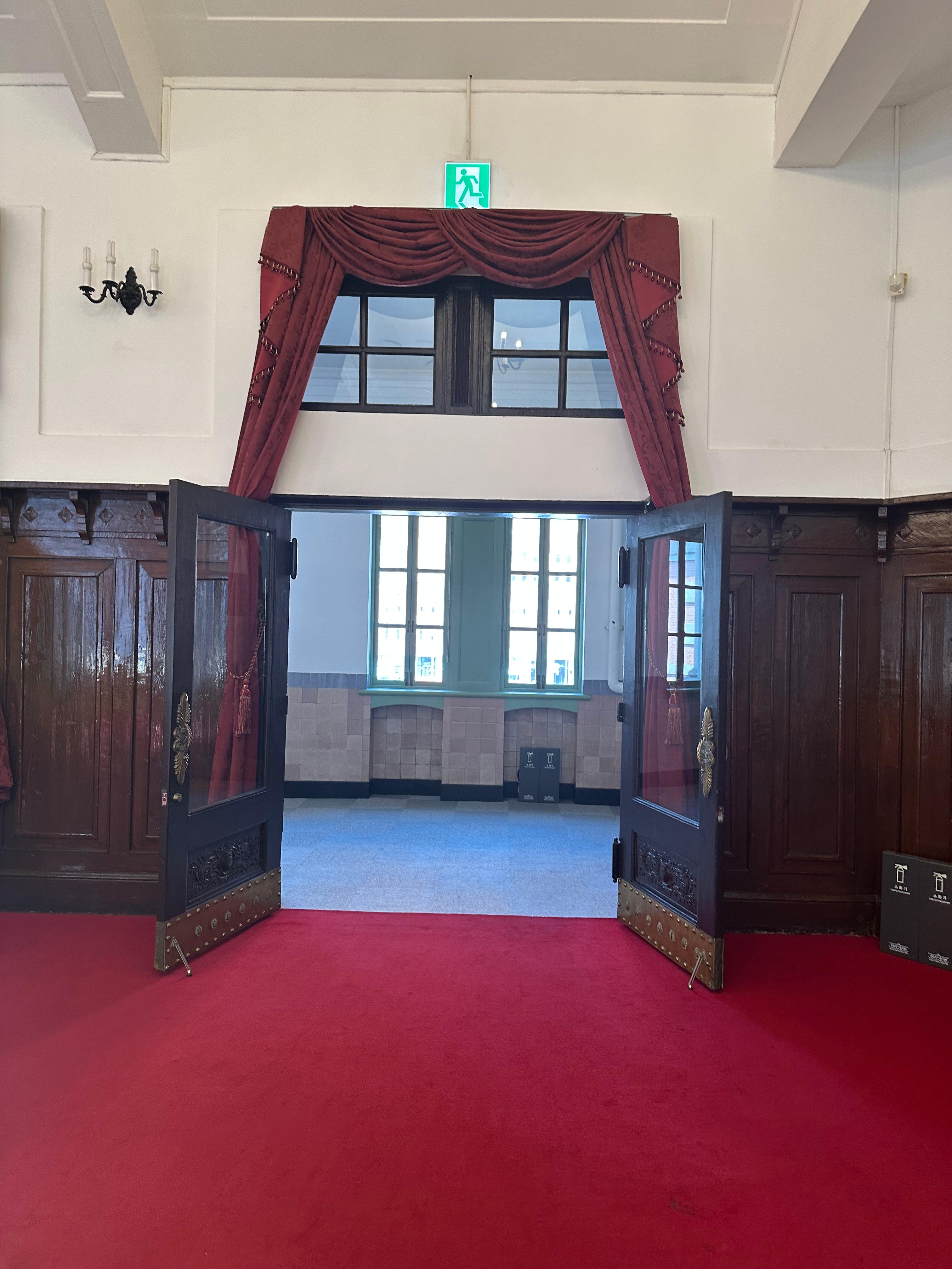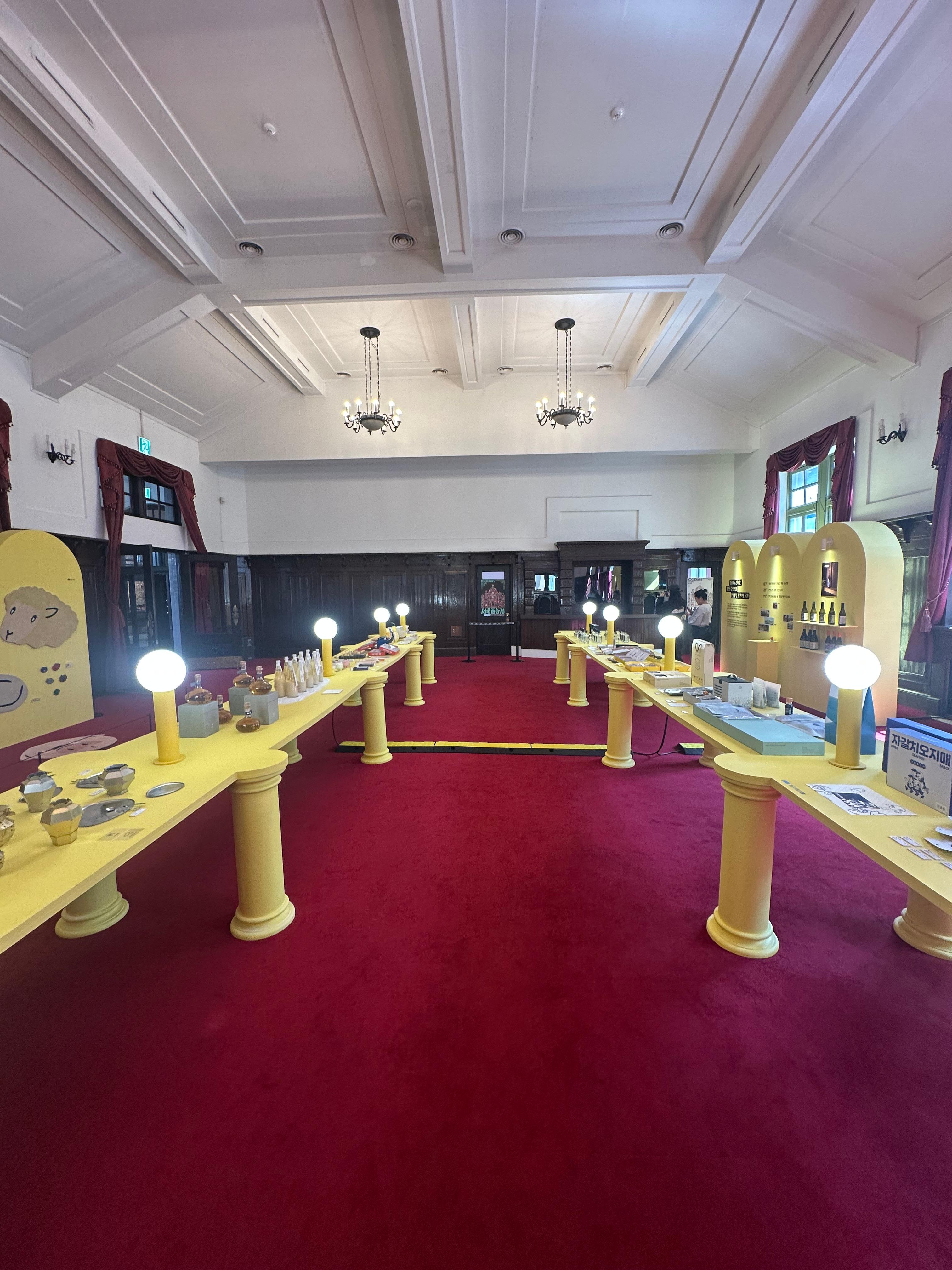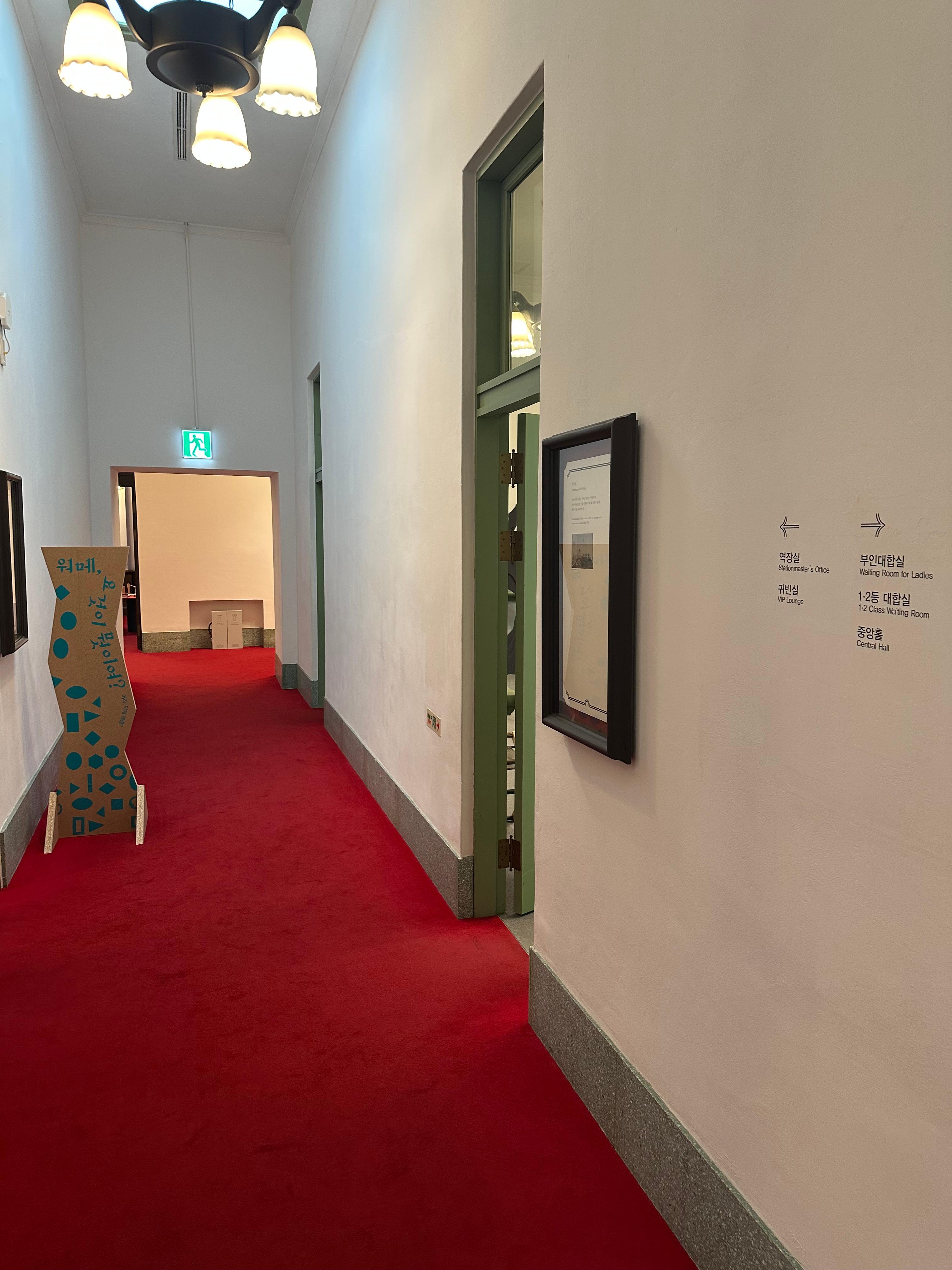 문화서울역284 구 서울역 2층으로 올라와서 벽면에 구 서울역사 복원전시실과 소식당과 그릴, 회의실 방향 안내를 볼 수 있었는데요. 구 서울역사 복원전시실 반대편에는 과거 소식당 공간에 전시공간이 있었습니다. 빨간 레드카페는 전시회를 위해서 깔아놓은 것으로 보여집니다. 다.