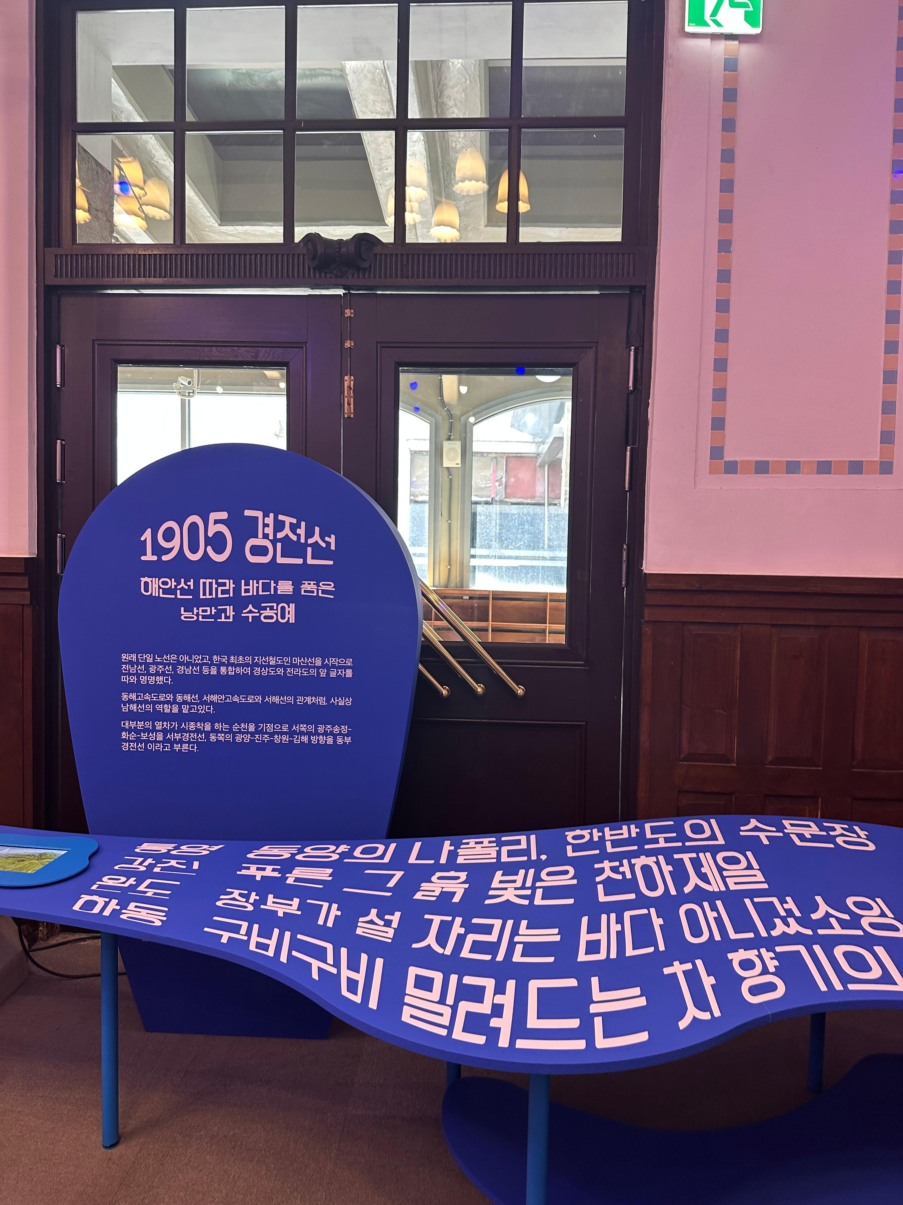 부산으로 가는 고속열차를 타기 위해 남는 시간 기다리면서 1층 전시관붜 구경했는데요. 1층에는 이렇게 당시 우리나라의 철도 노선의 시대적 배경을 볼 수 있는 전시관있었습니다. 저는 특히 1905년 경전선과 1922년 장항선이 기억에 남아서 사진에 담아봤는데요. 해당 철도 노선의 분위기와 지역 이야기에 대해서 가볍게 볼 수 있는 전시회였습니다.