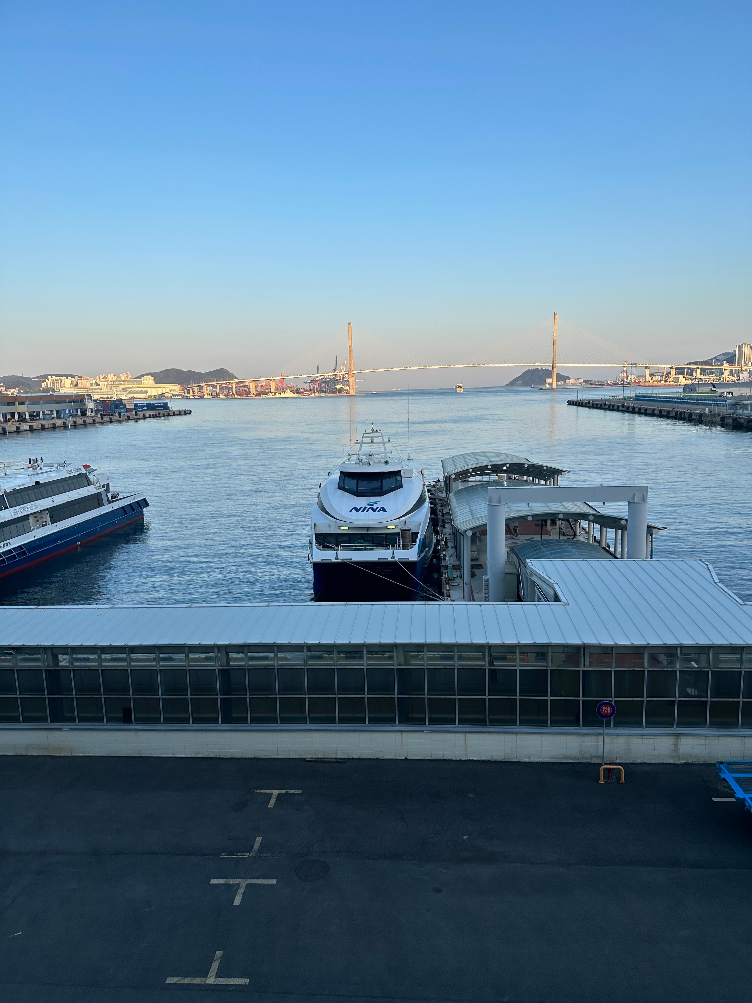 부산항국제여객터미널에서 니나호라는 배가 대마도로 가는 배라고 하는데요. 부산항 기준으로 대마도까지는 대략 1시간에서 2시간 정도 걸린다고 해요. 정말 일본이 가깝다고 느껴질만한 짧은 시간인데요. 실제로 유튜브 보는데 부산에서 대마도까지 당일치기 하는 유튜버들도 많을정도로 가깝습니다. 요즘에는 고속열차도 있기 때문에 서울에서 새벽 기차 타고 부산역에서 내려서 부산항에서 대마도까지 서울에서 대마도까지 당일칙리 여행객들도 있을만큼 대마도는 가깝습니다. 가까운 만큼 큰배는 아니고 작은 배가 운행을 하고 있습니다. 배가 작다보니 특히 대한해협이라는 곳을 지날 때 배멀미 승객이 늘어나고 있다고 합니다. 부산항 역시 비행기처럼 외국을 나가기 때문에 여권과 함께 수속절차를 밟는다고 합니다. 2층 대합실 옆에는 이렇게 전망대가 있어서 멀리 부산항대교와 함께 출항 준비중인 배의 모습을 볼 수 있습니다.