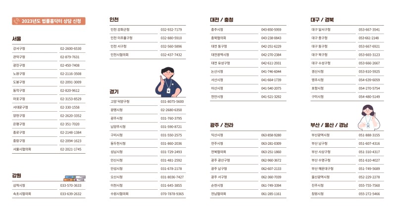 2023년도 법률홈닥터 상담기관 연락처입니다. 전국적으로 운영하는 것 같습니다. 주요 운영기관은 해당 지자체 시청에서 진행하고 있습니다. 신청자분들이 사는 지역이나 혹은 인근 지자체를 통해서 하시면 됩니다.