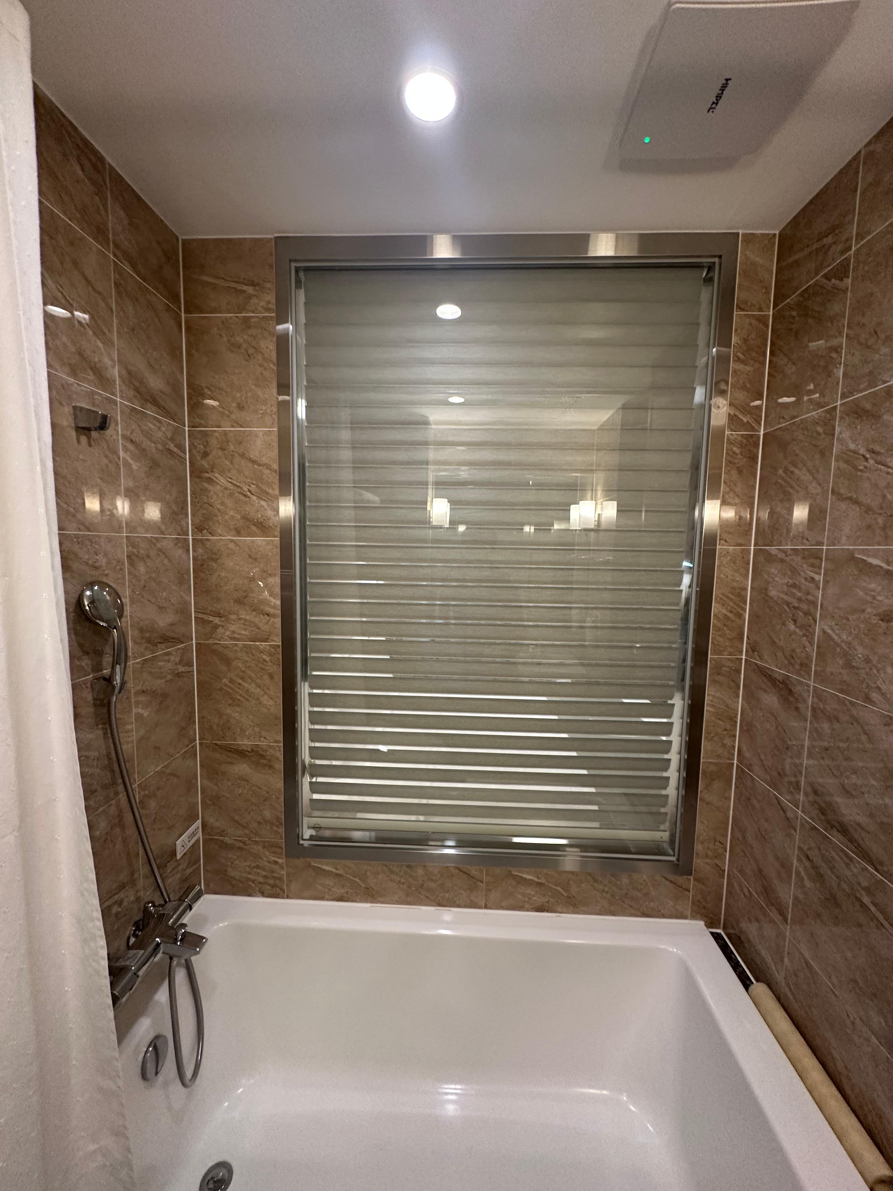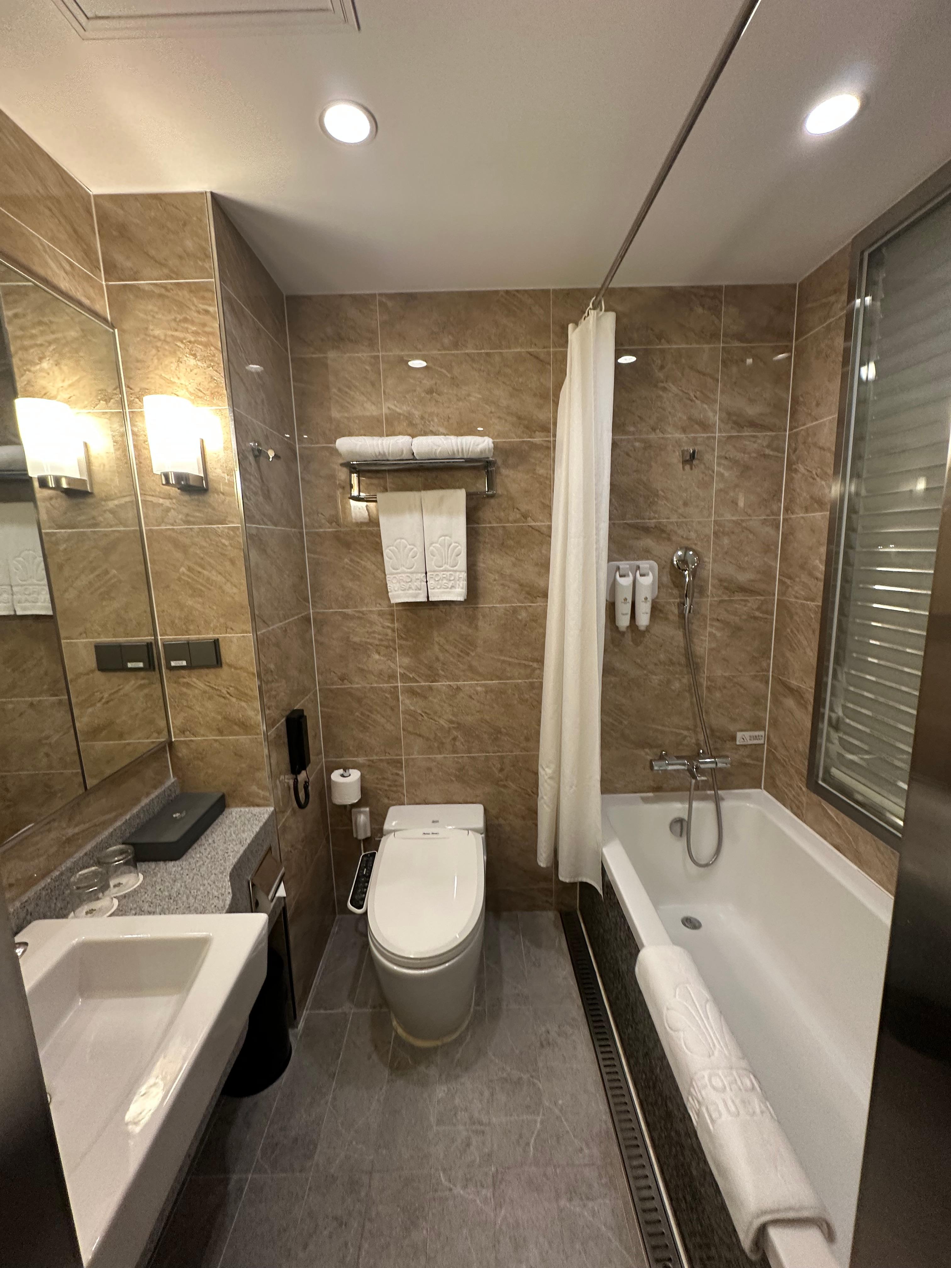 이제 객실에서 이어서 화장실과 욕조를 보겠습니다. 스탠포드호텔 부산의 경우 다른 호텔 숙소와는 다르게 욕조가 있었는데요. 그래서 욕조 안에서 샤워를 하면서 욕조에 따뜻한 물을 받아놓고 반신욕도 할 수 있었습니다. 변기는 비데가 설치가 되어있어서 좀 더 쾌적하게 이용할 수 있었습니다. 샤워 욕조 앞으로는 객실이 바로 보이도록 창문이 설치된 구조였는데요. 혼자라면 상관없지만 2인이 온다면 아무래도 보일수있기 때문에 방안쪽에서 블라인드를 내려서 이용할 수 있습니다.