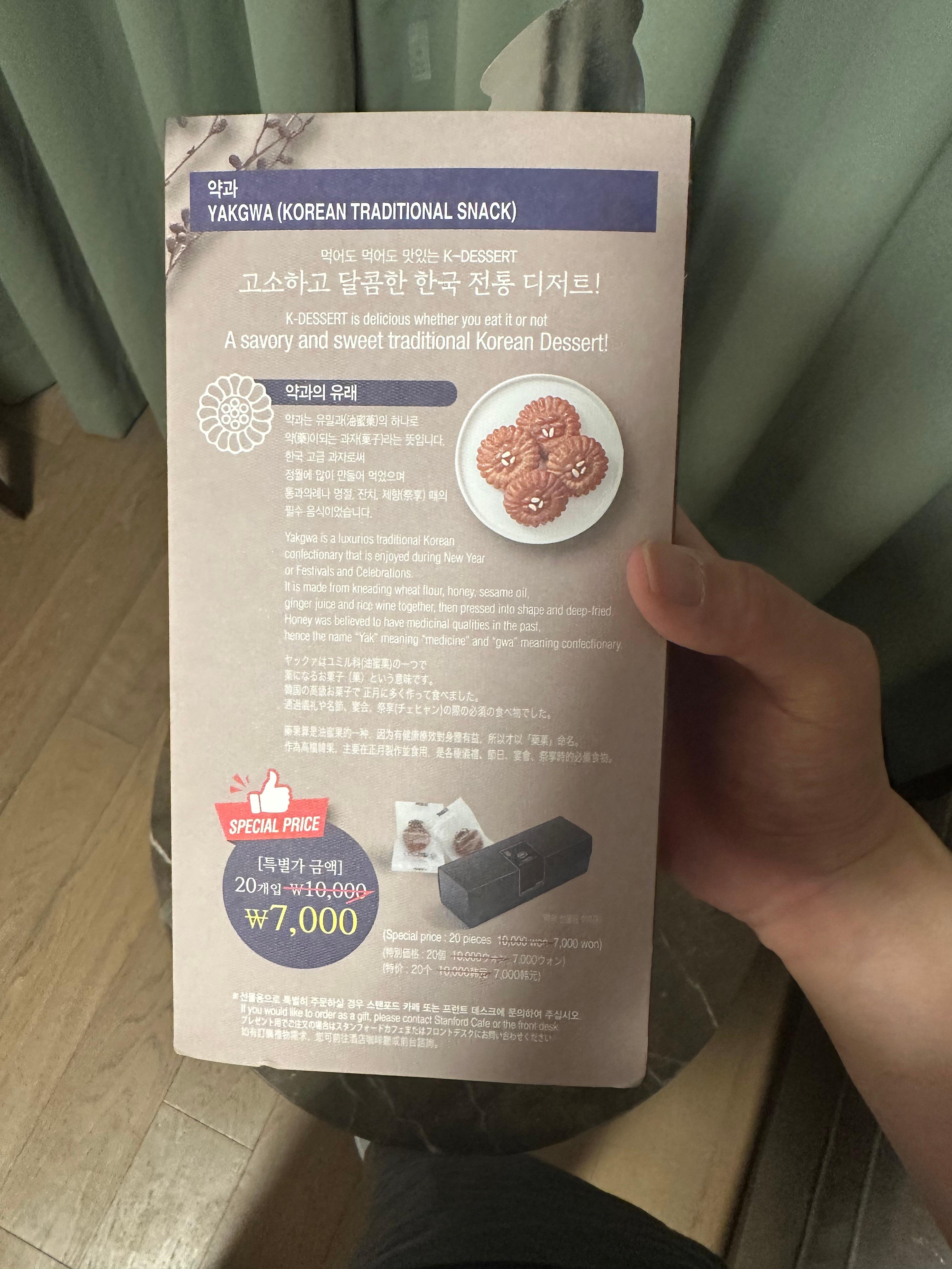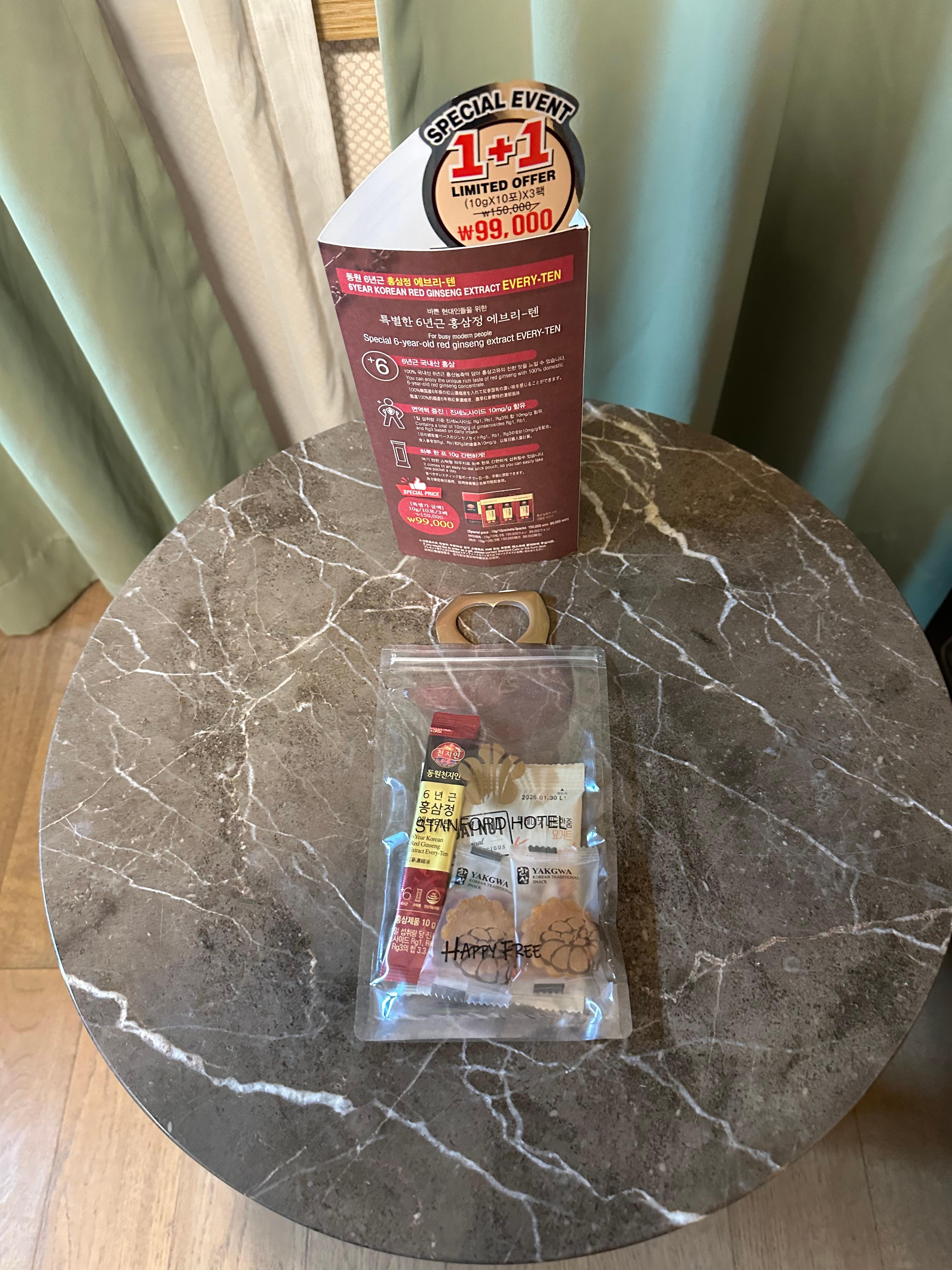 몇년전에도 그랬지만 스탠포드호텔 객실에 들어올 때면 작은 선물이라고 할까요 광고라고 할까요 이렇게 정성스러운 간식이 있었습니다. 이번에도 객실 들어오니까 한국 전통의 디저트인 약과 조그만것과 6년근 홍삼정 에브리텐이 들어있었습니다. 배불러서 바로 먹지는 않았지만 체크아웃 하면서 가방에 챙겨서 갔었구요. 집으로 돌아가는날 배고파서 맛있게 먹었습니다. 아무래도 판매용이긴하지만 호텔을 이용하는 투수객들에게 샘플로 먹어볼 수 있도록 하면서 구매를 하는 것 같습니다. 어떻게 보면 광고라고 할 수 있지만 구매를 하든 안하던 손님들을 친절도가 느껴지는 숙소 호텔이였습니다.