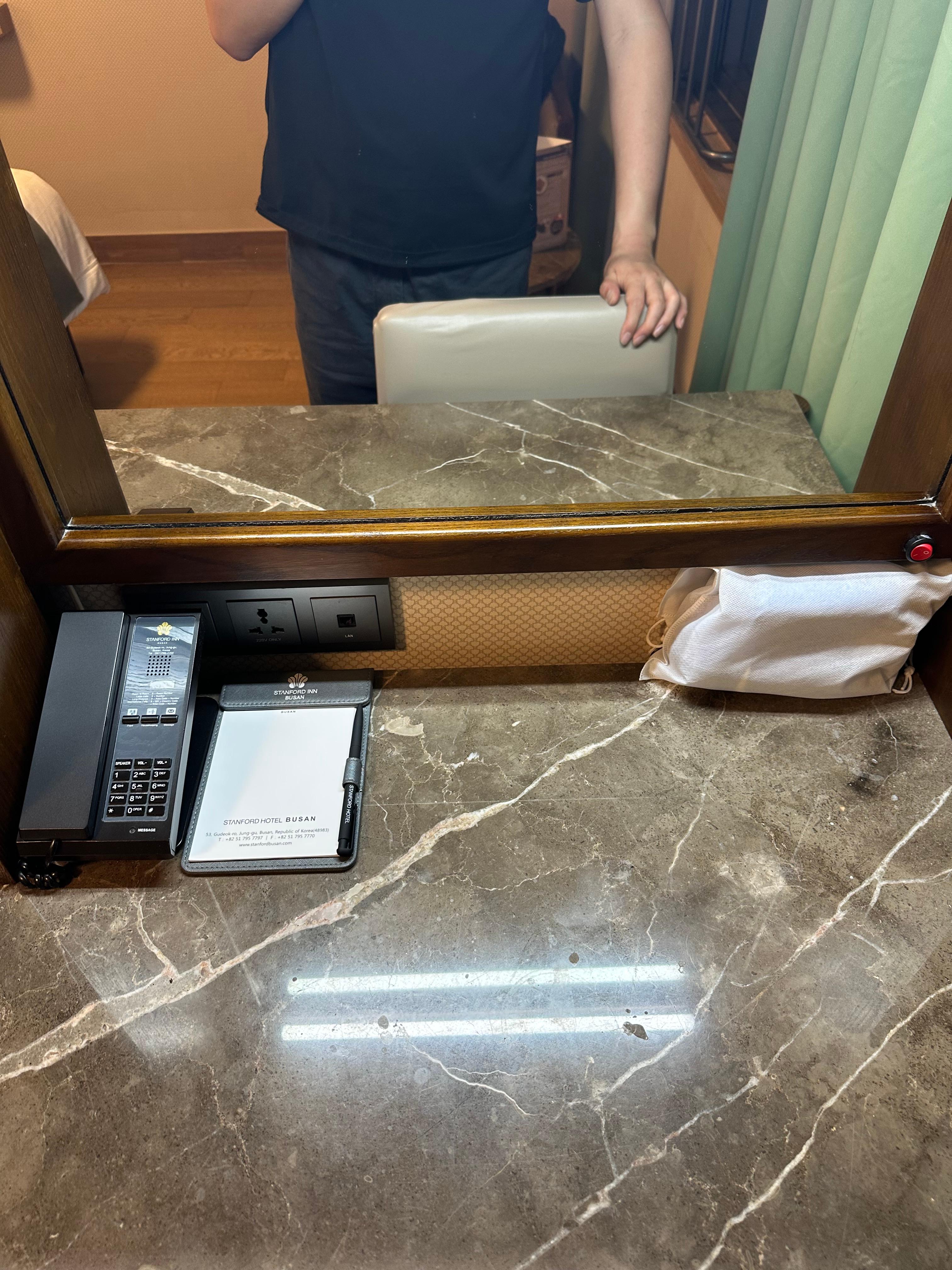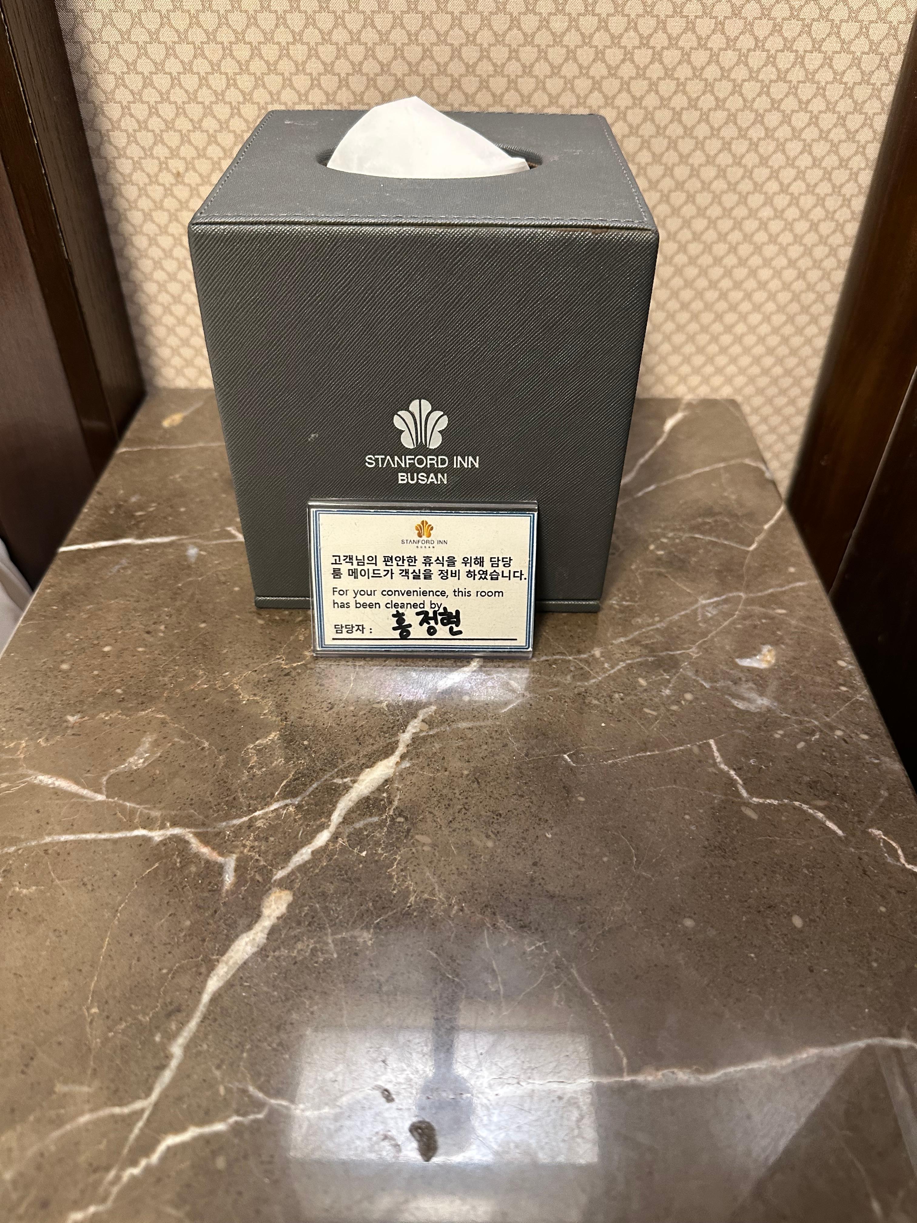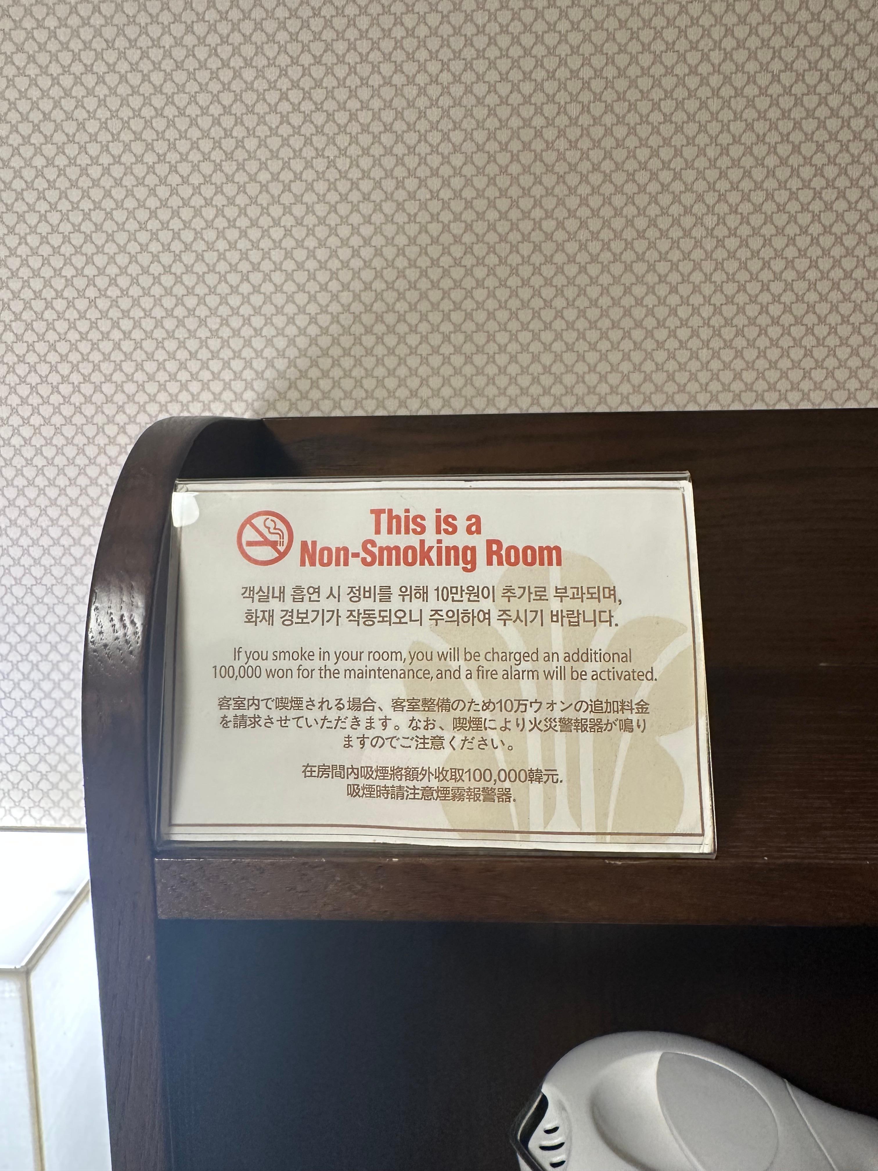 한가지 더 친절도가 느껴지는 부분은 바로 호텔 침대와 화장대 사이에 있는 탁자 위에 배치된 물건이었는데요. 각 객실마다 이렇게 청소를 진행했던 담당자 이름이 적혀있는 명함이라고 할까요. 이 부분이 처음 왔을때부터 가장 마음에 들었습니다. 보통 호텔은 누가 청소했는지 이름까진 없지만 그만큼 자신의 실명을 공개하면서 손님들을 위한 마음과 친절이 그대로 묻어나오는 것 같습니다. 이런부분도 마케팅 아닐가 싶습니다. 또한 당연히 안되는 거지만 스탠포드호텔 객실에서 흡연시 흡연시에는 10만원이 추가 보가 되며 화재경보기까지 작동한다니까 흡연자분들은 주의하시면 좋을 것 같습니다. 외국인들이 많이오는 곳이다보니 일본어, 중국어, 영어까지 안내가 되는 것을 볼 수 있었습니다.