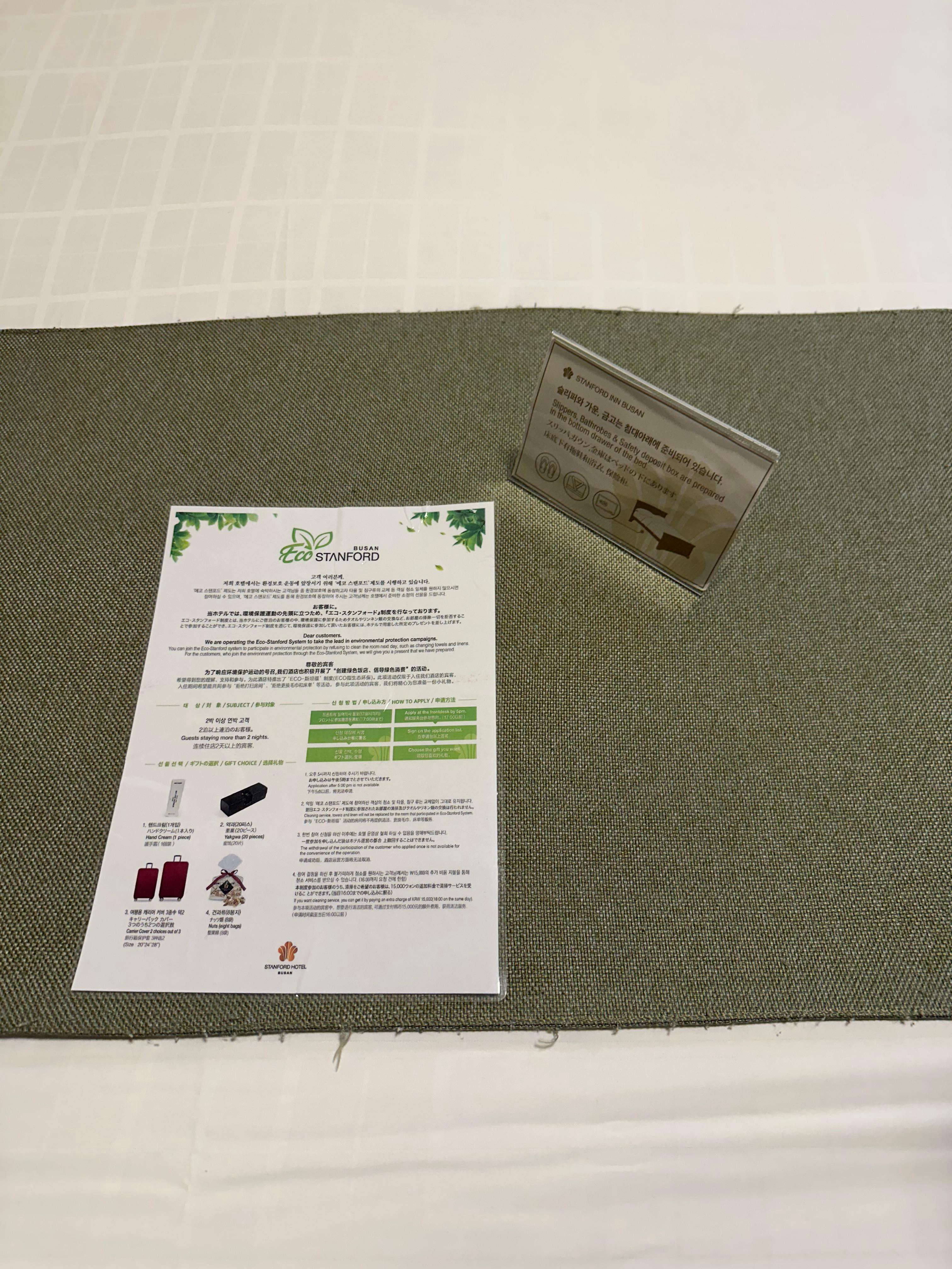 - "에코 스탠포드" 제도를 동참하시는 분들은 호텔에서 준비한 소정의 선물을 드린다고 합니다.