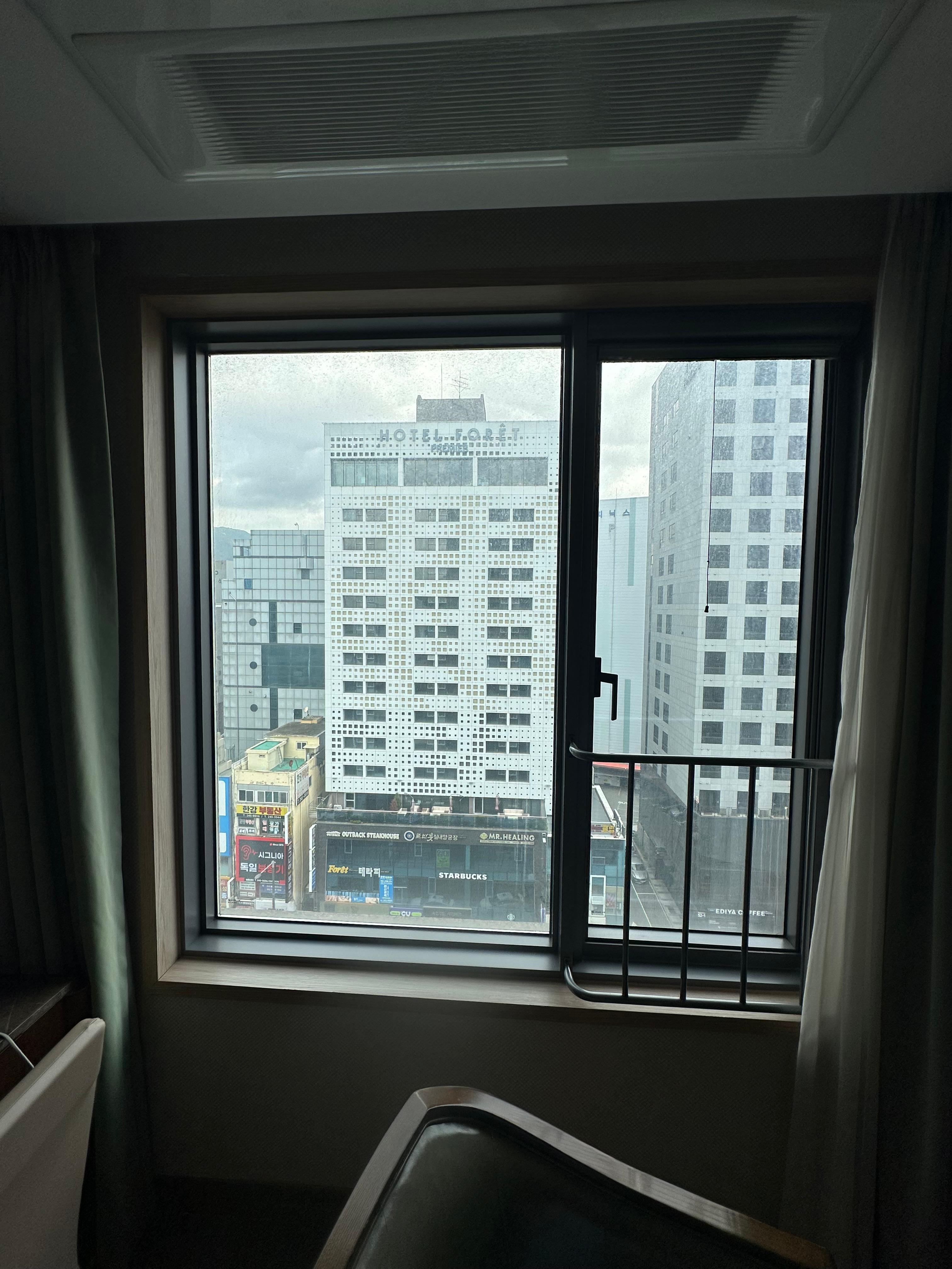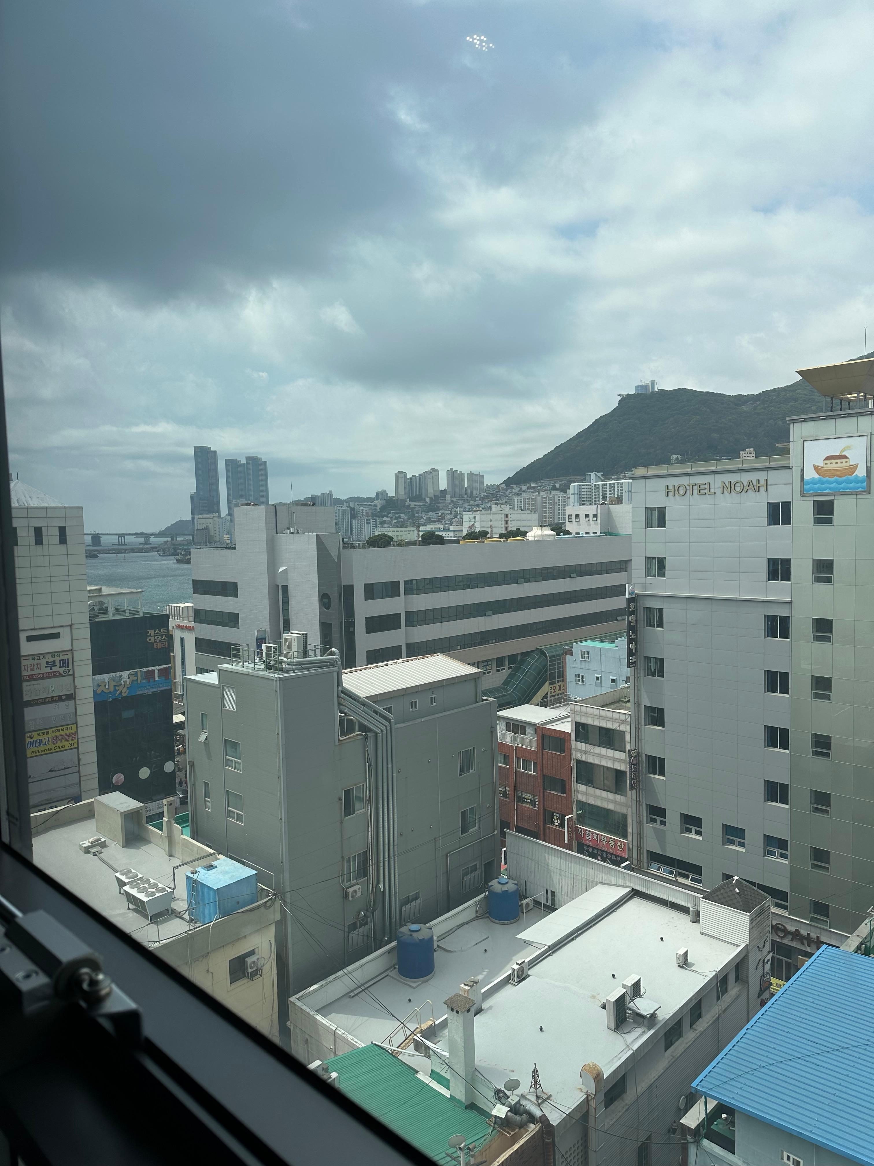 따라서 블라인드를 너무 열어두면 좋지 않고 개인적인 볼일 볼 때는 가리는게 좋을 것 같습니다. 그 외에 블라인드 열고 용두산공원과 남포동 도시의 뷰를 볼 수 있는 점에서 너무 좋았습니다. 그와 함께 창문 옆에는 작은 원형탁자와 의자 두개가 있어서 혼자 혹은 2인이 왔을 경우 아름다운 남포동의 도시뷰를 보며 음식을 먹거나 애기를 나눌 수 도 있었습니다.