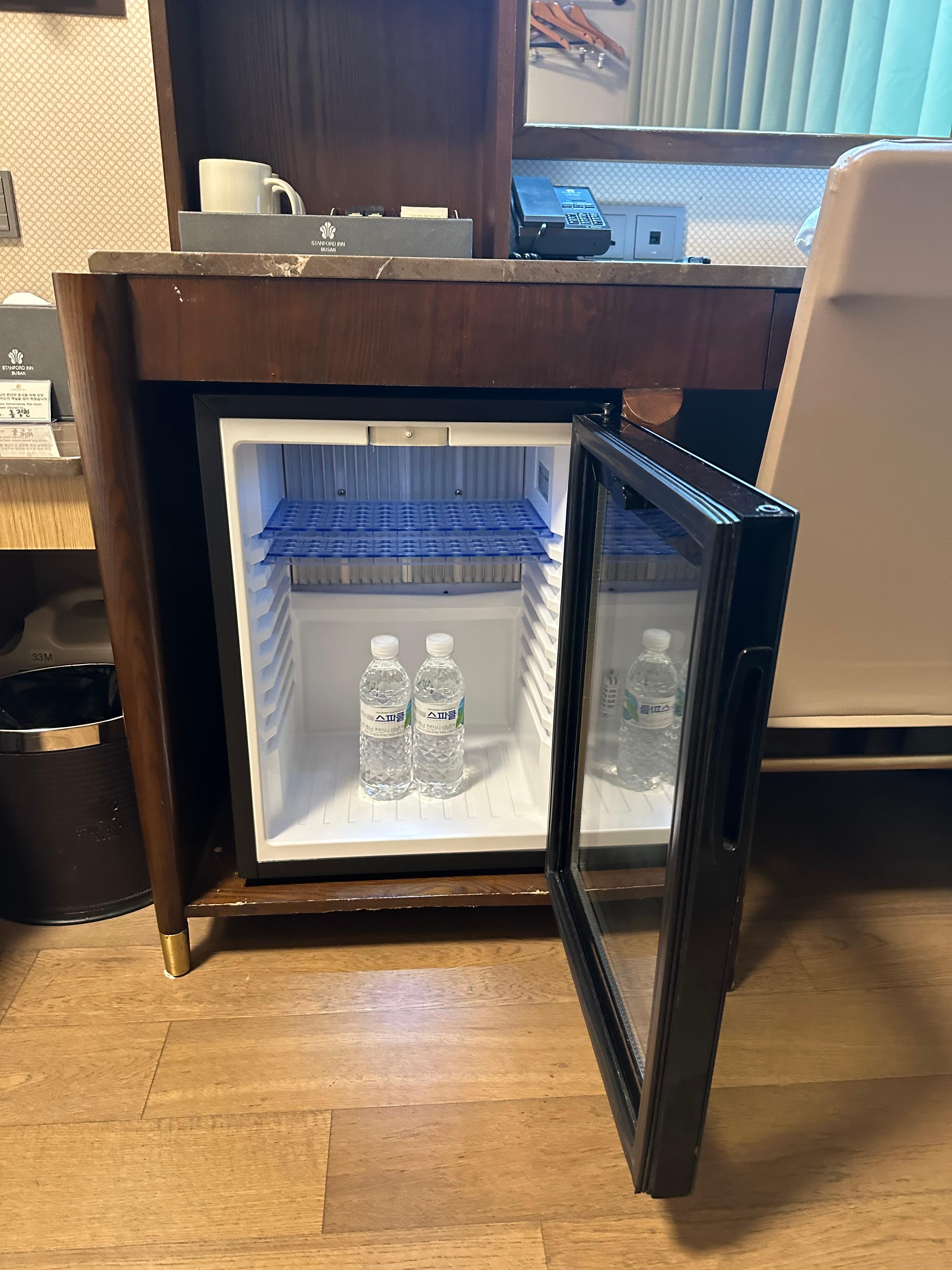 냉장고도 다른 호텔과는 다르게 내부가 보이는 유리로 구성되어있는 냉장고였습니다. 기본적으로 생수가 제공되고 있었습니다. 에어비앤비와 다르게 호텔은 생수는 제공이 됩니다. 최근에는 에어비앤비를 이용하는데요. 아무래도 개인이 운영하는 곳이고 호텔보다는 서비스면에서는 조그 떨어질수 있는데요. 생수조차 넣지않는곳이 있더라구요.