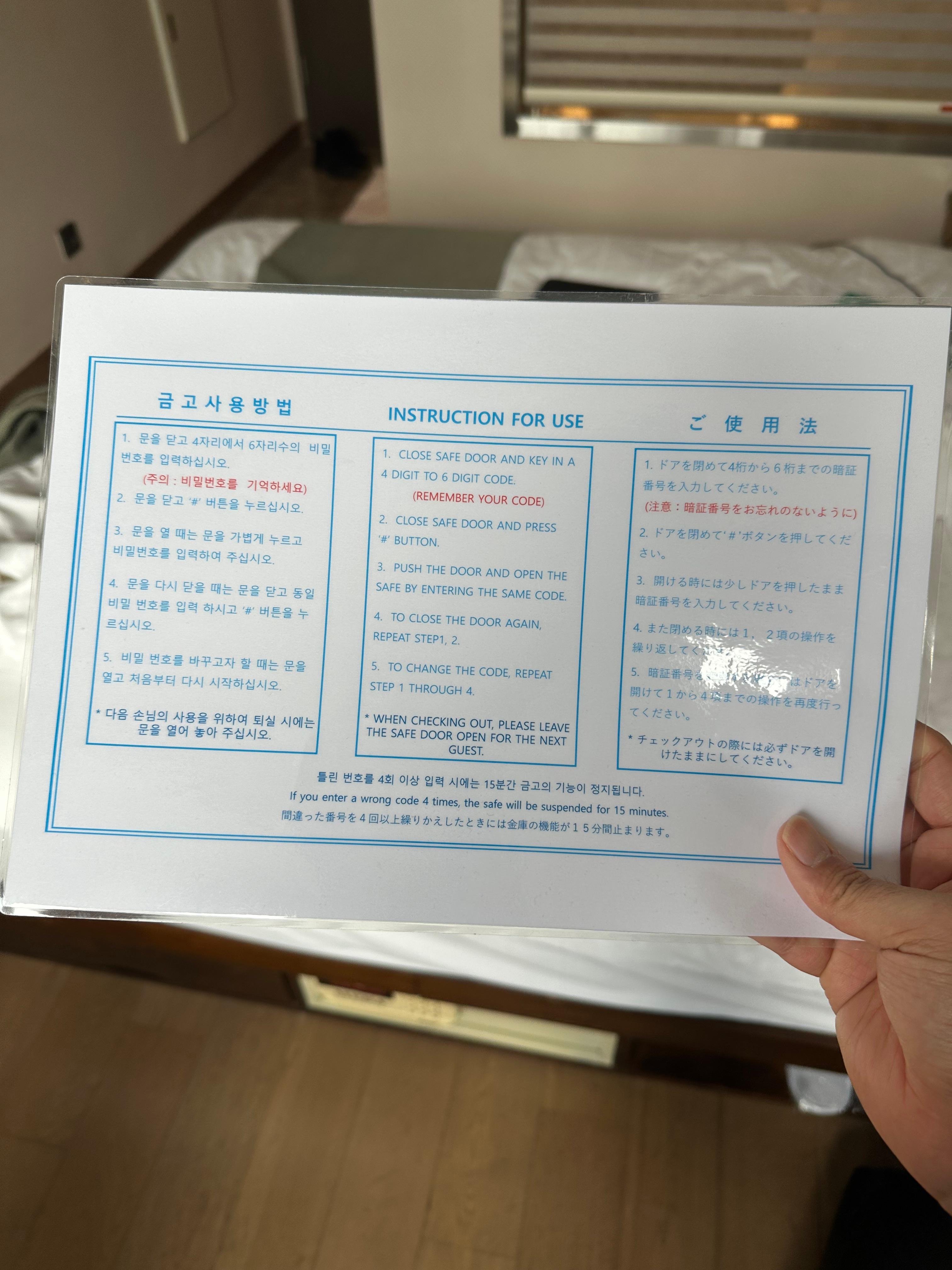 하지만 무엇보다 손님을 오게 만드는 것은 친절 아닐까 싶은데요. 생수 뿐만 아니라 스탠포드 호텔 객실에는 침대 아래쪽으로 금고도 있었는데요. 정말 중요한 물품은 금고 통해서 보관할 수 있습니다. 금고 사용방법도 배치가 되어있어서 잘 읽어보면 금방 따라 할 수 있습니다. 하지만 제대로 안볼 경우 설정을 잘못하게 되는데 그때는 방안에 배치된 전화기로 프론트 연결해서 문의하시면 될 것 같습니다.