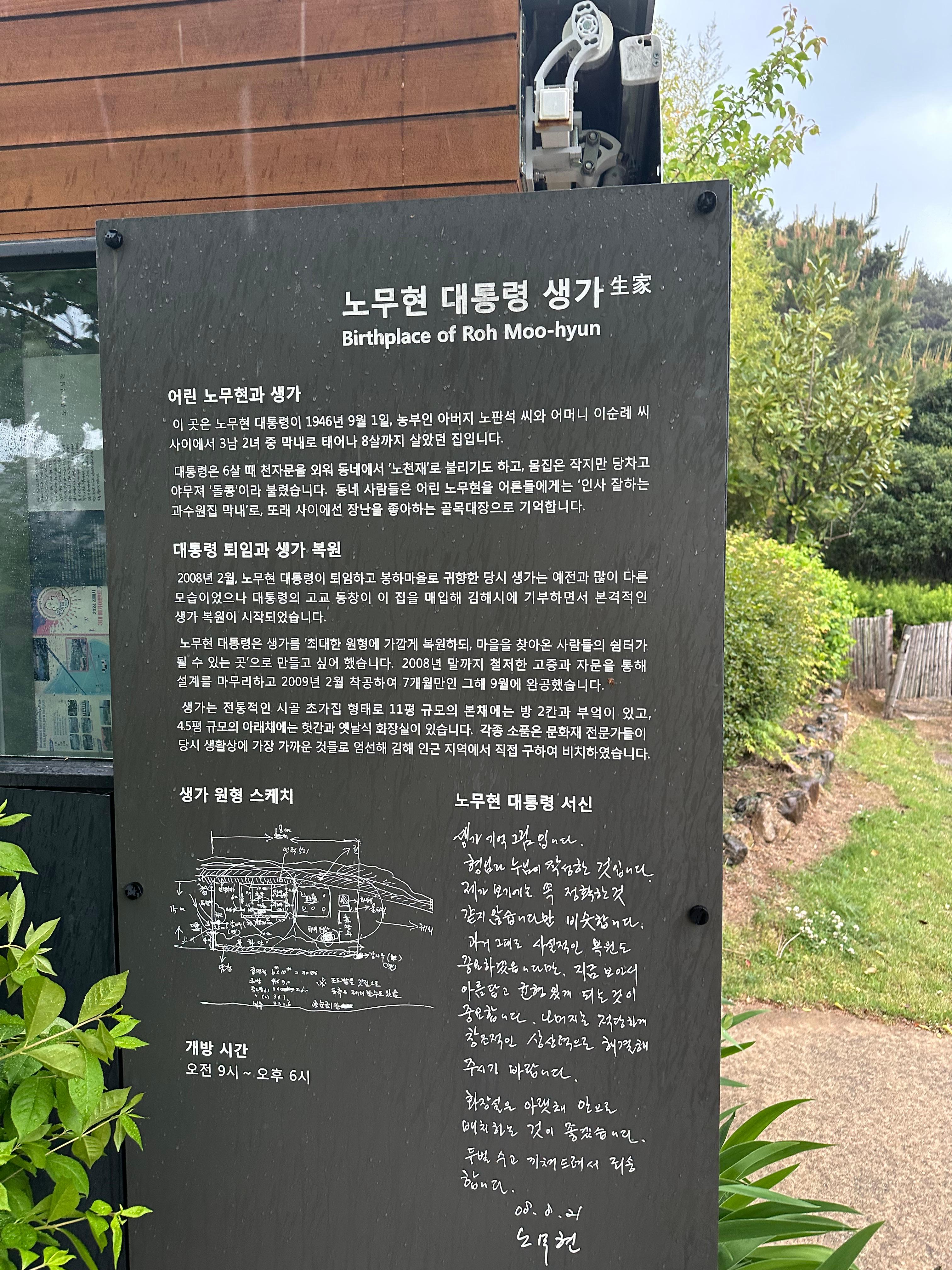노무현대통령의 생가 앞에는 생가의 복원과정과 함께 어린 노무현 대통령의 성장과정에 대한 안내를 볼 수 있었습니다. 그리고 생가 원형 스케치와 함께 대통령의 서신을 볼 수 있었습니다. 노무현 대통령은 6살때부터 천자문을 다 외워 동네에서 노천재로 불렀다고 합니다. 몸집은 작고 야무져서 돌콩이라고도 불러졌다고 해요. 노무현 대통령 생가는 원래는 예전과는 많이 달라졌다고 했다고 합니다. 그러나 노무현 대통령의 고교 동창 친구가 그 집을 매입하여 김해시에 기부하면서 생가가 기부되었다고 해요. 이후 대통령 사저 포스팅도 하겠지만 대통령 사저에서 설명듣는데 노무현 대통령의 생가가 복원이 되는 것은 좋은 친구분 덕분에 복원이 되었다고 합니다.