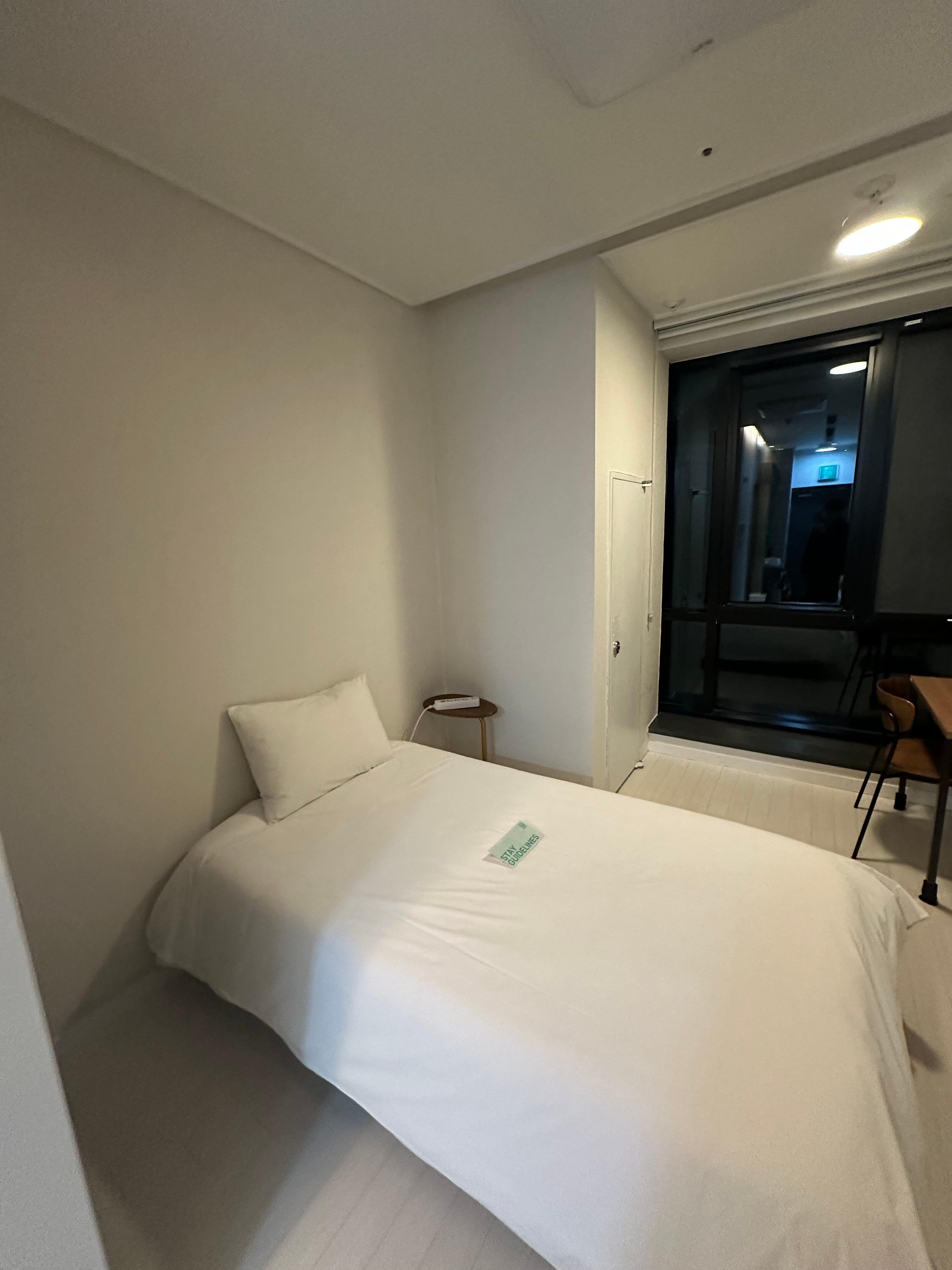 혼자서 이용하기에 좋은 방 크기였는데요. 그렇다보니 약간 좁을 수 있지만 혼자 들어오면 정말 혼자 이용하기에 좋았습니다. 침대도 혼자 이용할 수 있도록 베개 하나였습니다. 식탁도 있었는데 의자도 딱 하나만 있었습니다. 어두운 밤이라 보이지는 않았지만 블라인드 내리고 아늑한 불빛과 함께 넷플릭스와 야식먹으면서 지내기에 좋았습니다. 실제로 체크인하면서 방 둘러보고 나서는 씻고 편의점에서 간단하게 맥주와 과자 먹으며 넷플릭스 보며 2일차 하루를 마무리하게 되었습니다.