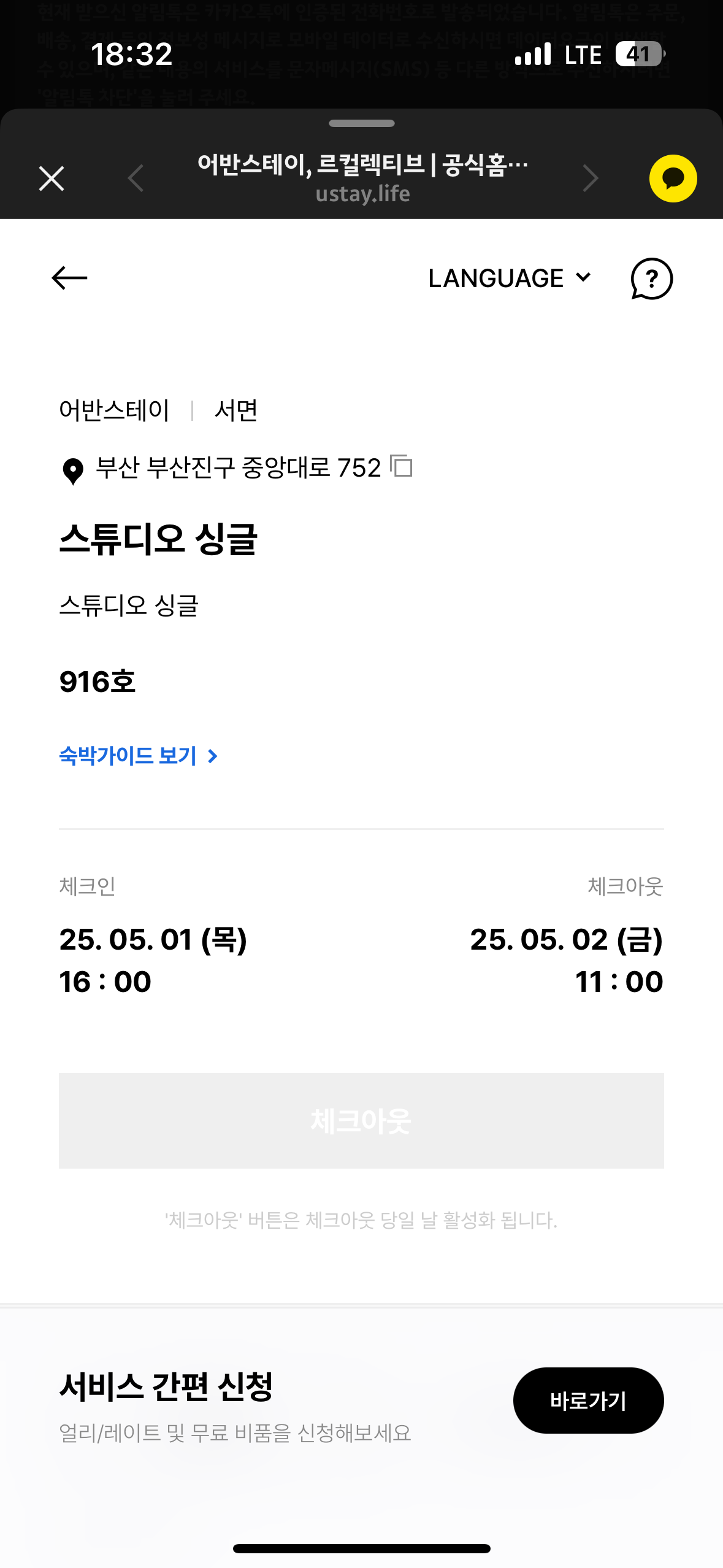 저는 5월 2일 금요일에 어반스테이 서면점을 예약했습니다. 어반스테이 서면점은 비대면 입실이라 이렇게 카카오톡으로 안내를 받습니다. 요즘은 대부분 비대면이라서 카카오톡 아니더라도 에어비앤비 채팅을 통해 안내를 하는 경우가 대부분입니다. 간혹 호스트가 직접 객실 안내하는 경우도 있습니다. 그래도 어반스테이 서면점은 다른 에어비앤비와는 다르게 채팅앱도 함께 하지만 카카오톡으로 좀 더 쉽게 체크인과 체크아웃을 안내할 수 있도록 알림톡을 보내주고 있었습니다.